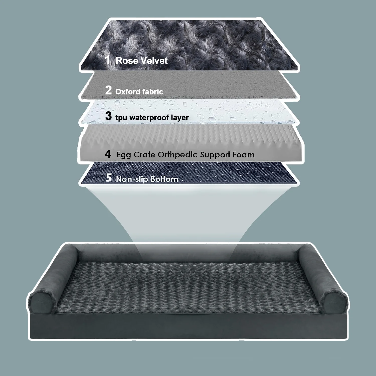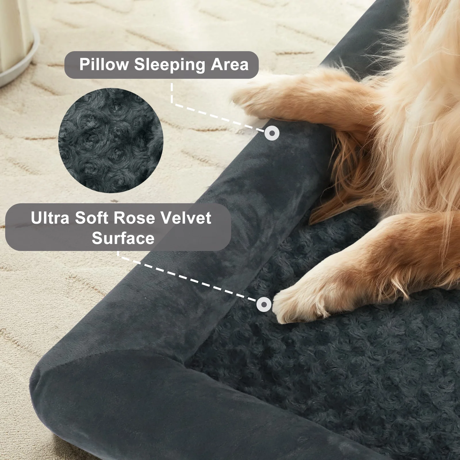 COMFORTABLE ORTHOPEDIC SUPPORT High-density egg crate foam orthopedic dog bed evenly supports your fur baby’s muscles and joints, helps distribute weight, comforts your dogs with strong support to bony and joint areas, pressure relief, relieves joint pain, body aches and arthritis. This dog bed is especially suitable for puppies and older dogs. They will love a day in the extra large dog bed. COZY ROSE PATTERN PLUSH SURFACE & WATERPROOF LINING The sleeping area of the large size dog bed is made of 3-layer fabric. The outer rose velvet surface is soft and skin-friendly, provides a calming and anti-anxiety feel, allowing pets to fall into a deep sleep faster and gentle on the pet’s nose and paw. The middle TPU waterproof layer prevents liquid from penetrating, will not absorb urine, water, saliva, vomit or any other liquid, keeps your dog in a clean and hygienic environment. The inner knit fabric lining is durable enough for long time use. SOFA DOG BED DESIGN The washable large dog bed is designed with U-shaped. 3 side pillow provide extra support for your pet’s neck and head, allowing your furry friend to rest better in the dog bed. The fence-like design makes the puppy feel more secure lying in it. MACHINE WASHABLE & EASY DISASSEMBLE Thanks to the removable cover and bolsters, as well as the durable L-shaped zipper, you can easily disassemble the bed without worrying about damaging it. Our dog couch can be washed by machine and maintain stretchability after times wash. The upgraded fabric and reinforced stitches ensure the cover remains as good as new after multiple washes.