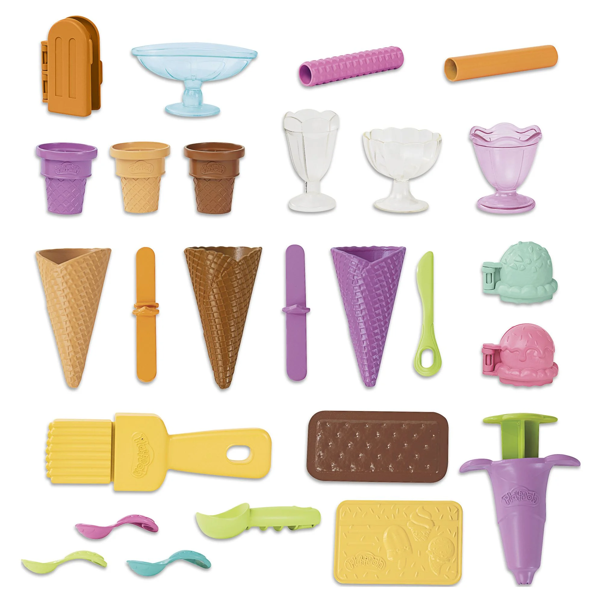Spark creativity with Play-Doh sets for girls and boys! Turn your play space into the ultimate Play-Doh ice cream truck party with the Play-Doh Kitchen Creations Ultimate Ice Cream Truck! This life size kitchen set for kids gives a big space to express their big imaginations. Create so many pretend treats with the 27 tools and soft-serve station, customize the creations with the Play-Doh sprinkle maker, tools, and kids play food candy molds, and ring up customers at the register. Fun music and cash register sounds make kids feel like they’re running their own ice cream truck! This kids kitchen play set includes 12 cans of Play-Doh modeling compound that give them all the colors they need to get started. This toy food truck for kids was also designed with parents in mind with lots of storage and easy ways to clean up when the fun is done for the day! Play-Doh toys like this Play-Doh Kitchen playset make great gifts for girls and boys! Fantastic preschool toys for 3 year old girls & boys! Hasbro, Play-Doh, and all related properties are trademarks of Hasbro. Includes ice cream truck playset, 2 ice cream scoop molds, ice cream sandwich mold, 4 dishes, 6 cones, ice pop mold, 2 ice pop sticks, credit card mold, 2 rollers, scoop, decorating tool, knife, 3 spoons, cleaning brush, empty can, and 12 cans of Play-Doh Brand Modeling Compound (net weight 28 oz/794 g). Ages 3 years and up Requires 2 AA batteries (not included). WARNING: Product must be assembled by an adult. Keep small parts necessary for assembly out of children’s reach. Not intended to be eaten. Notice to Parents: Contains Wheat. Non-Toxic. Conforms to: ASTM D-4236. Molded results vary depending on child’s age and level of skill. Adult assembly required. Product and colors will vary.