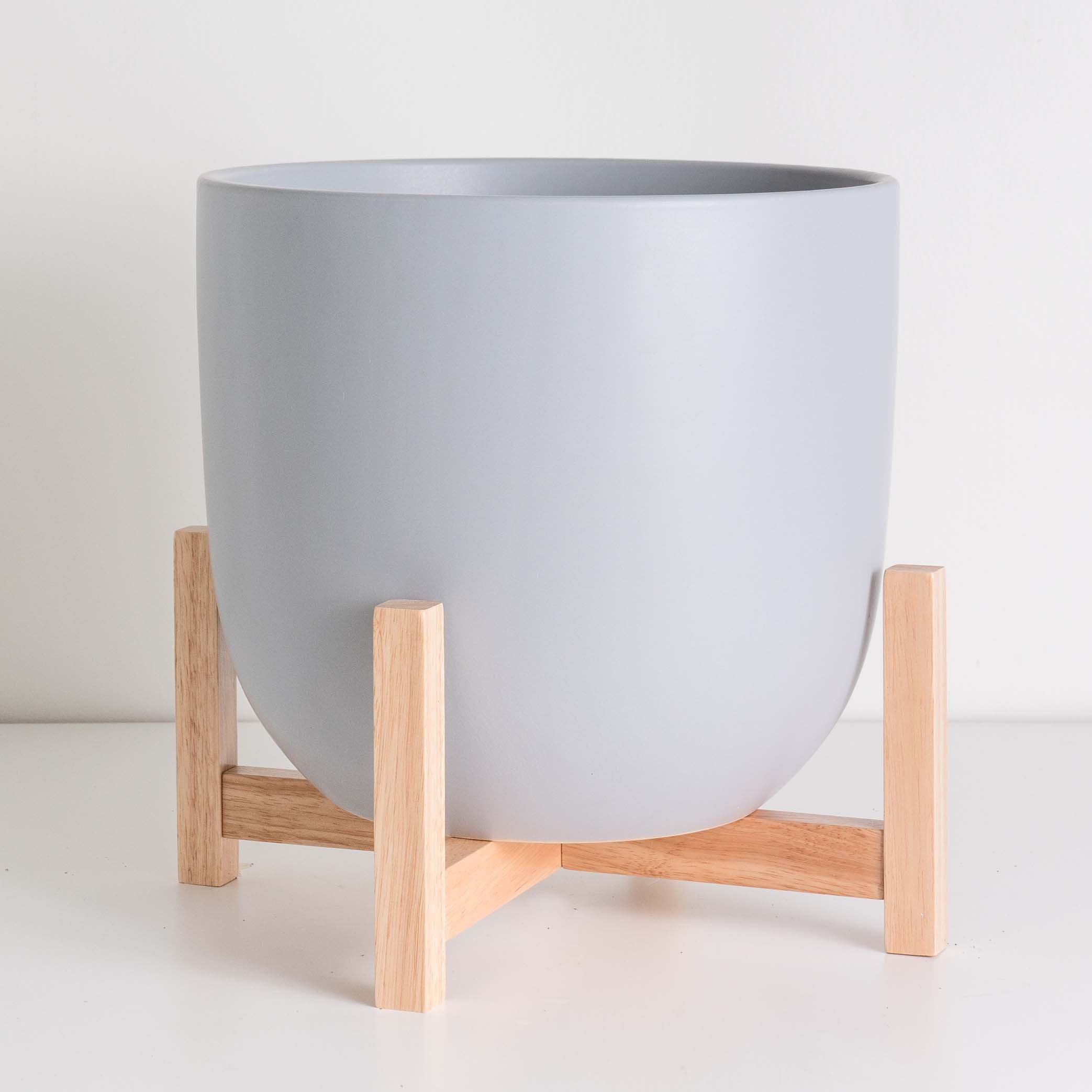 Peach & Pebble 10″ Grey Egg Shaped Planter + Natural Wood Stand