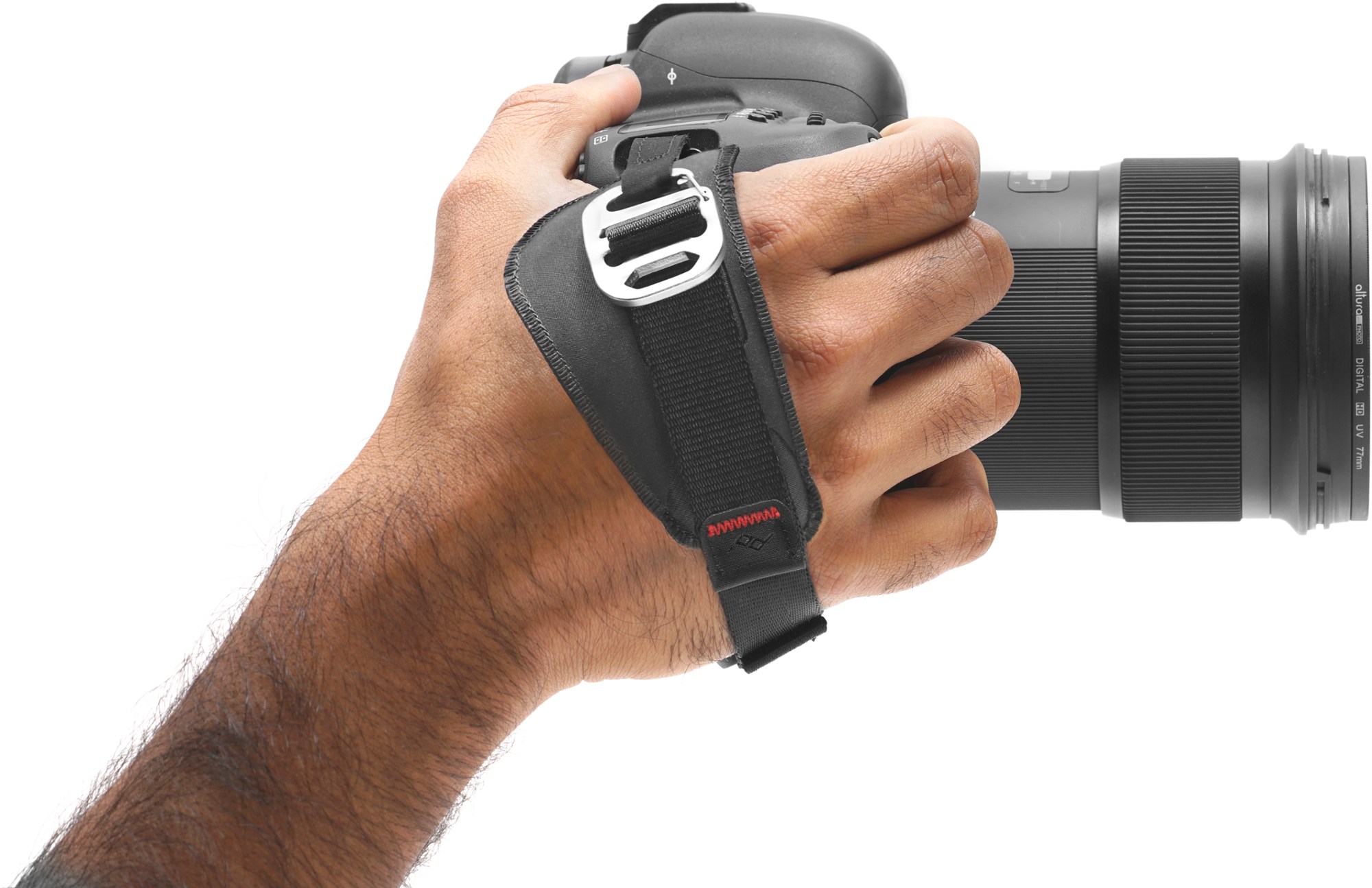 - The updated Peak Design Clutch camera hand strap connects and adjusts quickly to give you easy access to your camera’s controls, and then lets you cinch it down when you need security.