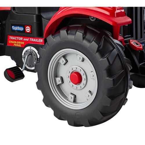 Case IH Tractor and Trailer Pedal Ride-On: Tough performance geared for all terrain Kids’ pedal tractor is a chain driven, pedal ride-on Large stake-side detachable trailer Load trailer and deliver cargo Roll bar Tough plastic construction Bicycle chain and sprockets enclosed to protect fingers Large adjustable seat Large tractor wheels Dimensions: 55″L x 26.5″W x 25.5″H Maximum weight capacity: 85 lbs Adult assembly required 2-year warranty with consumer participation