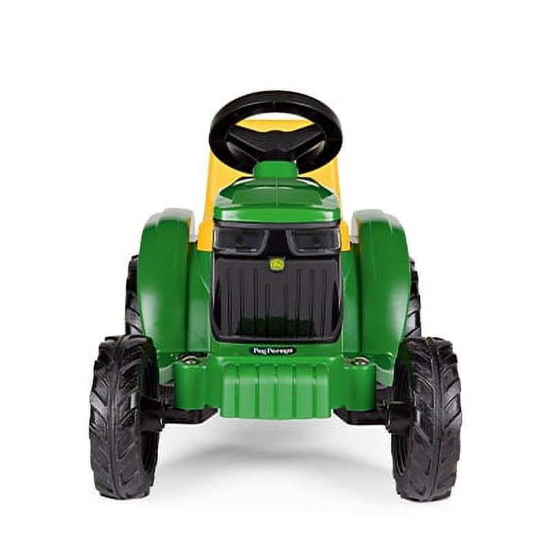 1-1/2 mph with foot pedal accelerator Indoor or outdoor use Automatic brake activation Adjustable seat Easy assembly Ages: 1-1/2 – 3; Weight Cap: 44 lbs Official John Deere licensed tractor from Peg Perego