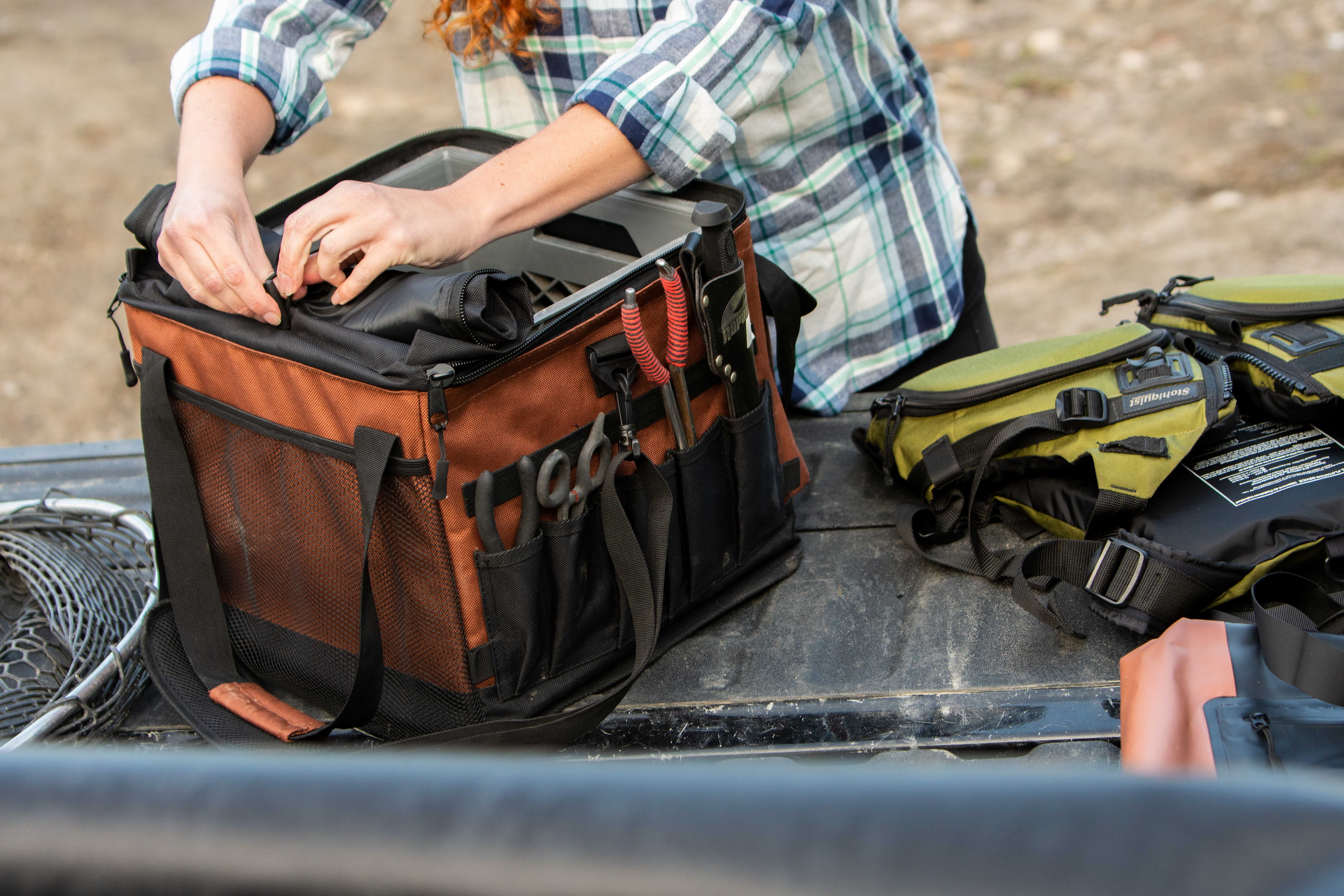 Can hold two fishing rod holders with drainage holes Accepts optional standard crate 13 x 13 in. Comes with a Reflective logos for more visibility Removable comfortable handle Lined storage compartment with heavy duty zipper Tie down loops to secure bag to kayak