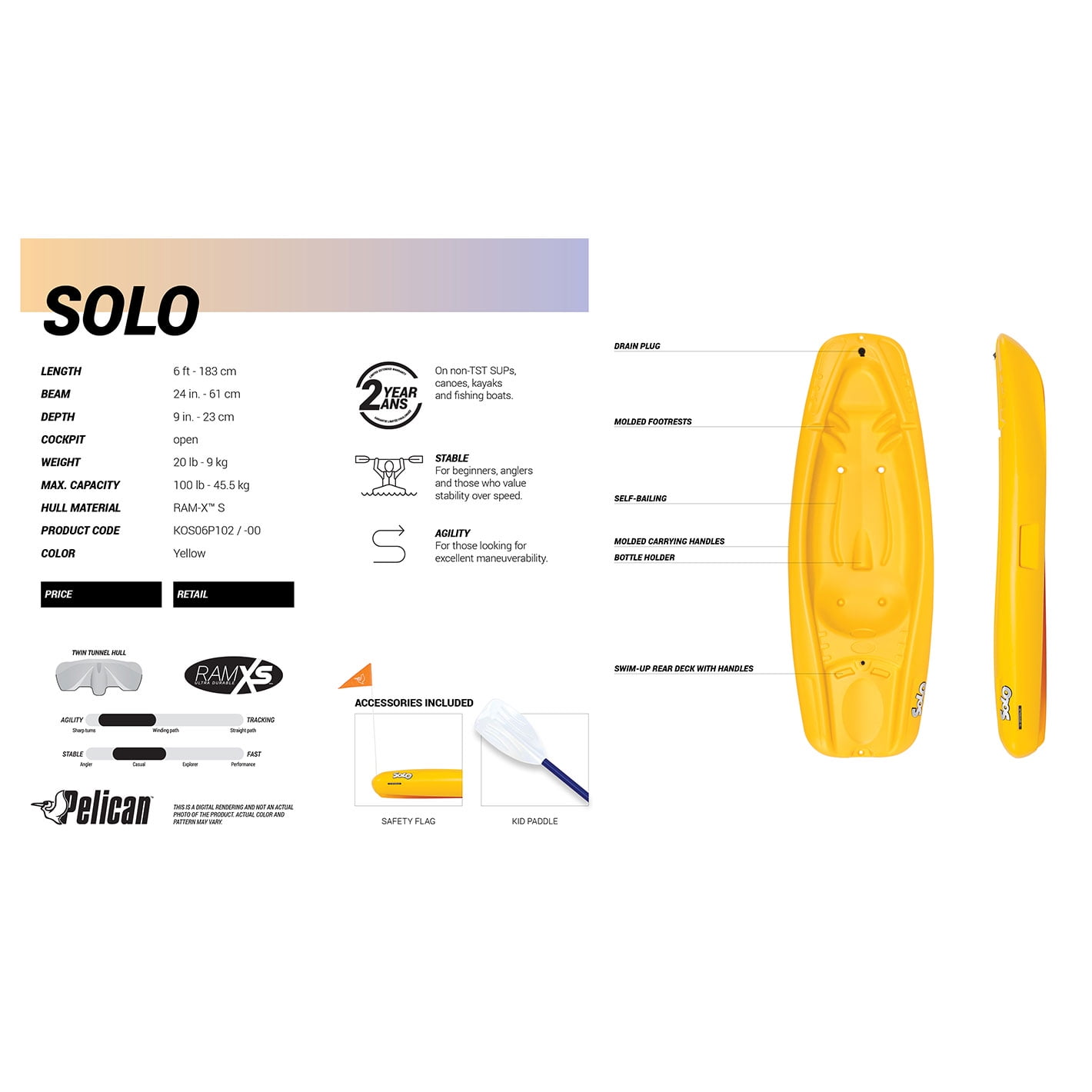 The Solo kayak is perfectly scaled down to suit smaller paddlers. Built with a twin tunnel hull, this 6′ sit-on-top kayak is easy to maneuver and provides superior stability, keeping your kids safe. The kayak features a molded seat and footrests, a bottle holder, a safety flag, and a kids’ paddle. Made of our Ram-X™ impact-resistant material, this self-bailing kayak is built to last through many years of fun on the water.