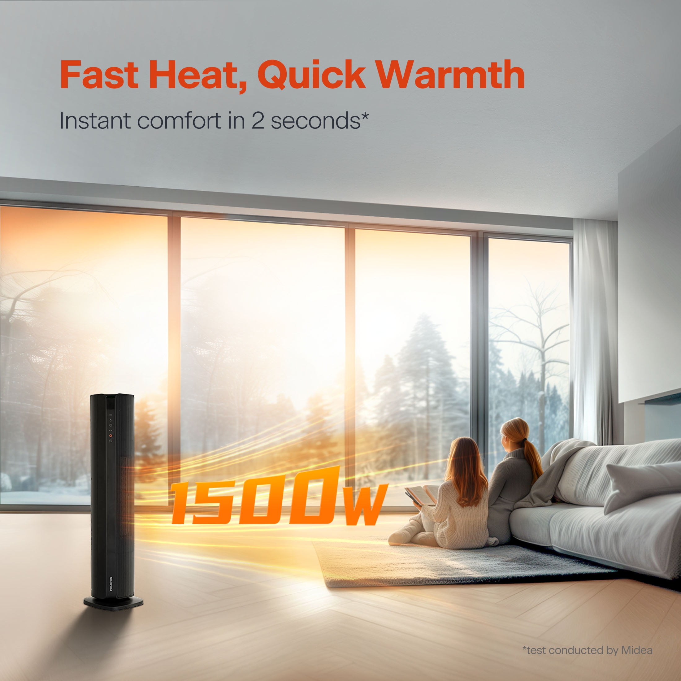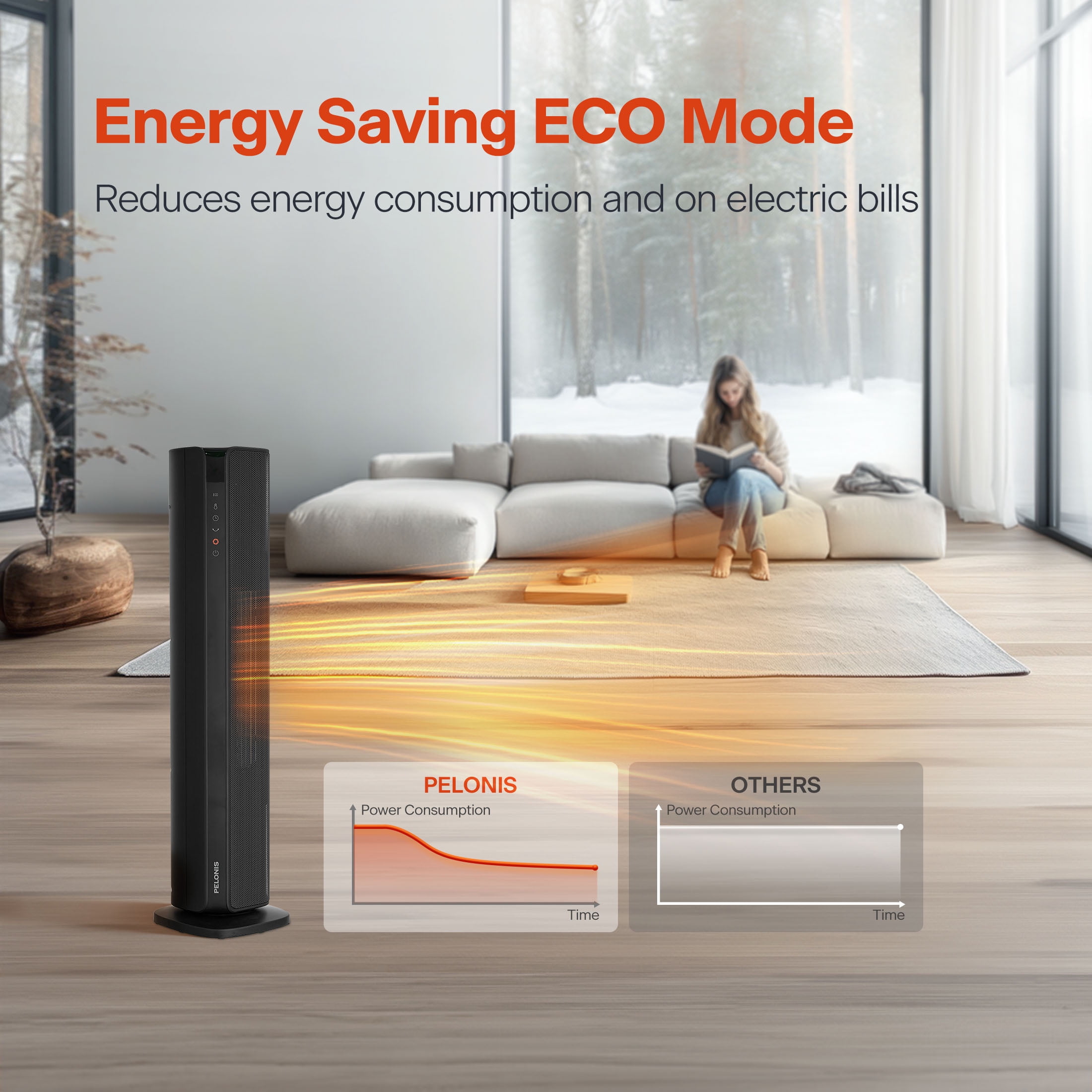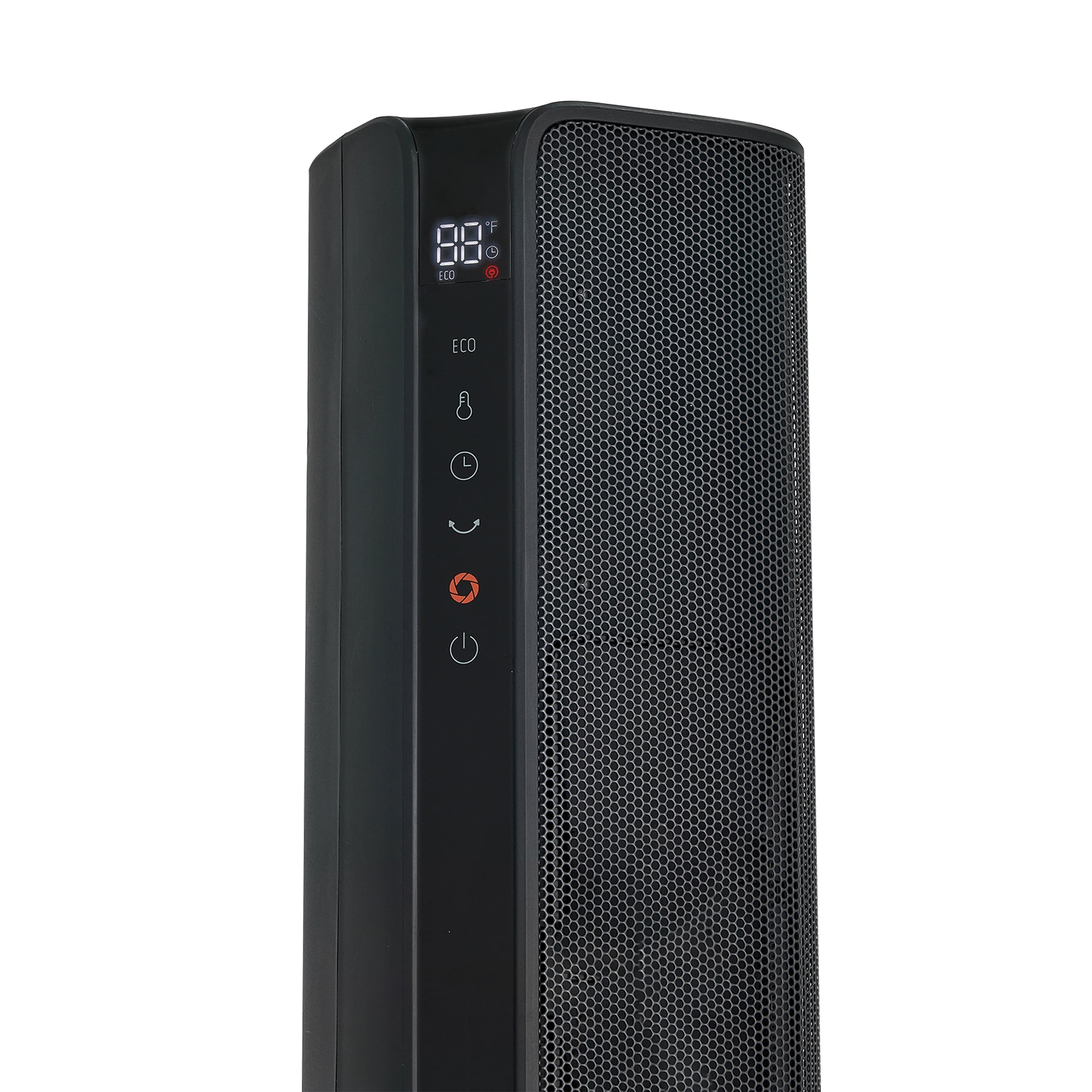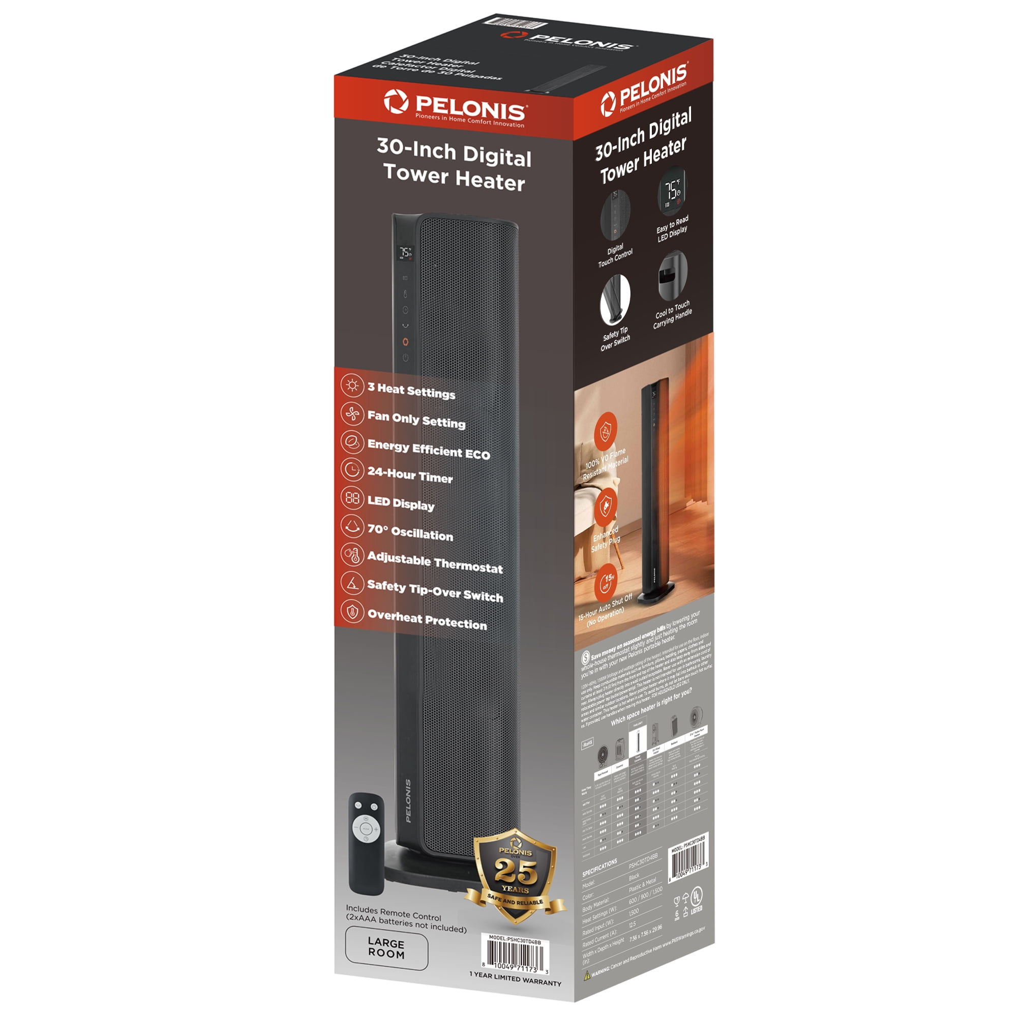 The new Pelonis 30-Inch Tower Heater, PSHC30TD4BB offers 3 heat settings, a fan only setting, and an energy-efficient ECO mode to keep you comfortable in any season. With a remote control, easy to read digital LED display, 24-hr timer and adjustable thermostat, customizing your environment is effortless. Enjoy 70°of oscillation for even heat distribution. Safety features include a tip-over switch, overheat protection, 15-hr auto shut-off, an enhanced safety plug, and made of 100% VO flame resistant material. Experience comforting warmth with peace of mind.