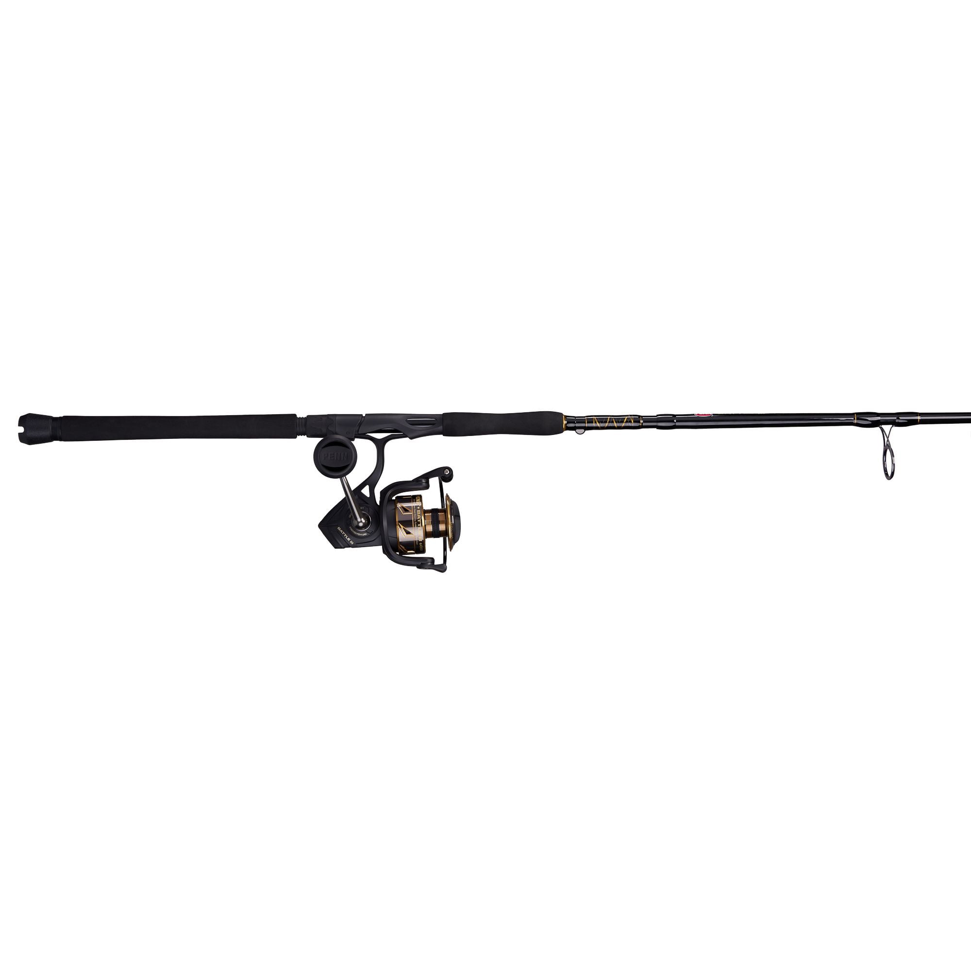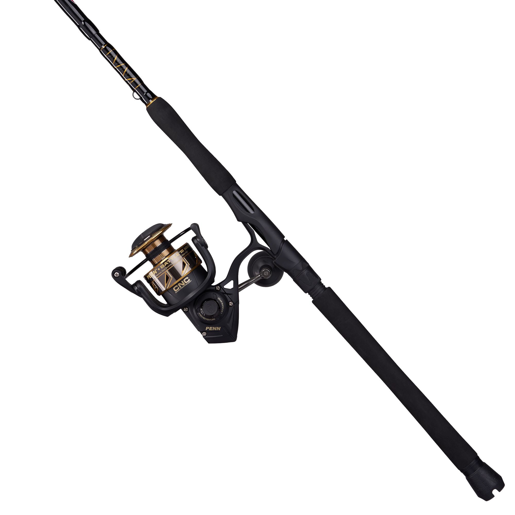 PENN BATTLE III 7’ FISHING ROD AND REEL SPINNING COMBO: Confidence and competence in equal measure, with proprietary PENN technology for more strength and durability than ever before. SUPERIOR CONSTRUCTION: 3-piece, Graphite Composite rod offers a durable and break-resistant yet lightweight tool for any angler. RECOVERY RATE: Recovers at the rate of 41” | 104cm with every turn of the crank. Gear ratio of 5.6:1. Computer-cut CNC Gear Technology makes for butter-smooth operation. HT-100 FRONT DRAG: Max drag: 25lb | 11.3kg. Mono capacity yd/lb: 335/15 230/20 210/25. Braid capacity yd/lb: 490/30 390/40 335/50. 6 TOTAL BEARINGS: 5+1 stainless steel ball bearing system with instant anti-reverse feature provides smooth operation for any fishing experience. 12-25 LB LINE RATING, MEDIUM HEAVY POWER, FAST ACTION, LURE RATING OF 3/4-2. 8 DURABLE GUIDES: One-piece PENN Dura-Guides provide a durable, stamped solution for the heat and tension of stressed lines. ROD HANDLE CONSTRUCTION: Full EVA handle is made for Right/Left handed anglers.
