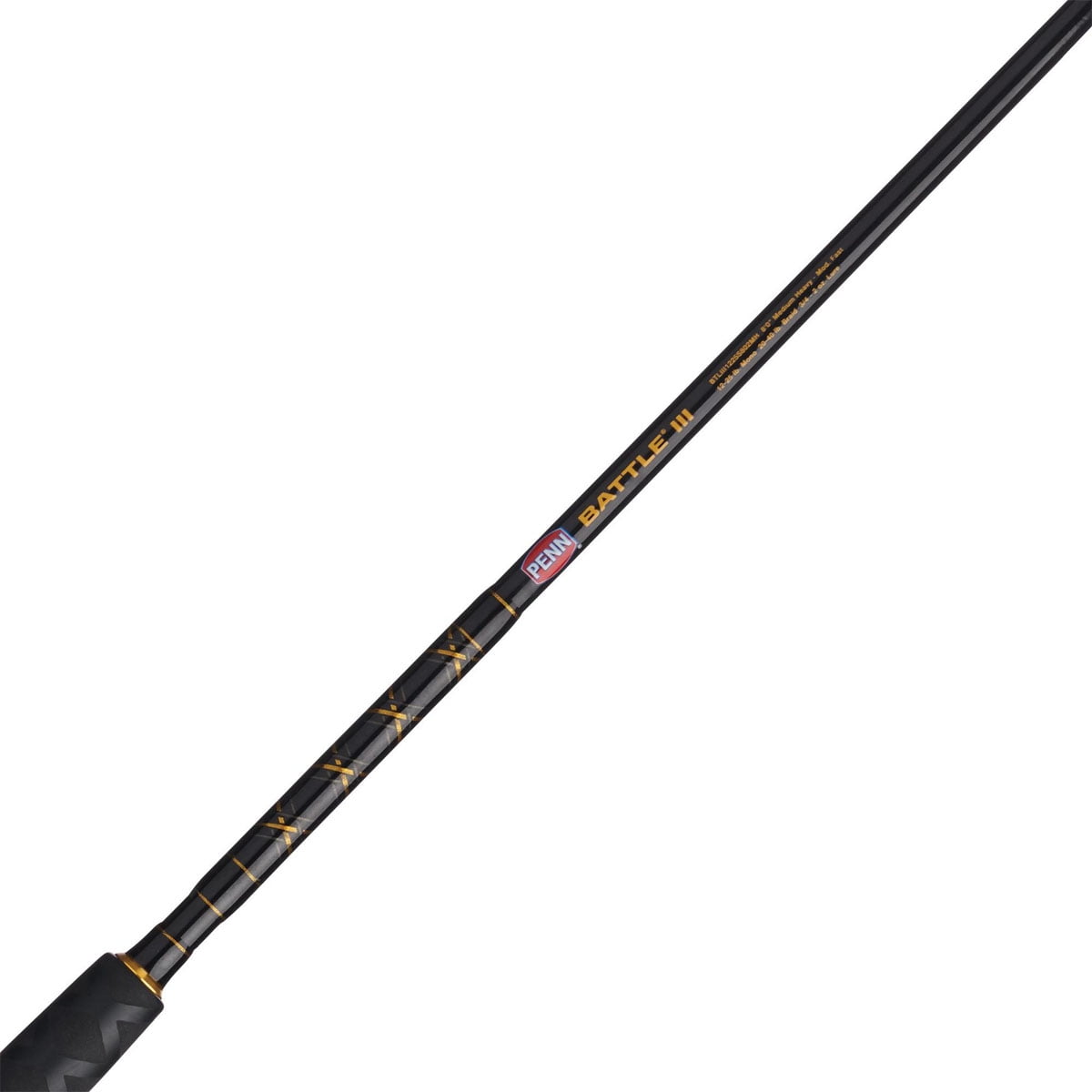 PENN BATTLE III 8’ FISHING ROD AND REEL SPINNING COMBO: Confidence and competence in equal measure, with proprietary PENN technology for more strength and durability than ever before. SUPERIOR CONSTRUCTION: 2-piece, Graphite Composite rod offers a durable and break-resistant yet lightweight tool for any angler. RECOVERY RATE: Recovers at the rate of 36” | 91cm with every turn of the crank. Gear ratio of 5.6:1. Computer-cut CNC Gear Technology makes for butter-smooth operation. HT-100 FRONT DRAG: Max drag: 25lb | 11.3kg. Mono capacity yd/lb: 225/12 200/15 135/20. Braid capacity yd/lb: 420/20 300/30 240/40. 6 TOTAL BEARINGS: 5+1 stainless steel ball bearing system with instant anti-reverse feature provides smooth operation for any fishing experience. 12-25 LB LINE RATING, MEDIUM HEAVY POWER, MODERATE FAST ACTION, LURE RATING OF 3/4-2. 6 DURABLE GUIDES: One-piece PENN Dura-Guides provide a durable, stamped solution for the heat and tension of stressed lines. ROD HANDLE CONSTRUCTION: Split EVA/Rubber Shrink Tube handle is made for Right/Left handed anglers.