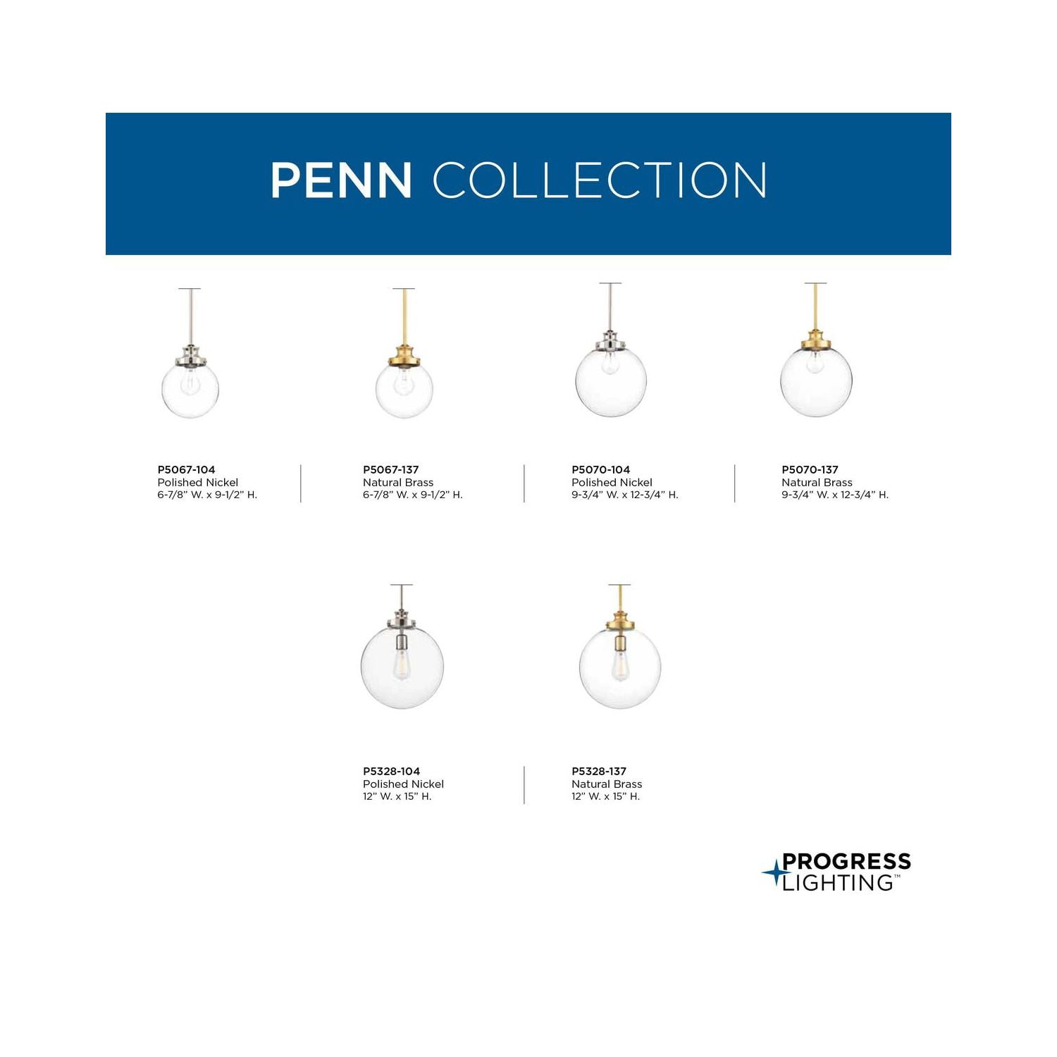 Display a modern take on a vintage design with a pendant light from the Penn Collection. Signature clear glass sphere provides beautiful illumination. A sleek stem and metal details are coated in a golden natural brass finish. Compatible with dimmable bulbs.