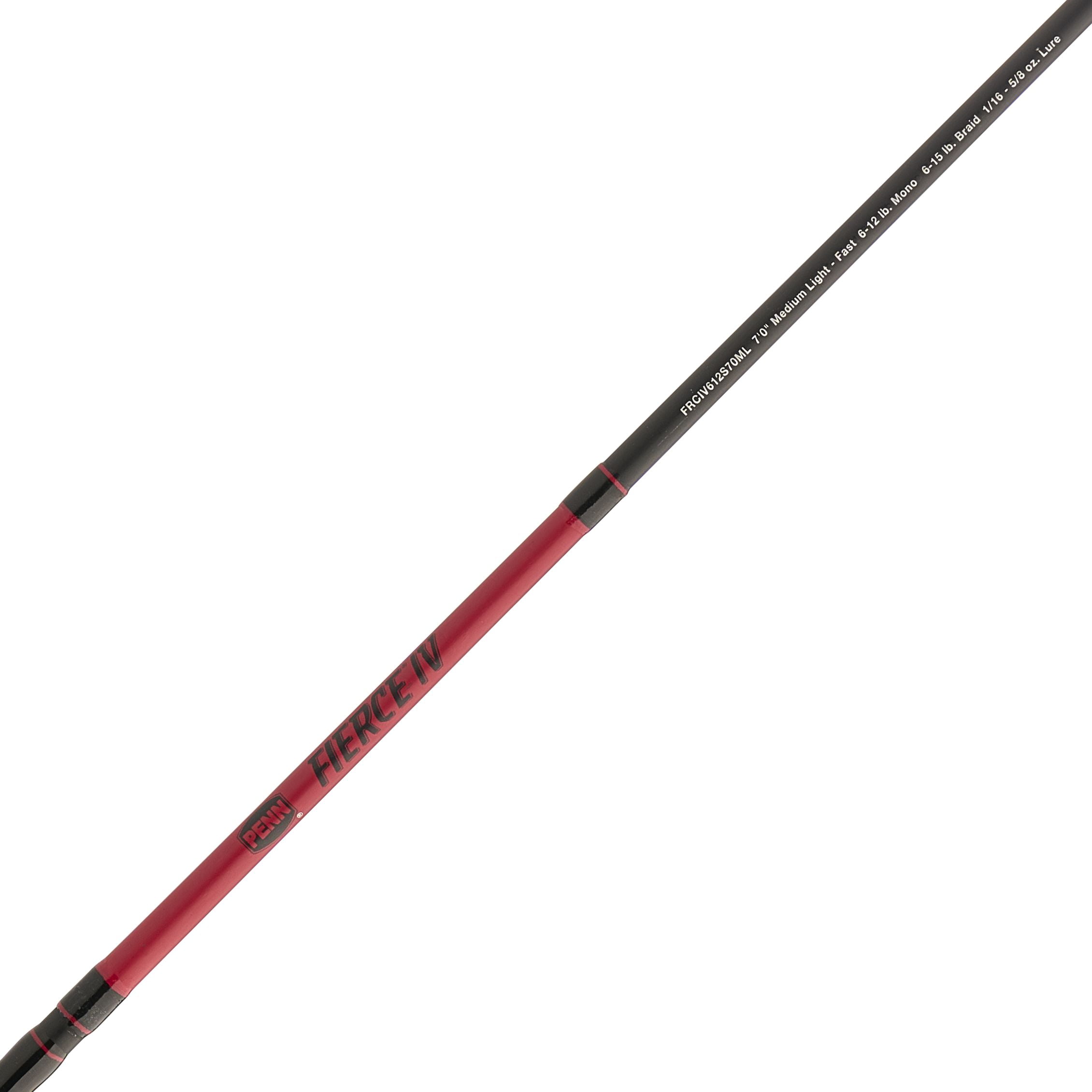 PENN FIERCE IV 7’ FISHING ROD AND REEL SPINNING COMBO: Power and performance to win combat with the toughest fish. SUPERIOR CONSTRUCTION: 1-piece, Graphite Composite rod offers a durable and break-resistant yet lightweight tool for any angler. RECOVERY RATE: Recovers at the rate of 33″ | 84cm with every turn of the crank. Gear ratio of 6.2:1. The reel features a full metal body and sideplate for improved durability. HT-100 FRONT DRAG: Max drag: 12lb | 5.4kg. Mono capacity yd/lb: 255/6 175/8 140/10. Braid capacity yd/lb: 240/10 220/15 160/20. 5 TOTAL BEARINGS: 4+1 sealed stainless steel ball bearing system with instant anti-reverse feature provides smooth operation for any fishing experience. 6-12 LB LINE RATING, MEDIUM LIGHT POWER, FAST ACTION, LURE RATING OF 1/16-5/8. 8 DURABLE GUIDES: One-piece PENN Dura-Guides provide a durable, stamped solution for the heat and tension of stressed lines. ROD HANDLE CONSTRUCTION: Full EVA handle is made for right and left handed anglers.