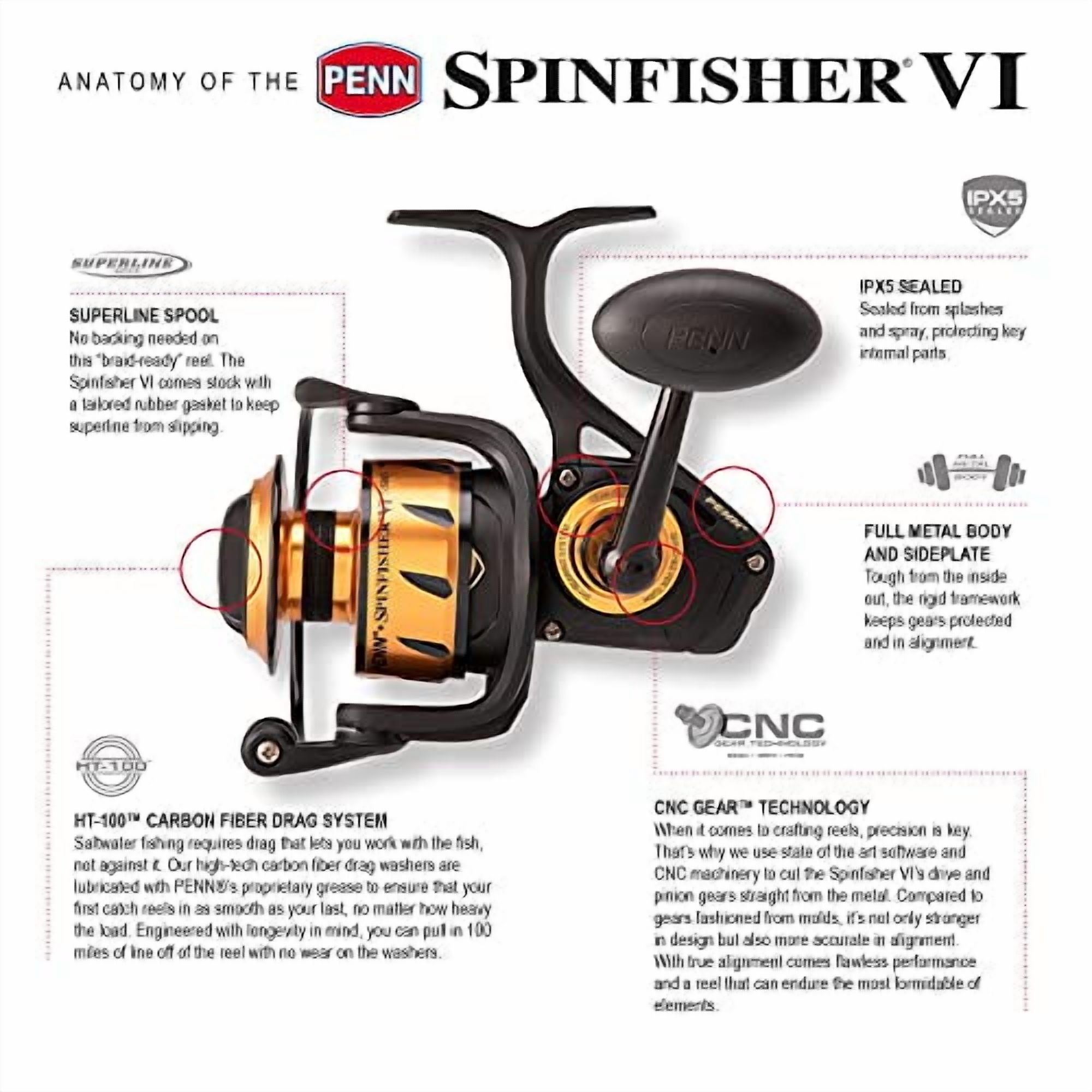 IPX5 SEALED ALUMINUM REEL SPOOL: Successfully combat corrosion with an all-metal reel body and spool design that also features Line Capacity Rings. PRECISION CNC GEAR TECHNOLOGY: Durable, precise, and smooth. Recovers at the rate of 42” | 107cm with every turn of the crank. Gear ratio of 5.6:1. 6 TOTAL BEARINGS: The Spinfisher VI features 5 stainless steel ball bearings plus 1 instant anti-reverse bearing to provide smooth operation for any saltwater fishing experience. HT-100 FRONT DRAG SYSTEM: Built with carbon fiber washers for a max drag of 30lb | 13.6kg, this system will handle big fish without wearing you down. LINE CAPACITY: Mono Capacity yd/lb: 390/12 345/15 205/20. Braid Capacity 485/30 410/40 335/50. RIGHT/LEFT HANDLE POSITION. SUPERLINE SPOOL: Easily prepare for battle with a system that makes it simple to attach slick, braided line. Sizes 2500-5500 have automatic bail trip; Sizes 6500-10500 have manual bail trip. THE PENN PROMISE – No matter where you fish or what you fish for, look to PENN for dependable performance, now and in the future. Sizes 2500-5500 have automatic bail trip Sizes 6500-10500 have manual bail trip