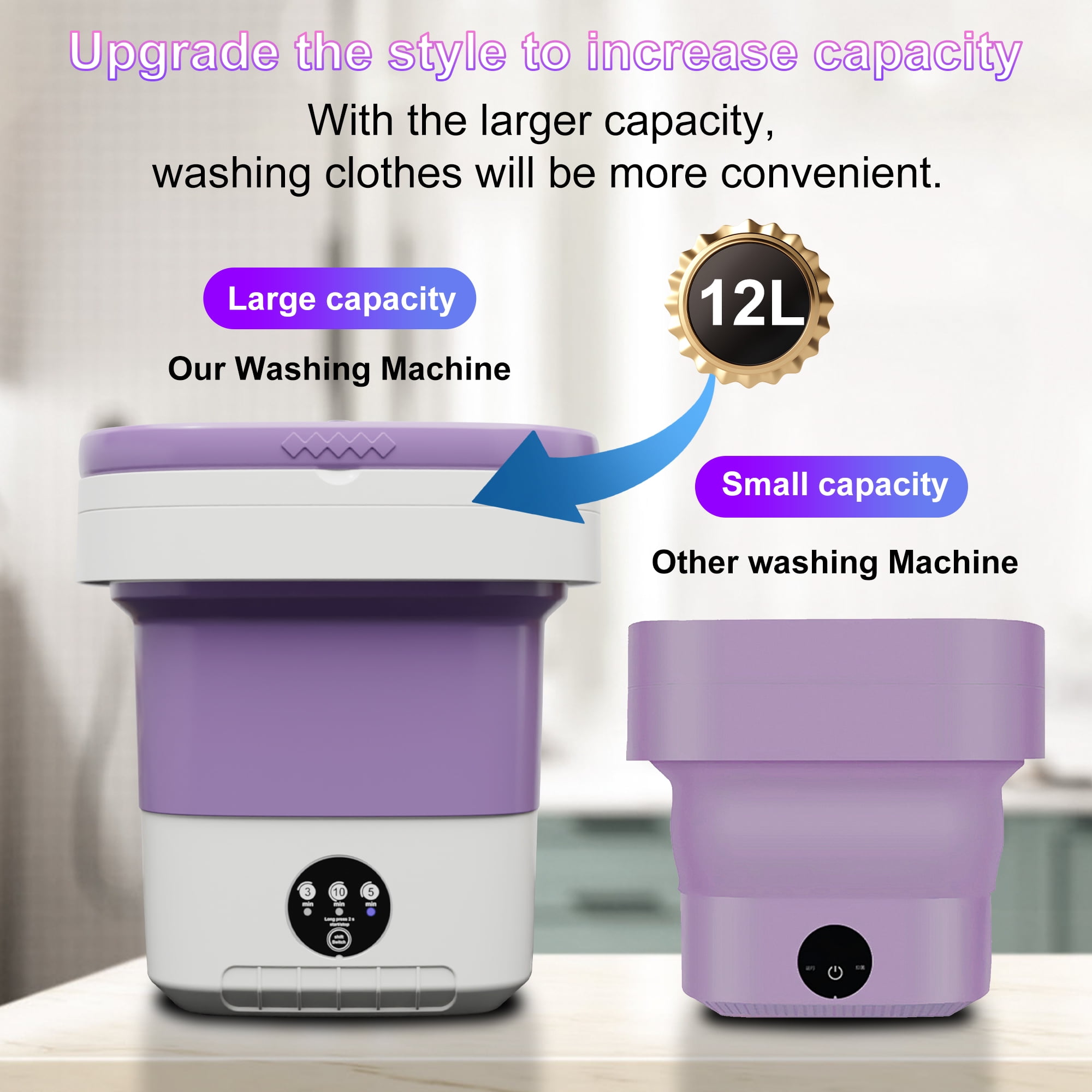 12L Portable Washing Machine, Mini Foldable Washer, Small Washing Machine for Apartment, Camping, RV, Travel, Dorms, Condos, Motor Homes, Underwear, Socks, Baby Clothes and more. Features: Color: Purple Product size: 32.5 * 30 * 31cm/12.8 * 11.8 * 12.2 inch Folded size: 15 * 30 * 30cm/3.1inch * 11inch * 11inch Product weight: 2.1kg/4.6lb Washing capacity: 12L Cleaning Mode: 3 Package Includes: 1*Folding washing machine 1*Drain Hose 1*Detachable Drainage Bucket 1*US Plug 1*Instructions The mini portable washing machine is designed for healthier living by enabling separate washes for small items like underwear, socks, and baby clothes. Its simulated handwashing impeller ensures a gentle yet powerful clean, while the drainage basket prevents dripping. Made from durable TPE material, it’s also suitable for personal items, fruits, and vegetables. Lightweight and easy to carry, it’s perfect for travelers, students, and those with limited space. With super quiet technology, it saves time and effort while ensuring a healthier and safer laundry experience.