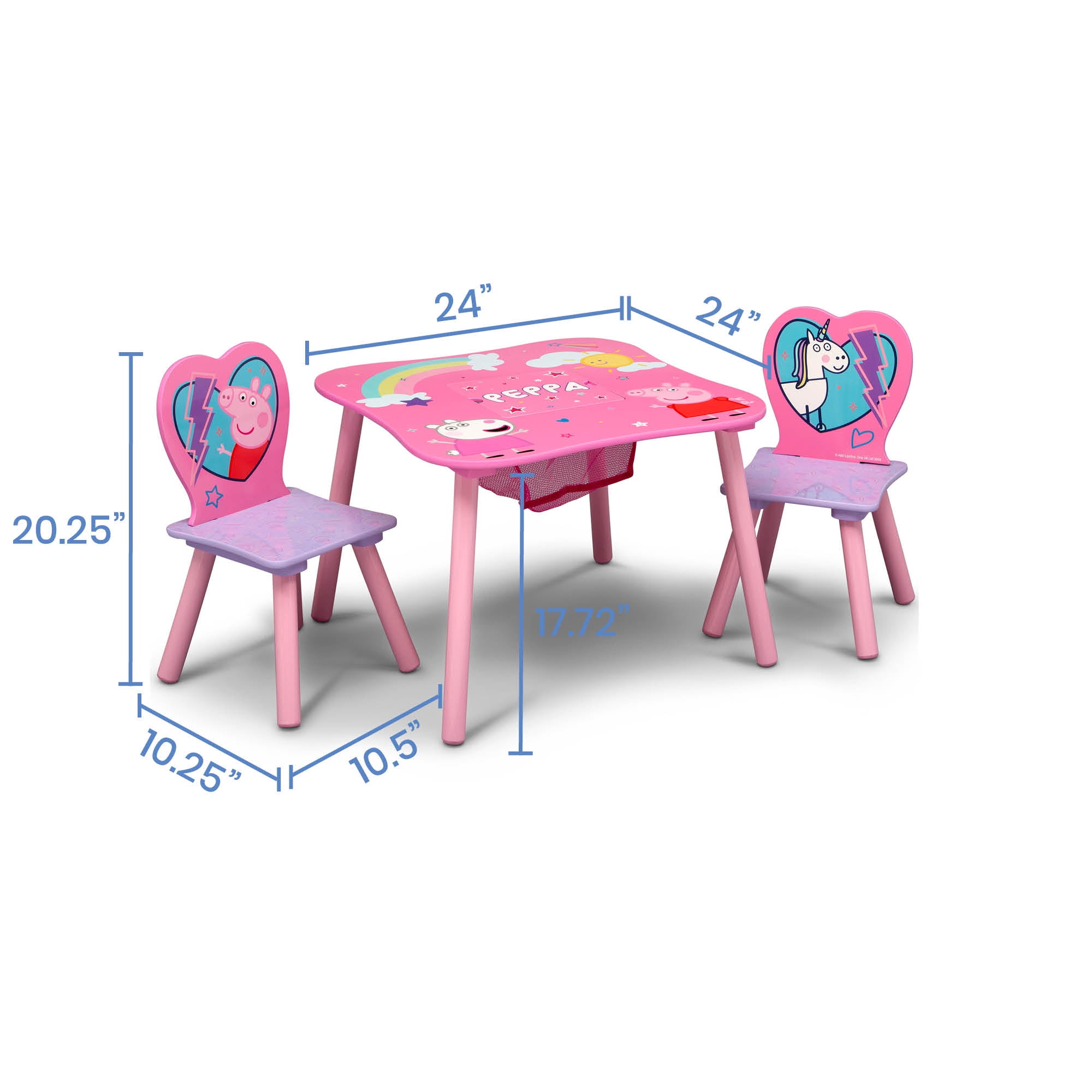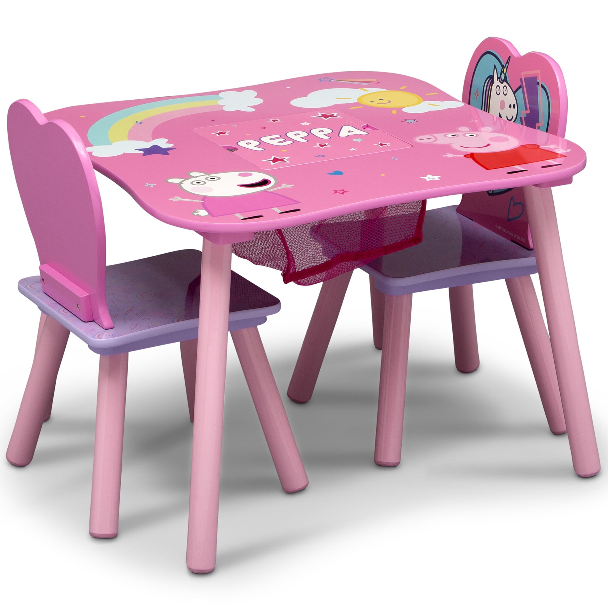 Your little one will go hog wild for this Peppa Pig Table and Chair Set with Storage by Delta Children “snort”. Peppa Pig magical unicorn, this fun play table is ideal for coloring, homework, and snack time. Built-in storage in the center of the table provides plenty of space to store markers, crayons, or small toys. This is the perfect play table for pretend play, homeschooling, or remote learning. Peppa Pig is a lovable, cheeky little pig that lives with Mummy, Daddy, and little brother George. Peppa Pig favorite things include her family, friends, and fun learning. Her adventures always end happily with loud snorts of laughter. Each episode features fun, everyday activities that support kids’ social & emotional development. To complete your child’s room, explore Delta Children complete collection of Peppa Pig furniture based on the beloved show.