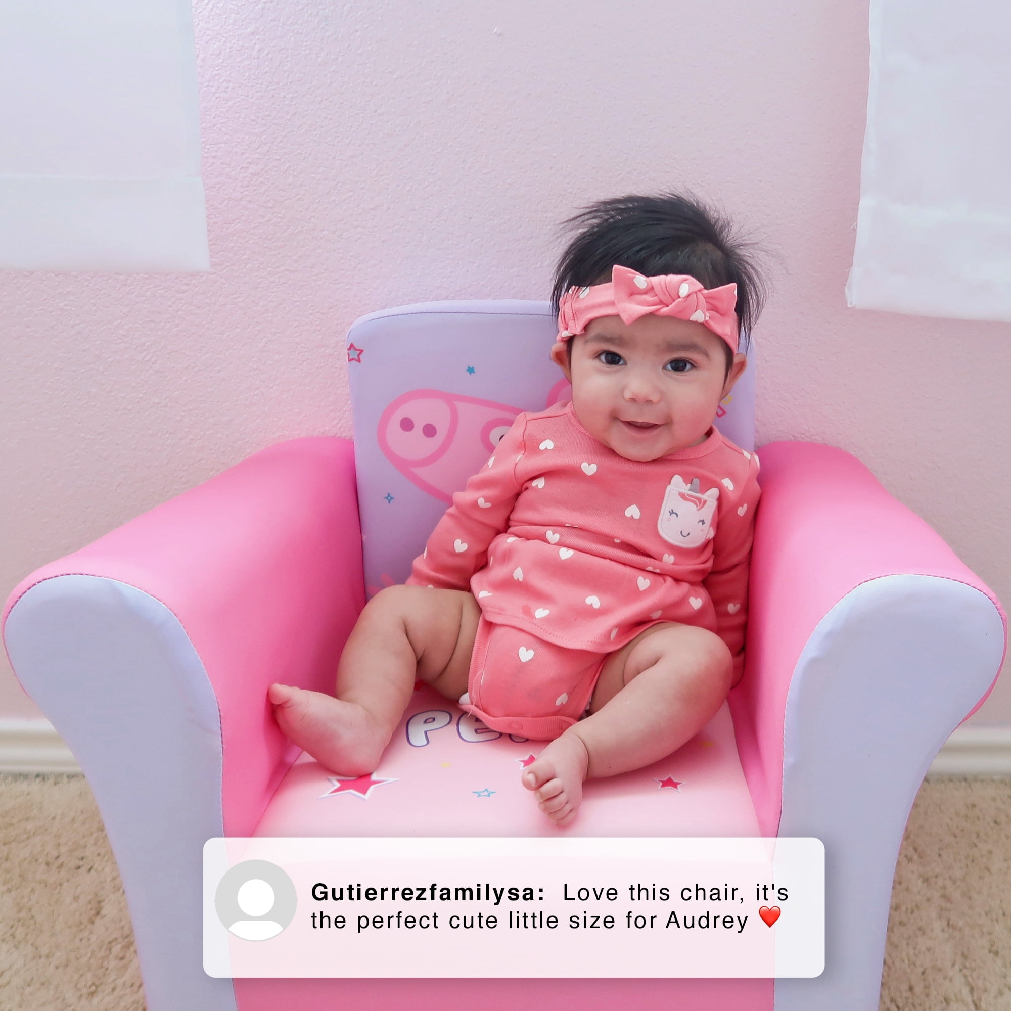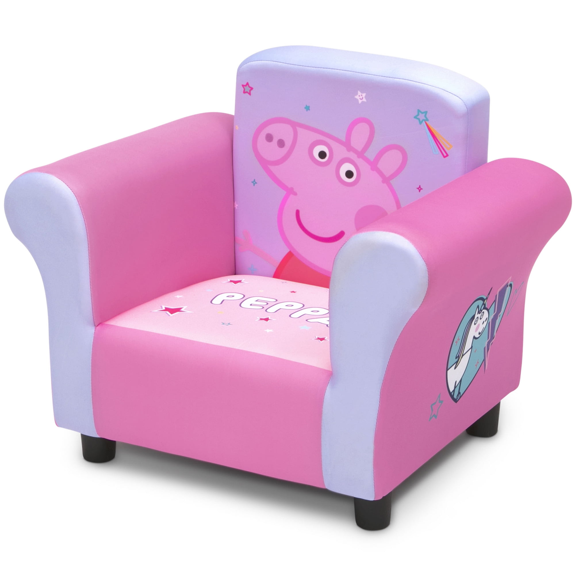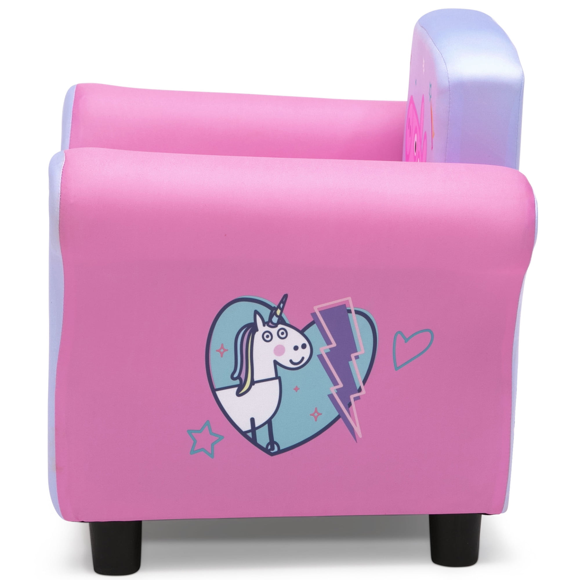 Peppa Pig Upholstered Chair by Delta Children: Recommended Use: Recommended for ages 3+ Holds up to 100 pounds For the Peppa Pig Fan: Colorful graphics of Peppa and Peppa’s Magical Unicorn Durable Construction: Features a hardwood frame and padded seat Easy to Clean: Wipe clean with mild soap and water Safe Option for Kids: Meets or exceeds all safety standards set by the CPSC Size: Assembled dimensions: 17.75”W x 16.125”D x 22”H
