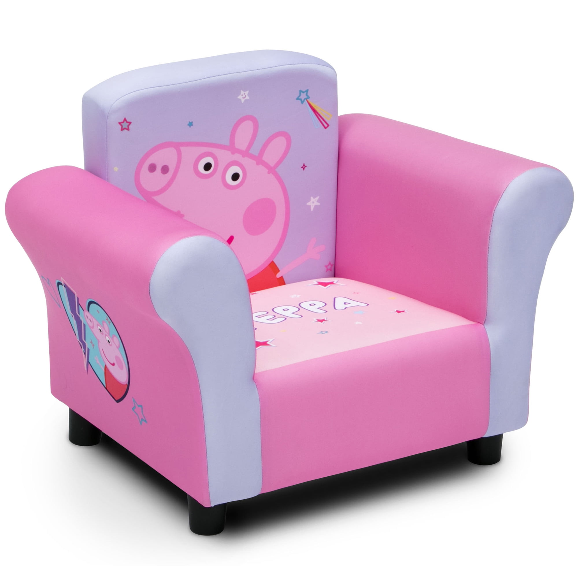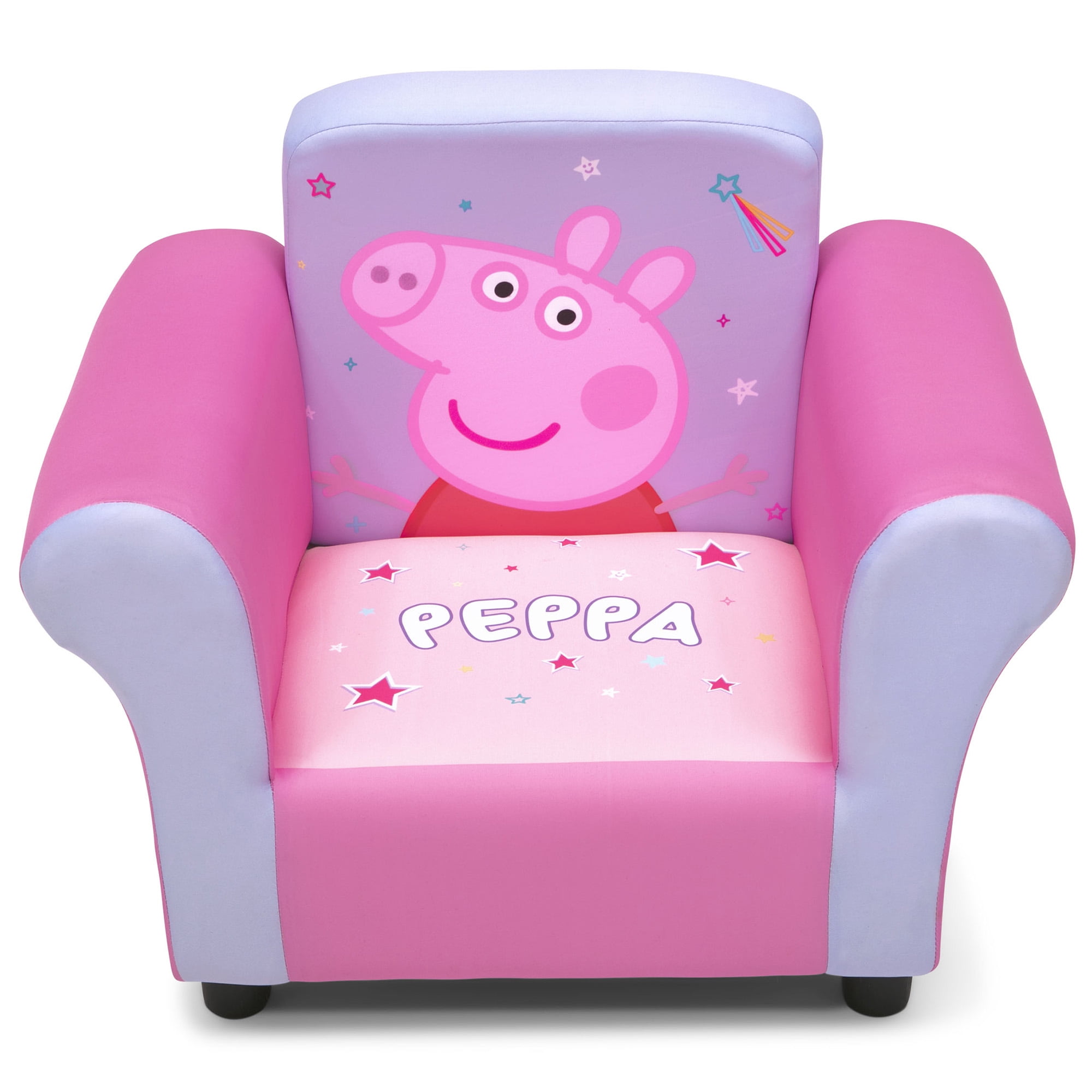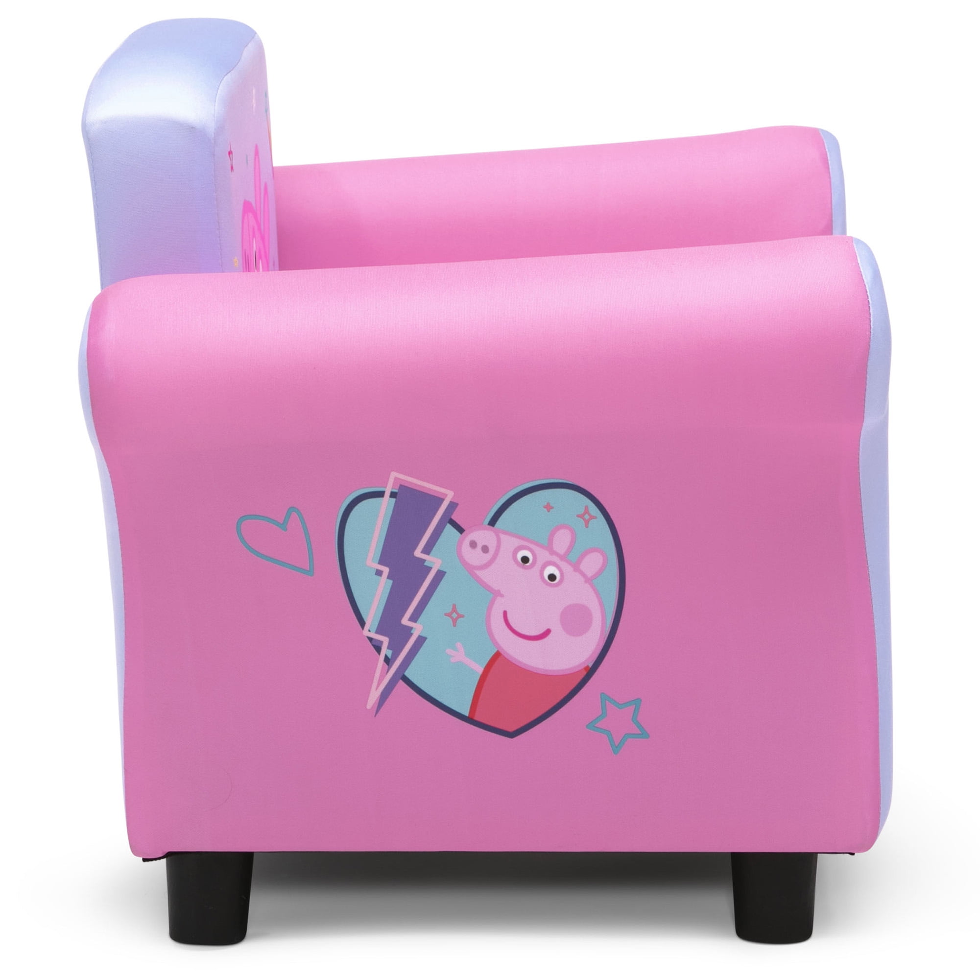 Peppa Pig Upholstered Chair by Delta Children: Recommended Use: Recommended for ages 3+ Holds up to 100 pounds For the Peppa Pig Fan: Colorful graphics of Peppa and Peppa’s Magical Unicorn Durable Construction: Features a hardwood frame and padded seat Easy to Clean: Wipe clean with mild soap and water Safe Option for Kids: Meets or exceeds all safety standards set by the CPSC Size: Assembled dimensions: 17.75”W x 16.125”D x 22”H