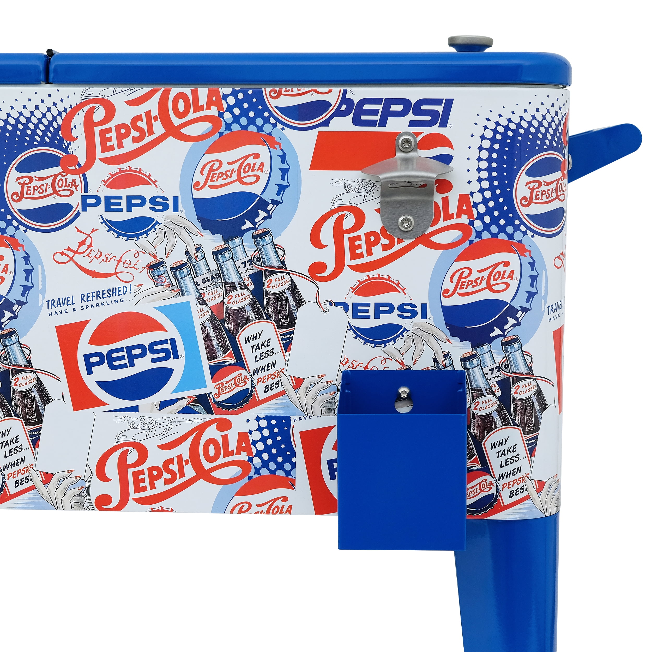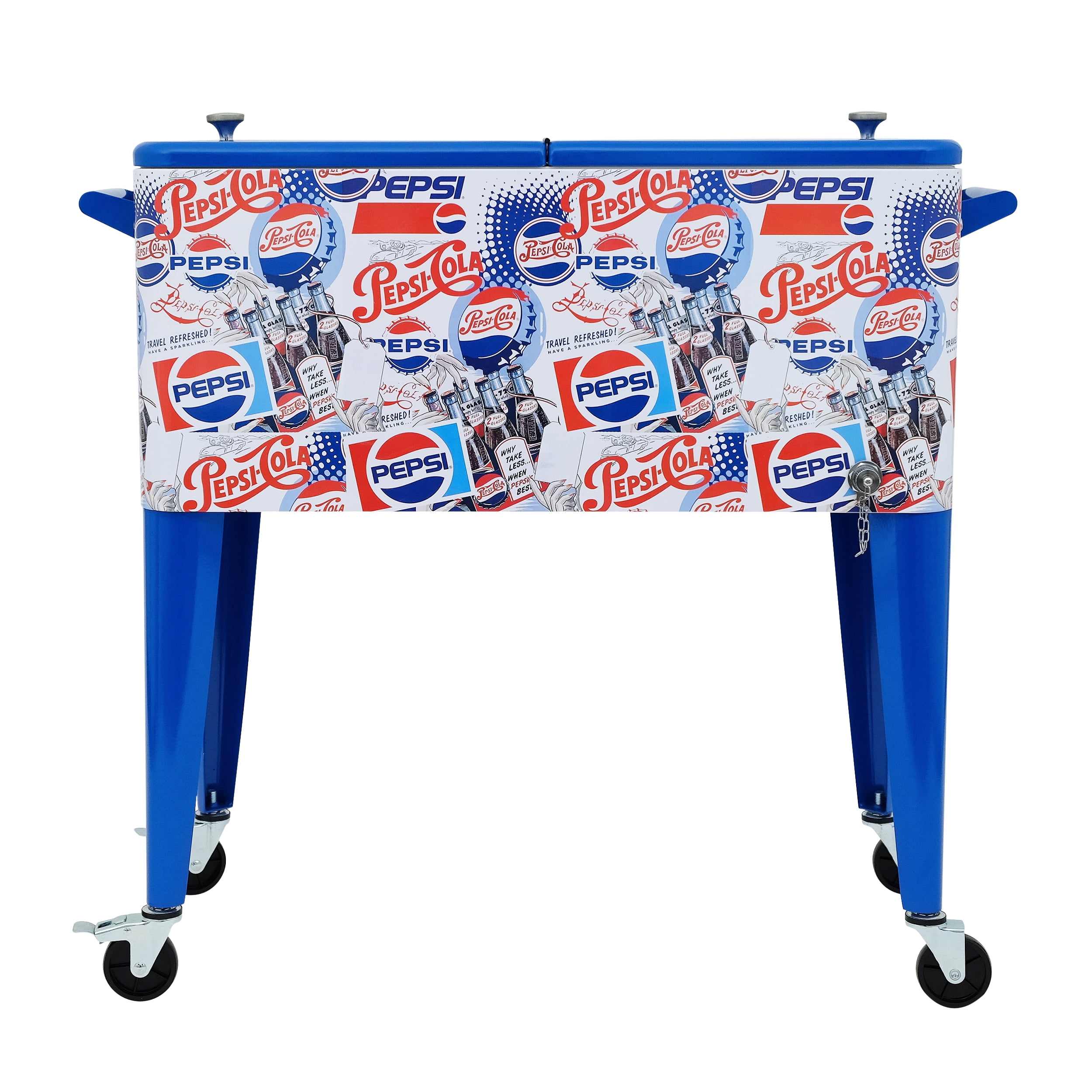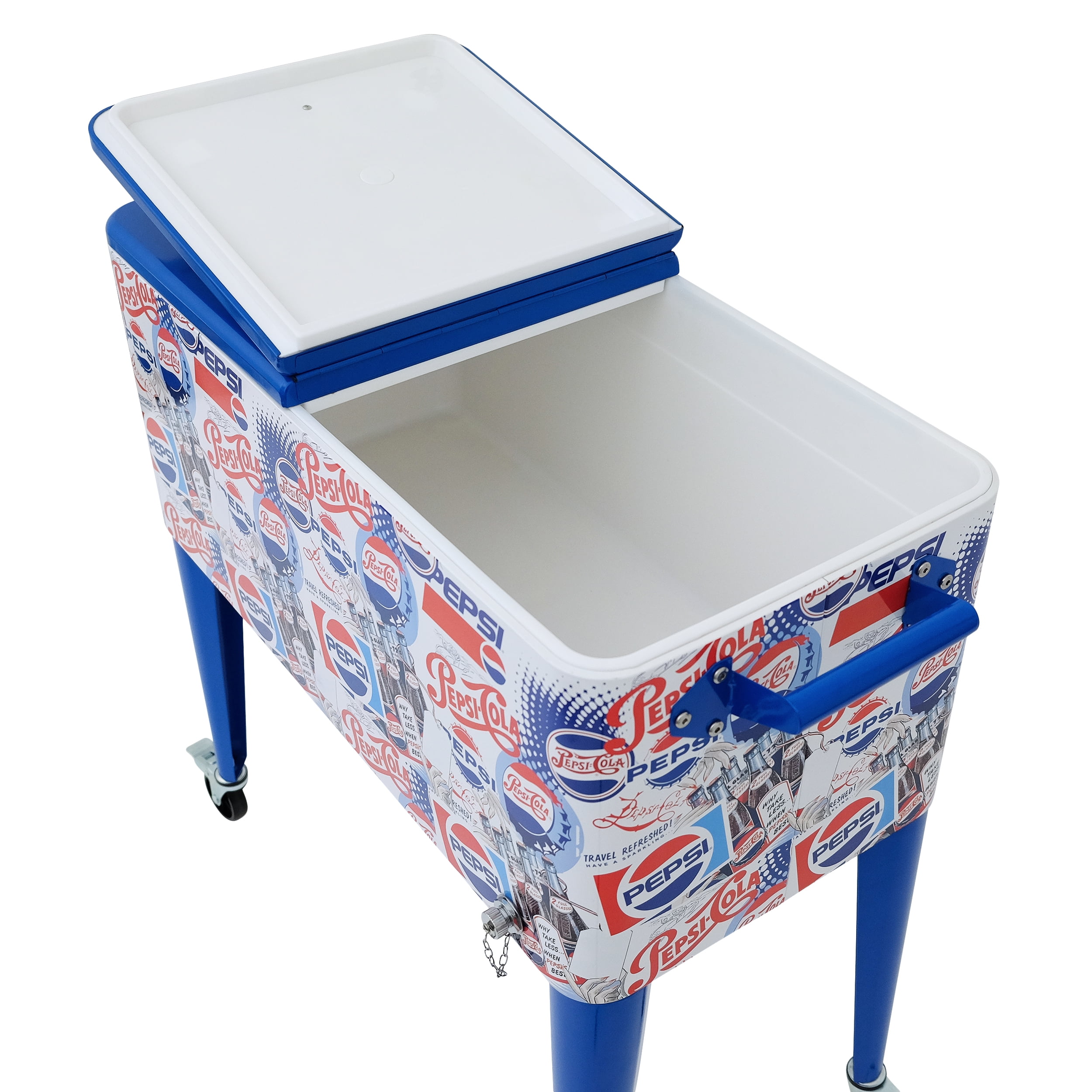When it comes to bringing the goods to your social gatherings, holidays, and events, there’s no better portable choice than the Pepsi 80-Quart Patio Cooler – Heritage Edition Rolling Patio Cooler. This officially-licensed Pepsi cooler is designed to deliver refreshments with a fun and exciting style. The large 80-quart insulated basin is perfect for keeping beverages cool on your backyard, deck, patio, or porch. With its easy-to-use rolling wheels and two comfortable handles, you can transport cold beverages anywhere with ease. Plus, it features an eye-catching collage of Pepsi logos from past decades to add even more fun to your outdoor occasions. Get the party started with the Pepsi 80-Quart Patio Cooler – Heritage Edition Rolling Patio Cooler! Officially Licensed Pepsi Cooler Large 80-Quart Storage Capacity Fits 110 12-Oz Cans or 50 Bottles Insulated Basin to Keep Drinks Cold Fully Removable Top Lid Double-Sided Handles Built-In Bottle Opener and Cap Catcher Includes Drain Plug Swivel Wheels and Locking Casters Material: Powder-Coated Steel Measures 36.06″ x 18.7″ x 34.17″ (LxWxH) Weighs 35.3 Lbs.