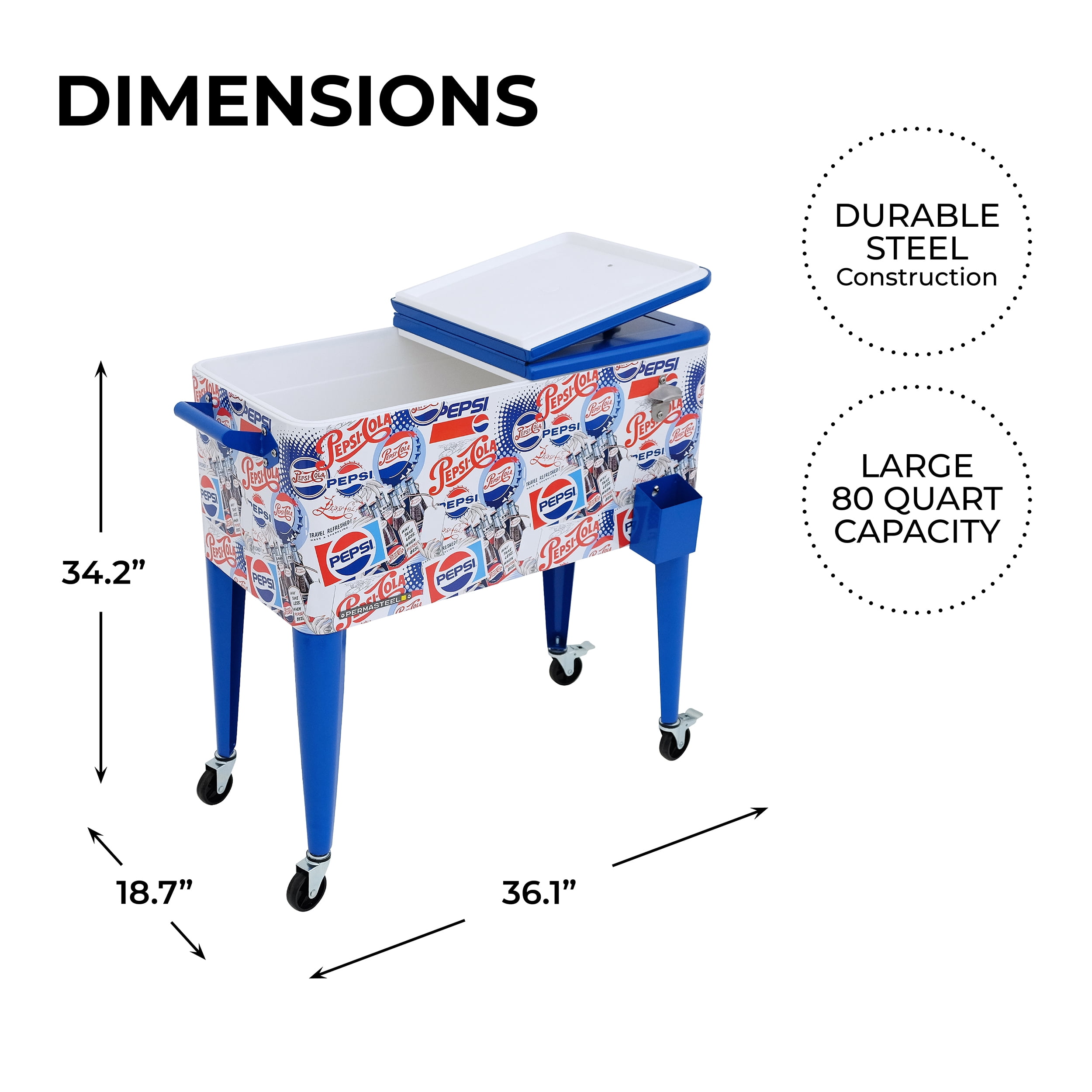 LIMITED “HERITAGE” EDITION – Unlock your nostalgia vault with a spectacular stroll down Memory Lane! Revels in the legendary Pepsi logo from previous decades and relive those cherished memories. LARGE 80-QUART STORAGE CAPACITY – Permasteel patio cooler is the perfect way to keep your drinks and snacks freshly-chilled while you relax outside. FULLY REMOVABLE “SPLIT-HINGE” TOP LID – Get quick and convenient access to your favorite drinks with a top lid that easily opens up halfway or can be removed completely for quick refreshments.