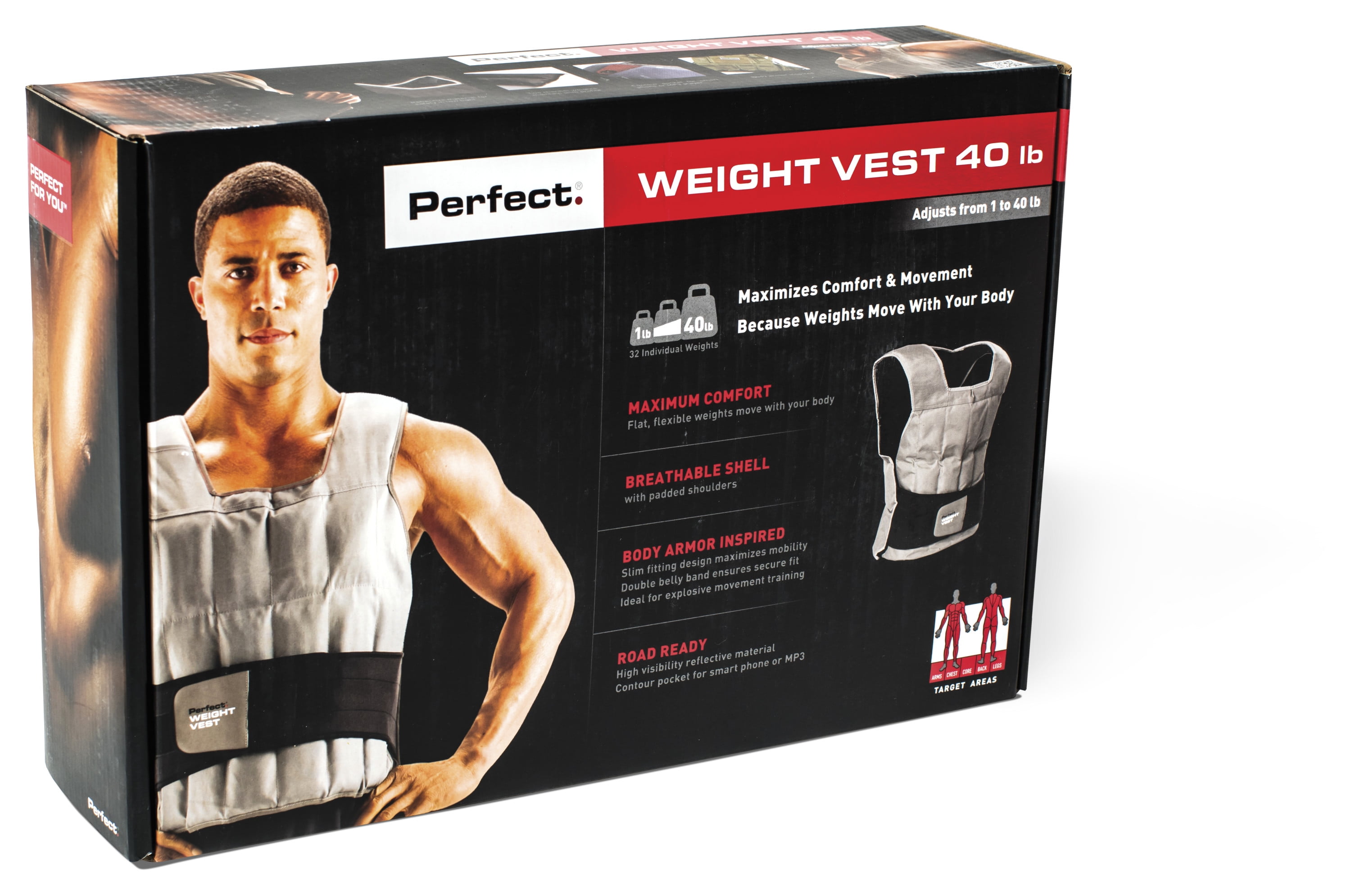 The Perfect Fitness 40 lb. Weight Vest is fully adjustable and allows you to maximize your workout anywhere from 1.25lbs up to 40lbs. Add intensity and resistance to your workout with a fully adjustable weight vest. The design is inspired by military body armor and provides a slim, comfortable fit. Flat, flexible weights move with your body and vest is fully adjustable. Double belly band ensures secure fit and is ideal for explosive movement training like plyometrics and functional fitness exercises. Extra durable shell with padded shoulders provides extra comfort. The 40 lb. vest is ideal for fire, police and military training. Vest is road ready with high visibility reflective material for low light conditions and contour pocket for phone.