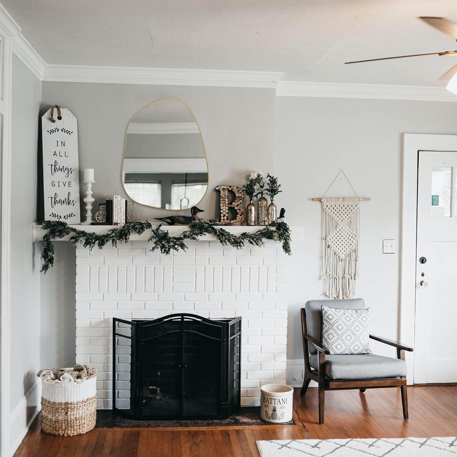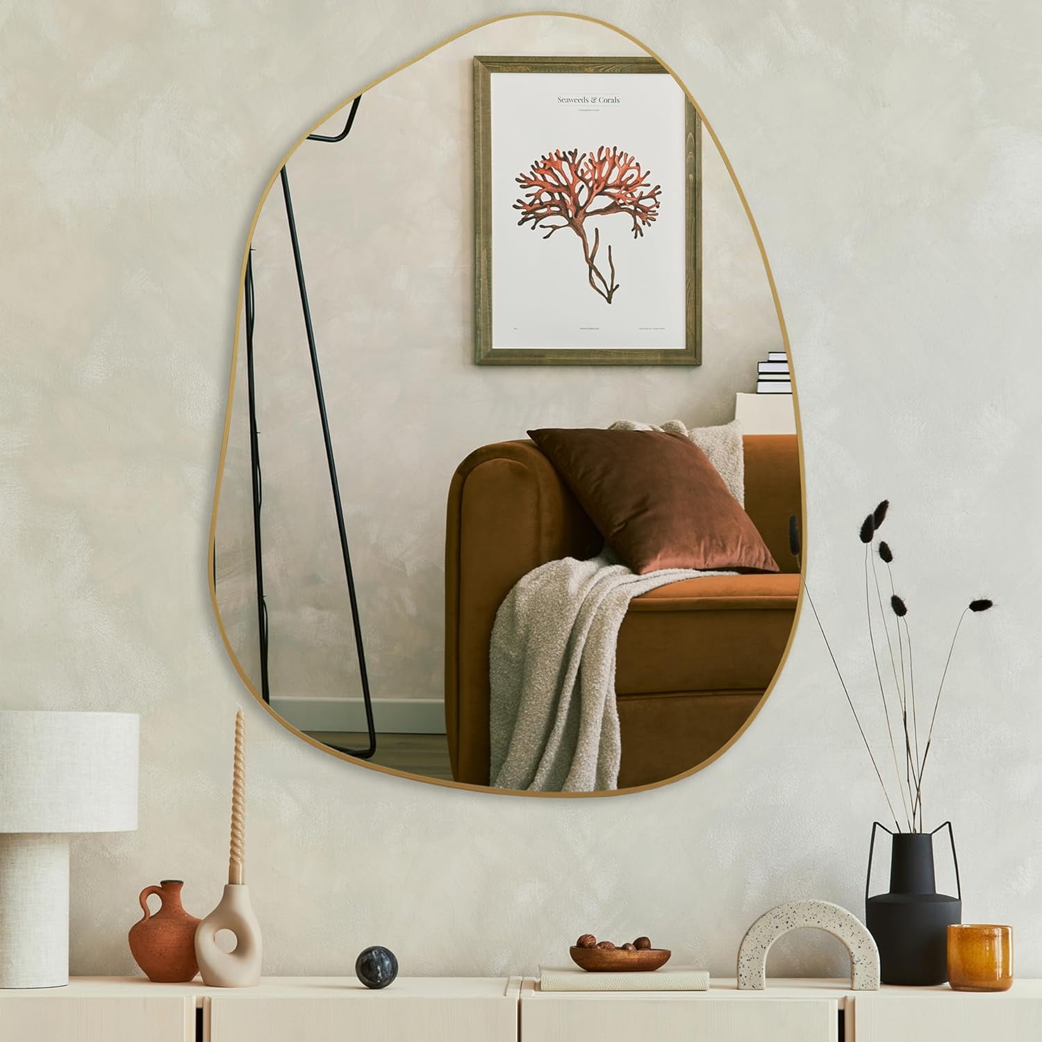 【Unique Design】Crafted with a distinctive irregular shape, our asymmetrical mirror complements any decorative setting, elevating the aesthetics of your space. Ideal decorative wall mirror choice, perfectly goes with any decor, suitable for use in the bathroom, vanity, over sink, farmhouse, bedroom, living room, dining room, entryway, fireplace, hotel, salon and so on. 【Clear Reflection & NO Distortion】The bathroom vanity mirror made of premium quality HD float glass ensures a crystal-clear reflection. The glass maintains true colors and shape, enhancing overall lighting in your space. 【Perfect Size】The irregular wall mirror, measuring approximately 32″x 24″, features metal hooks for versatile vertical or horizontal hanging. With its lightweight design, this gold mirror for wall can be easily installed. 【Premium Quality】Our wall-mounted modern mirror boasts a sturdy solid wood frame in an elegant golden finish. It’s both durable and colorfast, providing a safe and environmentally friendly addition to your décor. 【Easy To Install】This irregular wood frame mirror with 8 hooks, and is equipped with all the necessary mounting accessories. Simply drill two holes, secure the screws, and hang the gold mirror effortlessly. 【Decorative Mirror】The wavy mirror for wall decor serves not only as a functional item but also as a decorative piece, adding a touch of sophistication to your surroundings.