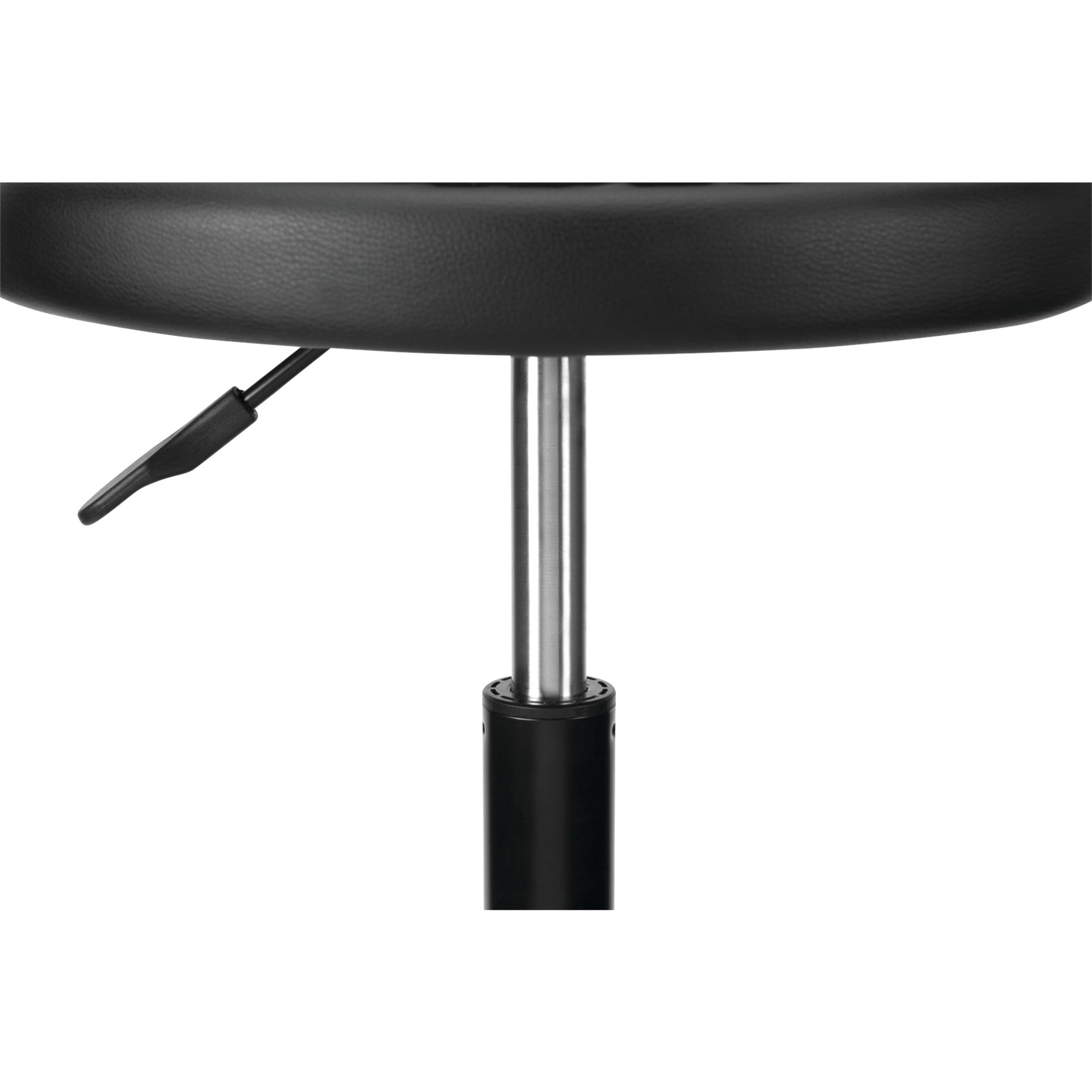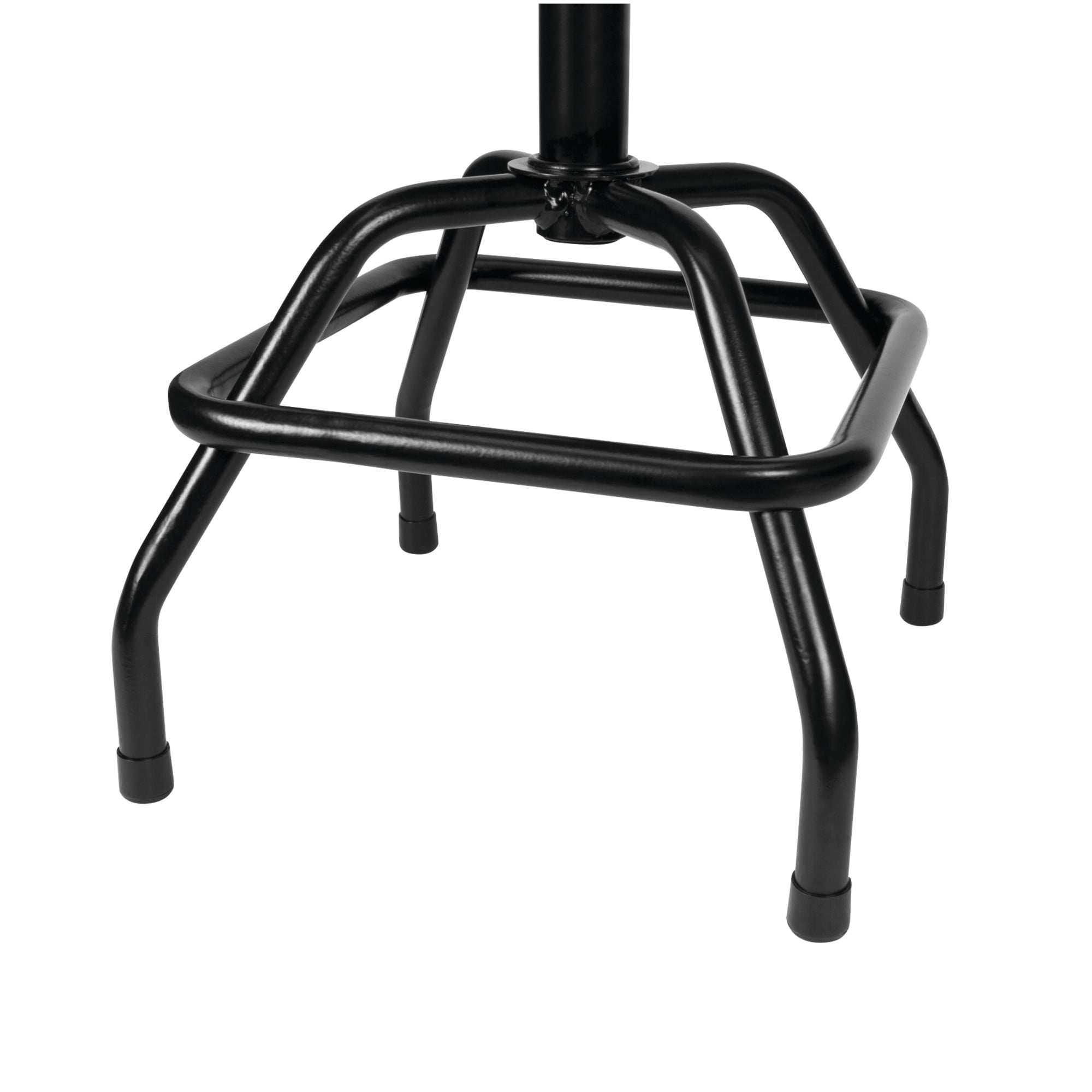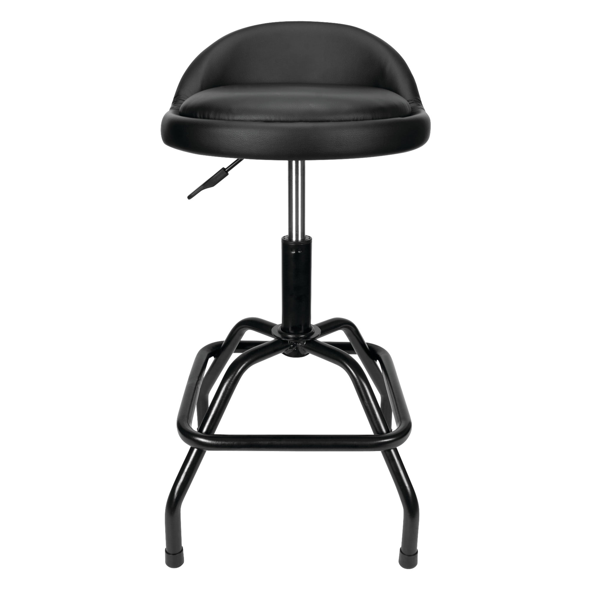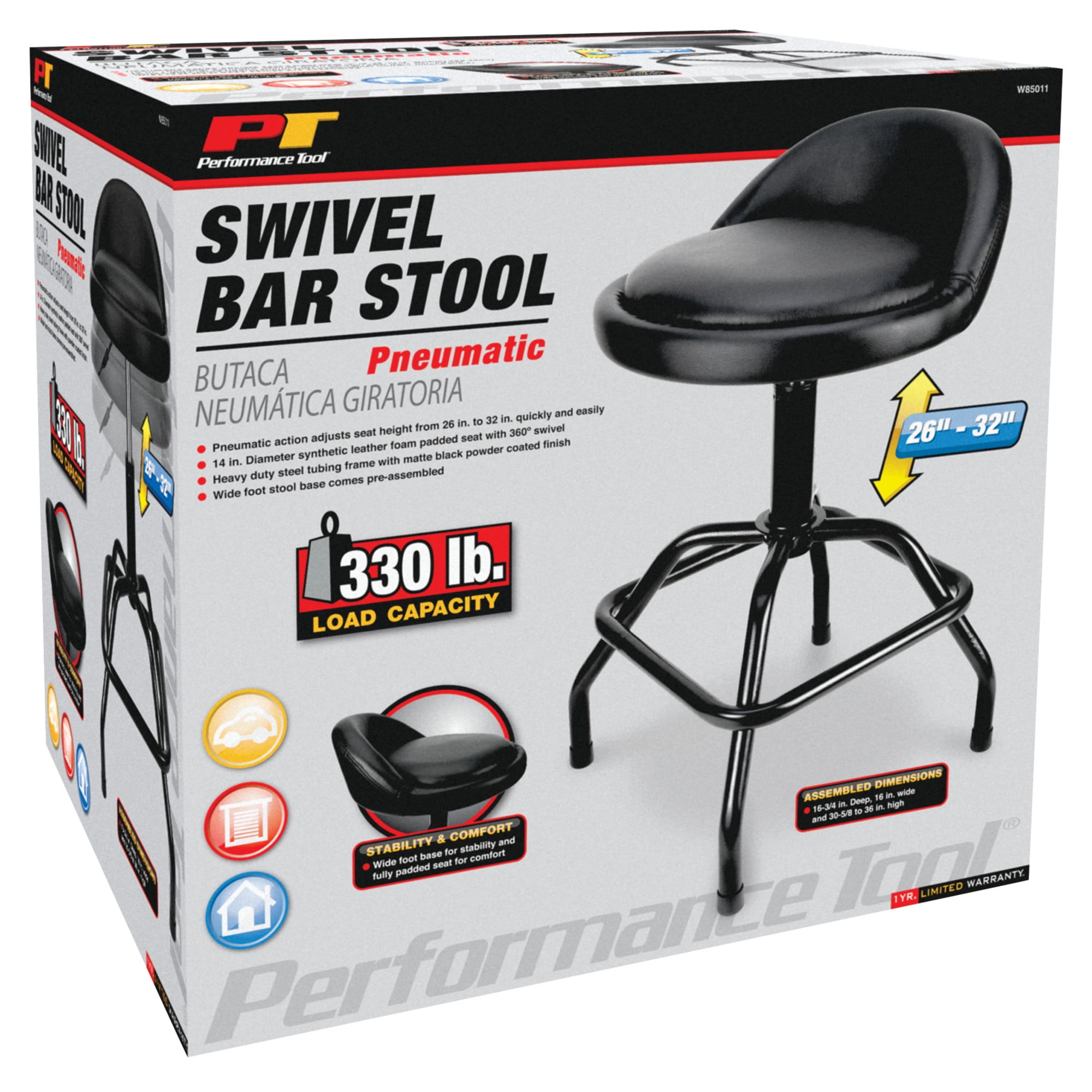 ADJUSTABLE HEIGHT: This Performance Tool W85011 Pneumatic Swivel Bar Stool allows for easy and quick adjustment from 26 in. to 32 in., making it perfect for use at various counter and table heights. COMFORT PADDING: The 14 in. diameter synthetic leather foam padded seat is designed for comfort, and the back support is designed to reduce fatigue and add support. HEAVY DUTY: Featuring a sturdy steel frame with a matte black powder-coated finish, this bar stool is built to last and withstand heavy use. 360-DEGREE SWIVEL: The swivel seat rotates a full 360 degrees, allowing you to easily reach and reposition at your workbench. STABLE BASE: The wide foot stool base comes pre-assembled and provides stability and support, and has a weight capacity of 330 lb. (150 kg); Suitable for use in various settings such as home, bar, and shop.