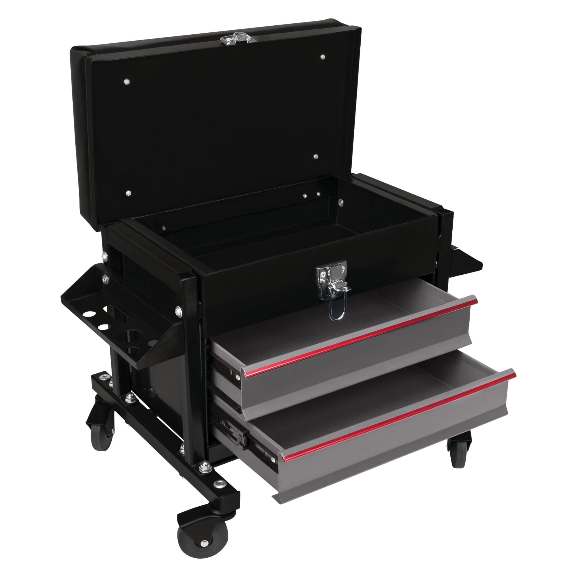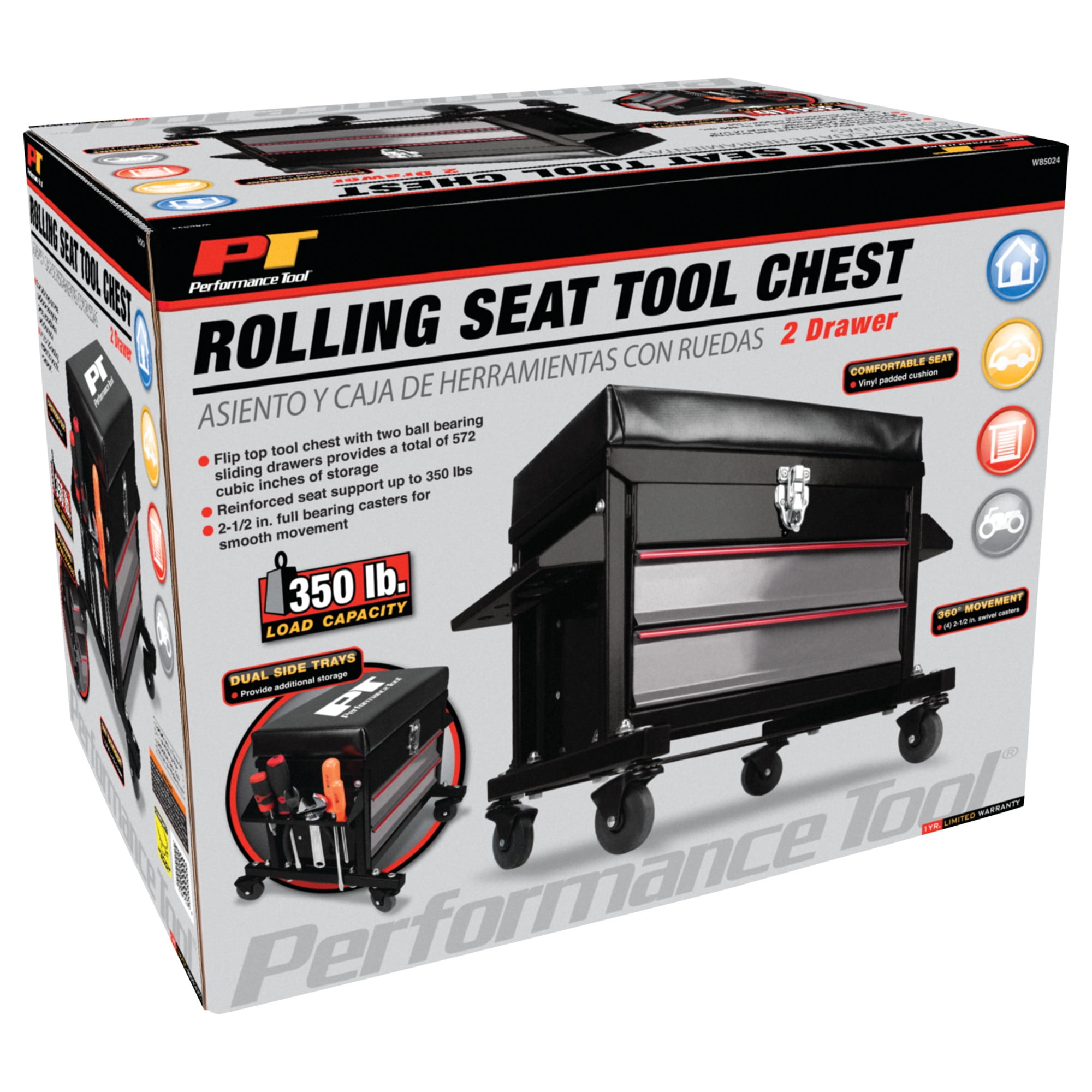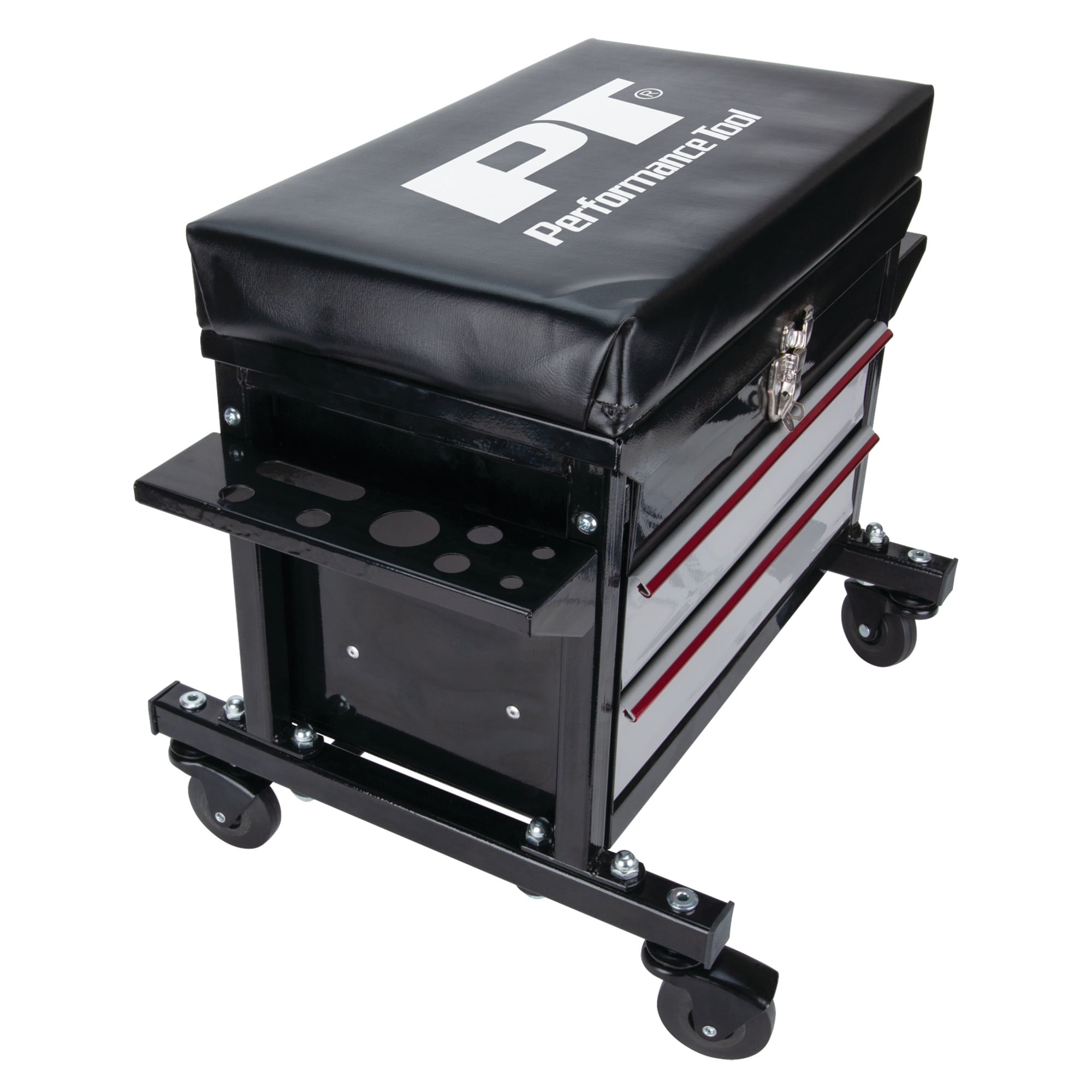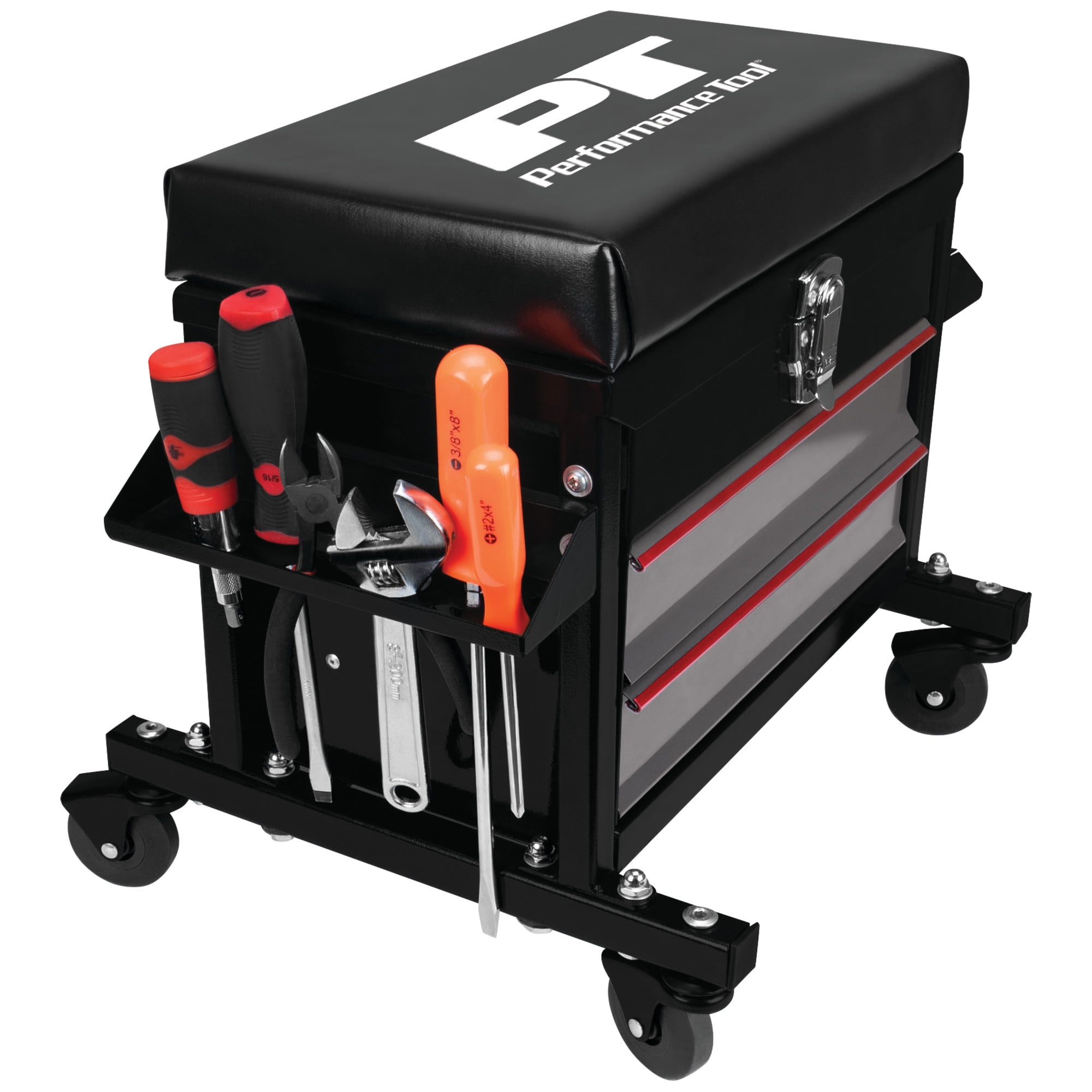 STORAGE: This Performance Tool W85024 2-Drawer Rolling Mechanic’s Seat features a flip-top tool chest with two ball bearing sliding drawers that provide a total of 790 cubic in. of storage for all your tools and accessories. CUSHIONED SEAT: The vinyl padded cushion on this seat provides comfort and support. DUAL SIDE TRAYS: The dual side trays on this seat provide additional storage for pliers, screwdrivers, and other small tools. HEAVY DUTY: With a reinforced seating surface that supports up to 350 lbs. and 2-1/2 in. full bearing casters, this seat is built tough. DIMENSIONS: Seat dimensions 16 x 9 in. (40.6 x 22.9 cm); Chest storage area dimensions: 13-1/2 x 8-3/4 x 3 in. (34.3 x 22.2 x 7.6 cm); Drawer dimensions are 12-1/2 x 7-3/4 x 2-1/4 inches (31.8 x 19.7 x cm).