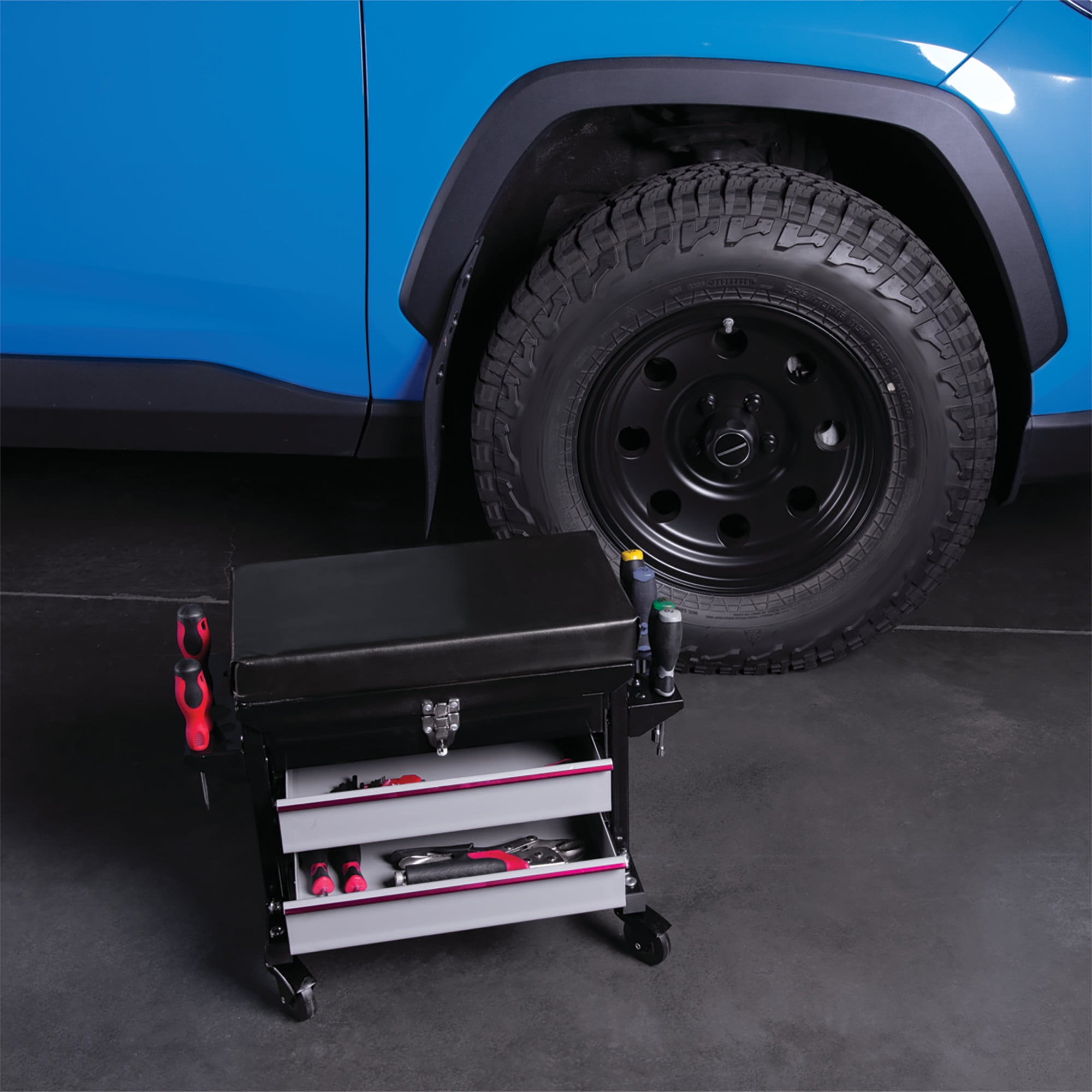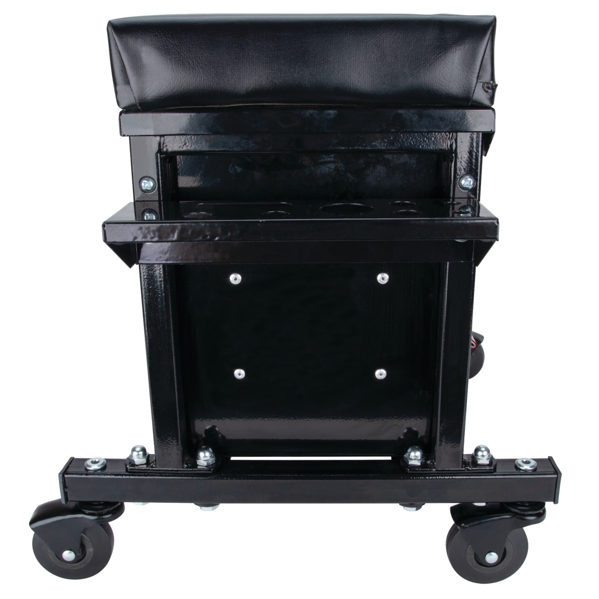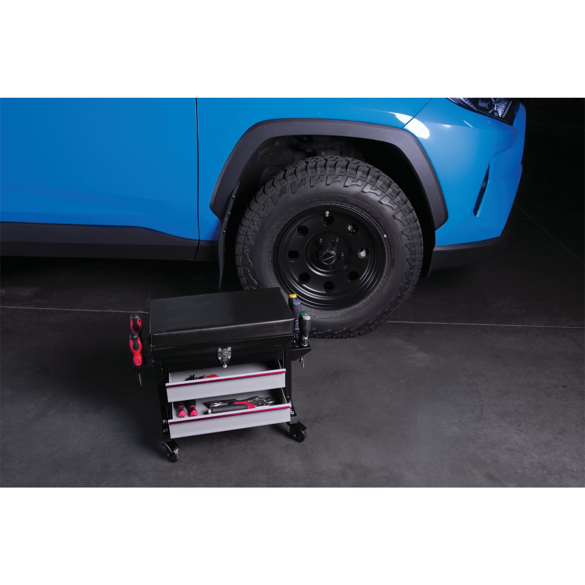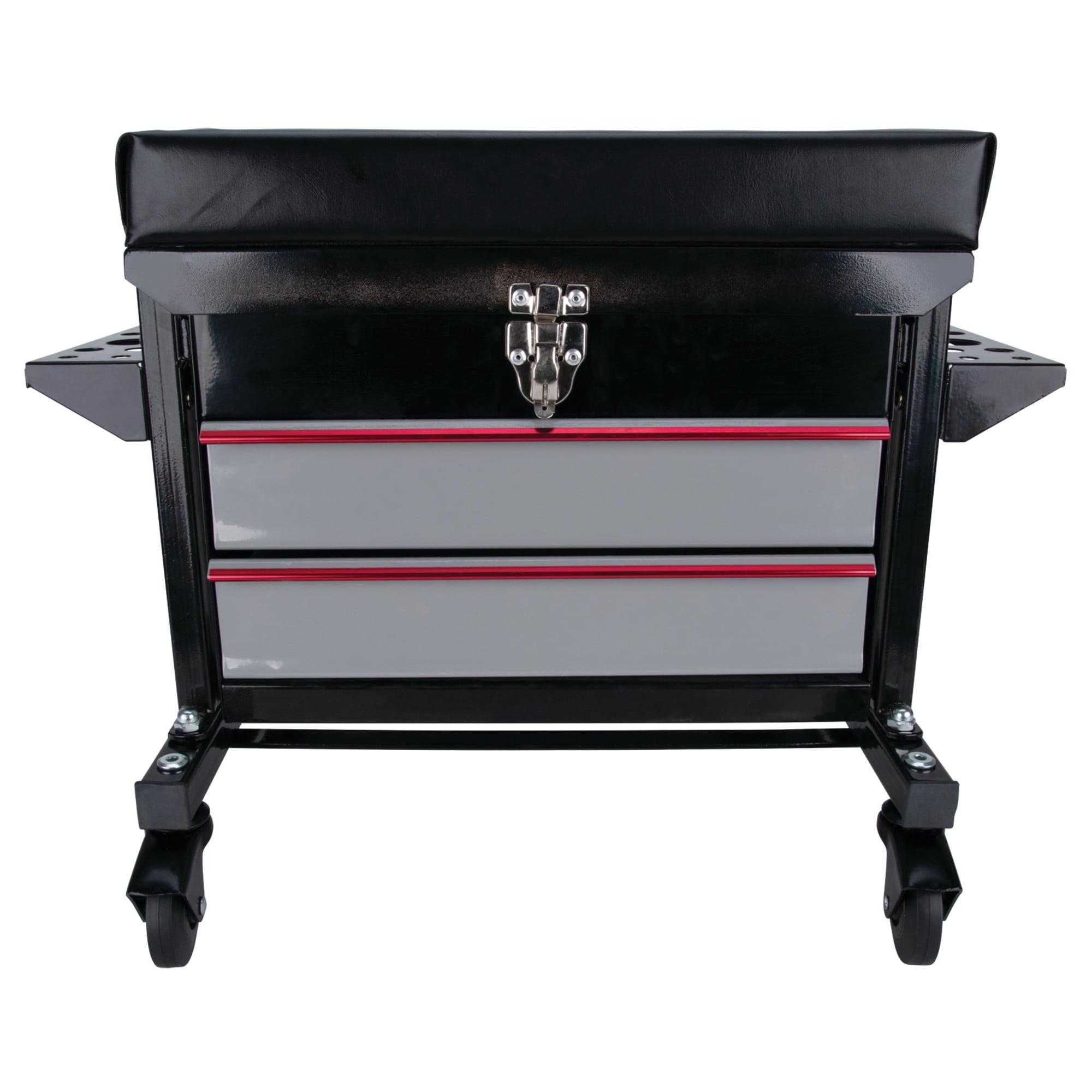STORAGE: This Performance Tool W85024 2-Drawer Rolling Mechanic’s Seat features a flip-top tool chest with two ball bearing sliding drawers that provide a total of 790 cubic in. of storage for all your tools and accessories. CUSHIONED SEAT: The vinyl padded cushion on this seat provides comfort and support. DUAL SIDE TRAYS: The dual side trays on this seat provide additional storage for pliers, screwdrivers, and other small tools. HEAVY DUTY: With a reinforced seating surface that supports up to 350 lbs. and 2-1/2 in. full bearing casters, this seat is built tough. DIMENSIONS: Seat dimensions 16 x 9 in. (40.6 x 22.9 cm); Chest storage area dimensions: 13-1/2 x 8-3/4 x 3 in. (34.3 x 22.2 x 7.6 cm); Drawer dimensions are 12-1/2 x 7-3/4 x 2-1/4 inches (31.8 x 19.7 x cm).