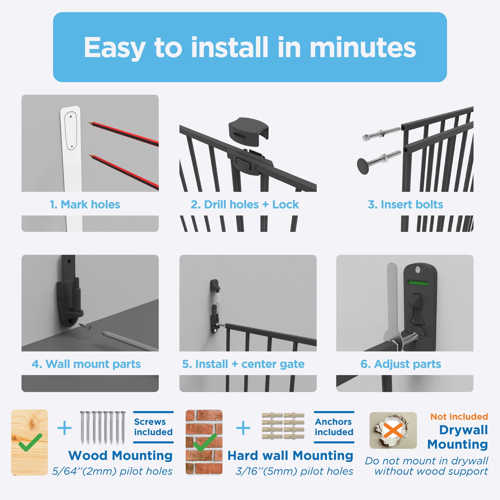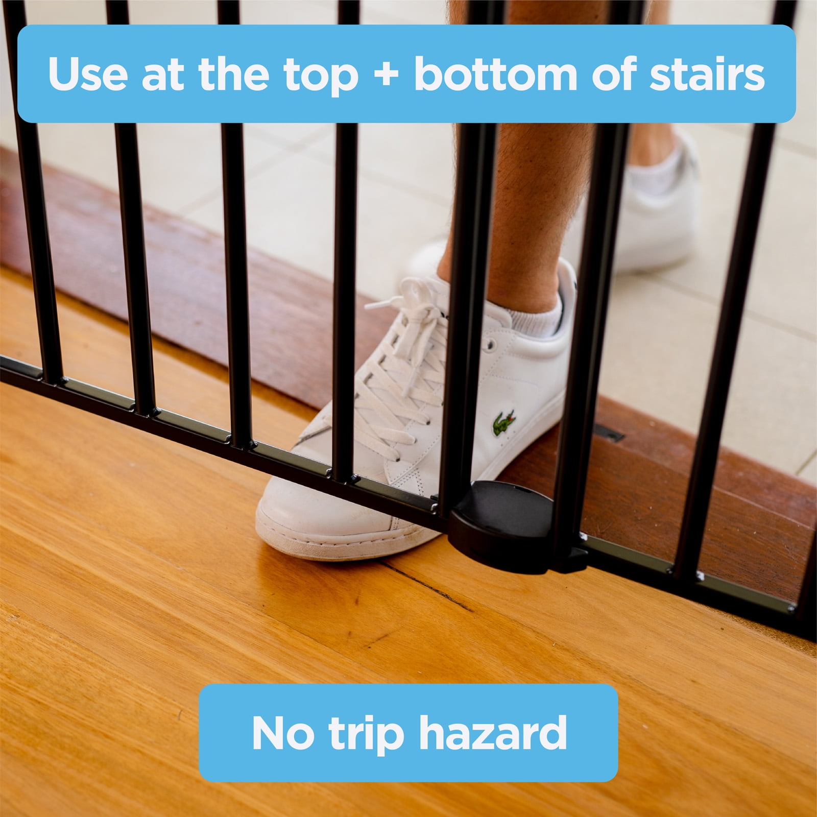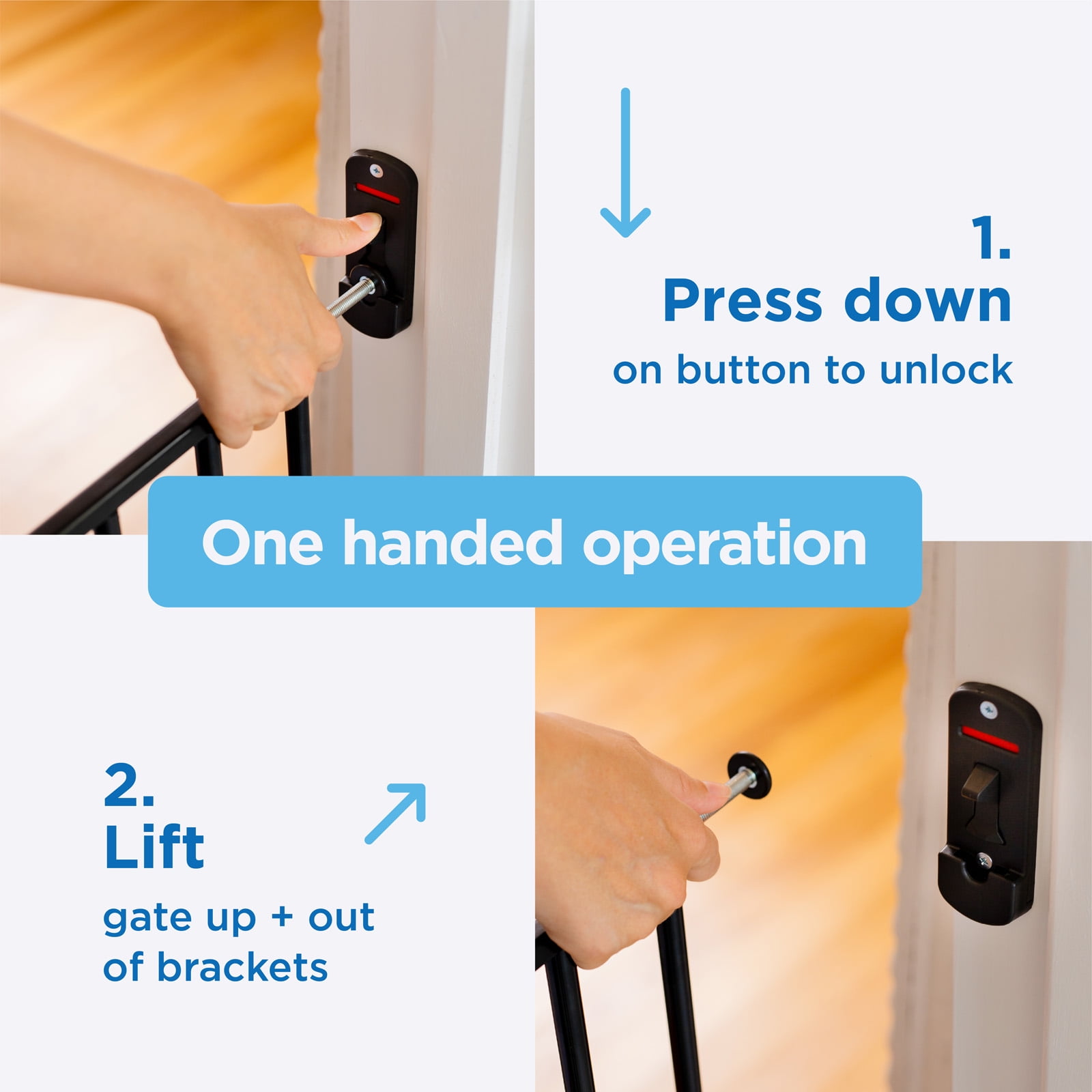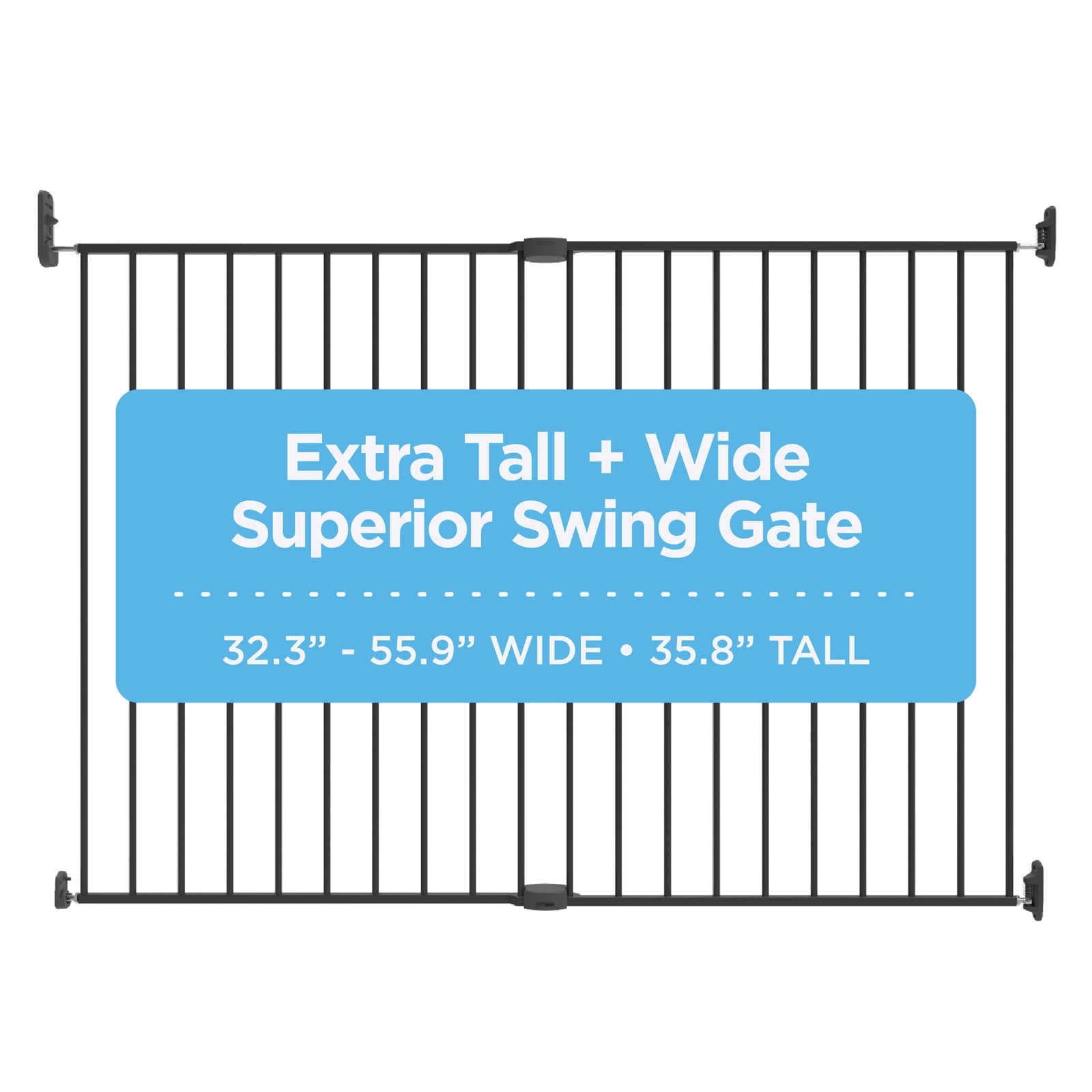 PRODUCT DETAILS: This Extra Tall & Wide Superior Swing Gate fits extra wide openings 32.3″-55.9″ and measures 36″ tall; one-handed operation with red/green locking indicator, swing direction control and snap connectors for quick assembly. NO TRIP HAZARDS: Mount securely to the wall, this barrier hangs from its mounts instead of resting on the floor like other baby gates. ONE-HANDED OPERATION: Perfect for busy parents, the one-handed operation allows you to easily open the gate and securely close while holding your child, safe and secure locking indicator shows green when gate is securely locked. 2-WAY DIRECTIONAL CONTROL: Ideal for limiting access around doorways and stairs, set gate to only open from one side or allow access from both sides. CHILDREN & PETS: Built for functionality, this Extra Tall & Wide Superior Swing Gate is ideal as an infant gate and a pet gate to keep mischief contained by providing a safe, closed off environment to play. Suitable for infants 6-24 months of age and pets 10-40 pounds. STURDY METAL FRAME: Robotically welded steel for superior strength, nylon components for durability and powder coated for the perfect finish. Ideal for high traffic hallway locations.