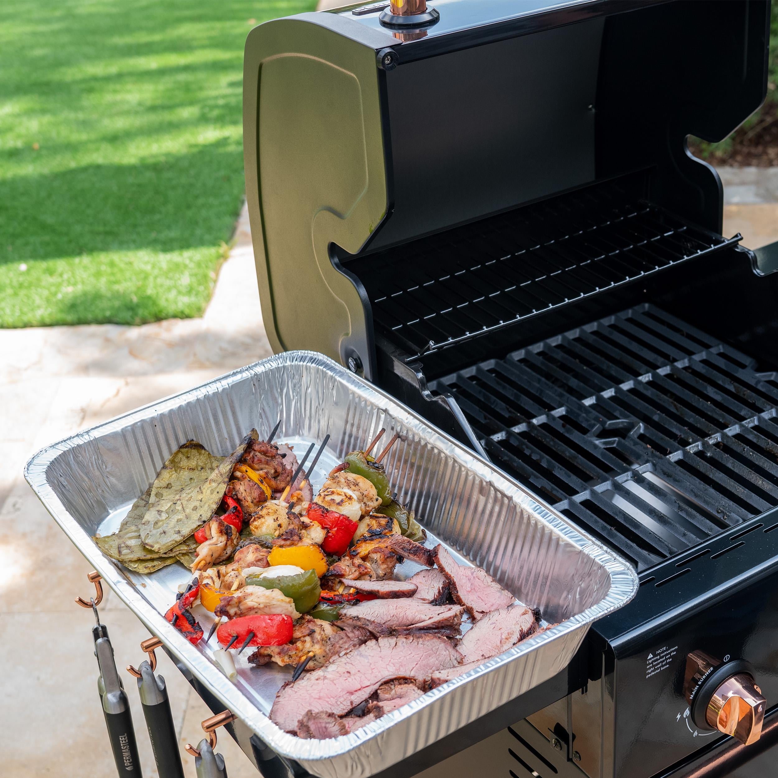 Permasteel 2-burner compact liquid propane gas grill 360 square inches of combined cooking surface for up to 4-6 people Cook up to 16 burger patties at once Compact, space-saving design with folding side tables for extra prep space Porcelain-coated cast iron cooking grates allow for even heat distribution and heat retention Includes warming rack and S-hooks for grilling tools Easy to clean Electronic ignition for easy start 1-year limited grill and burner warranty Brand: Permasteel Measures: 43.2” W x 21.5” L x 47.8” H Weighs: 79.4 lbs