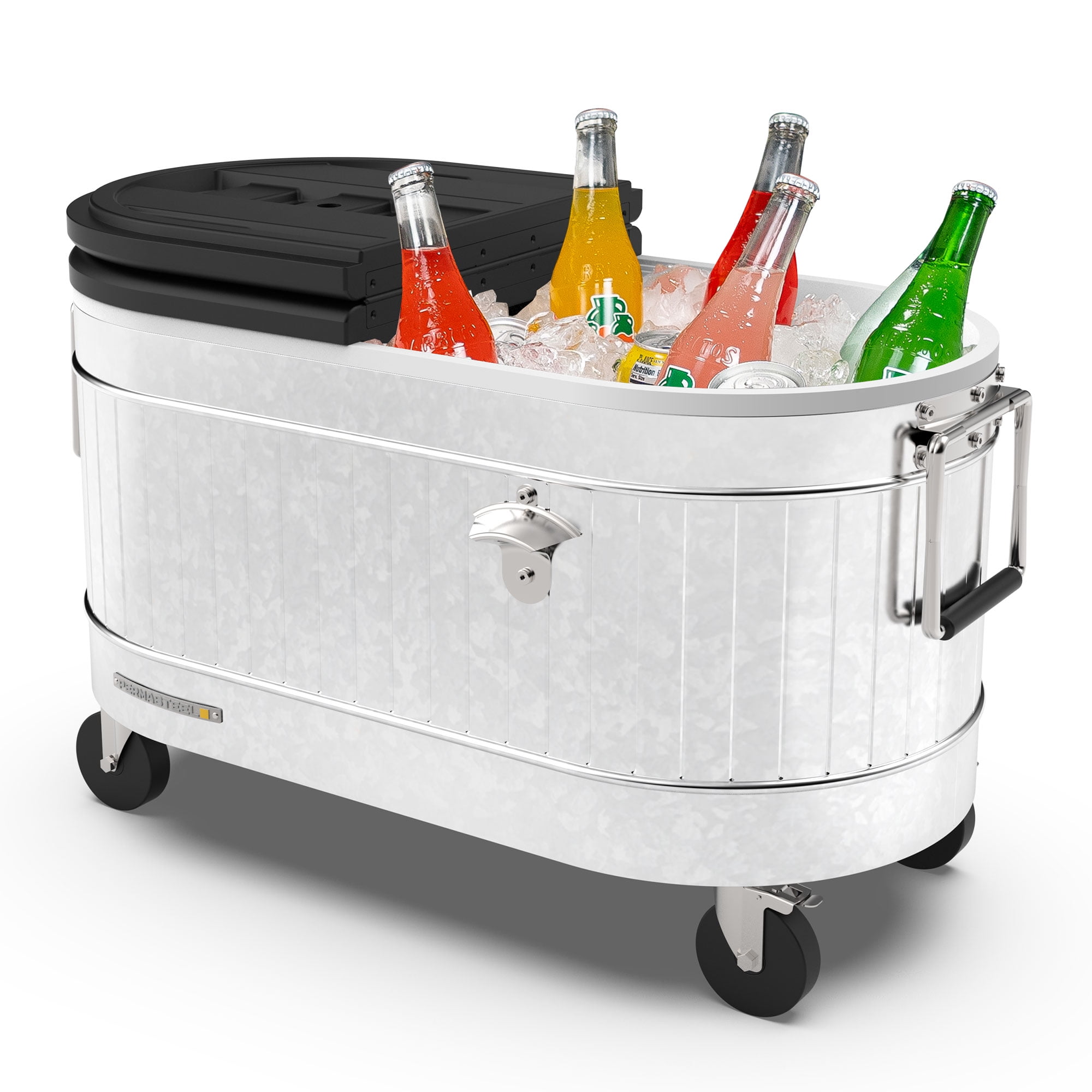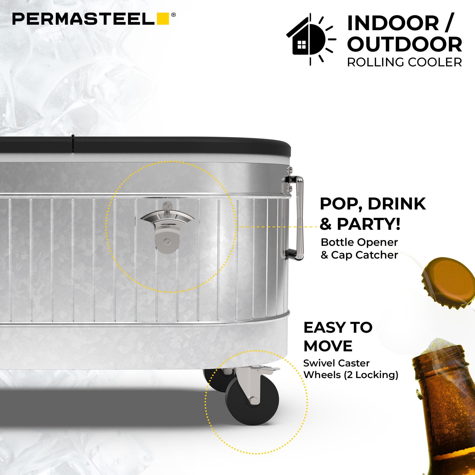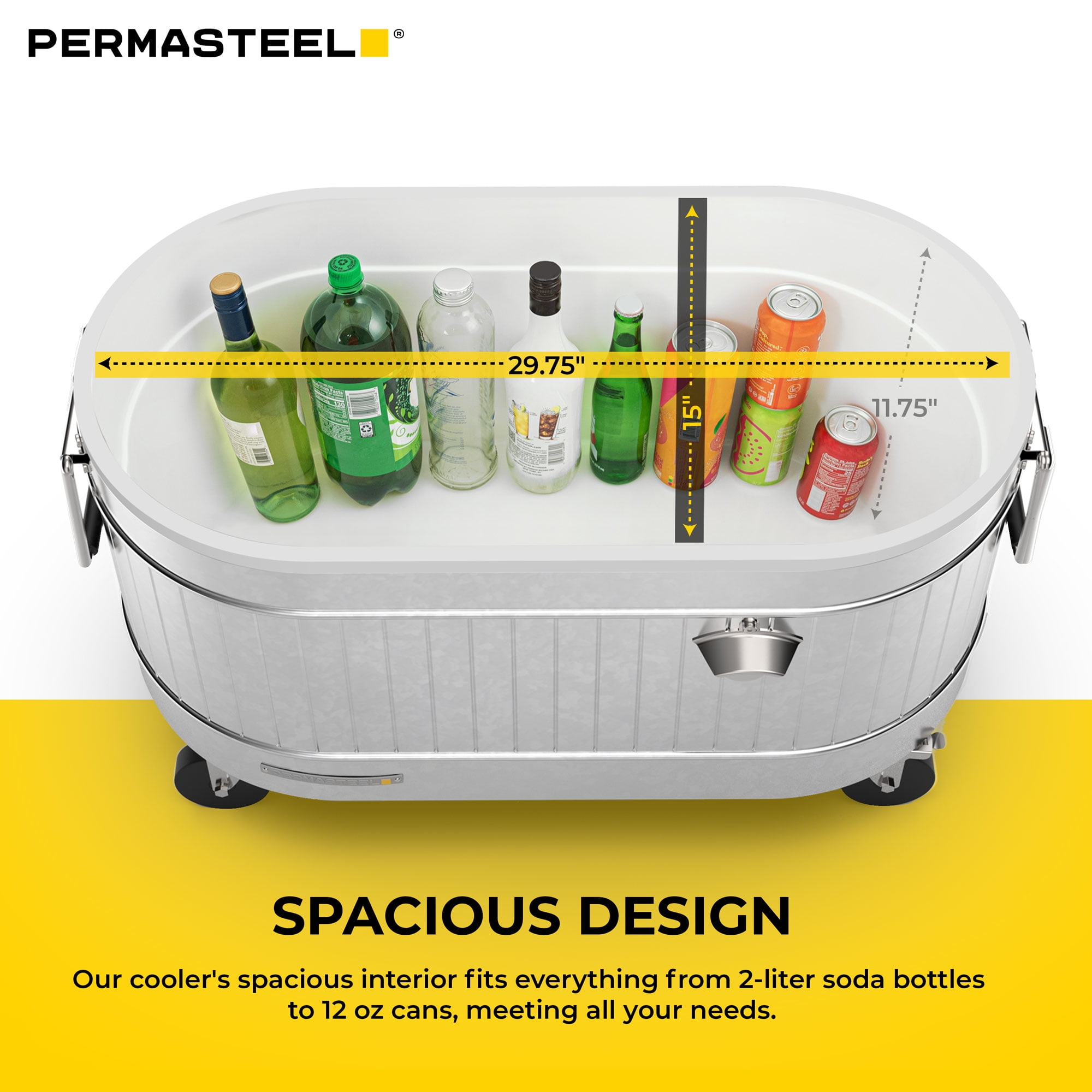Permasteel Galvanized Cooler with Wheels, Offers 36-Hours Of Ice Retention, Fits Up To 110 Cans (or 24 Wine Bottles), Heavy Duty Casters, Threaded Drain Plug, Built-In Bottle Opener