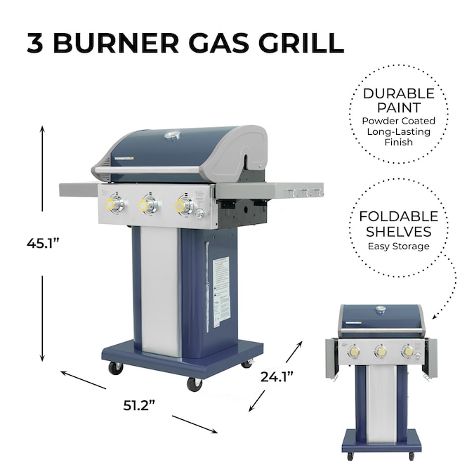 - Permasteel 3-burner compact liquid propane gas grill, 51.2” W x 24.1” L x 45.1” H, 78.3 lbs