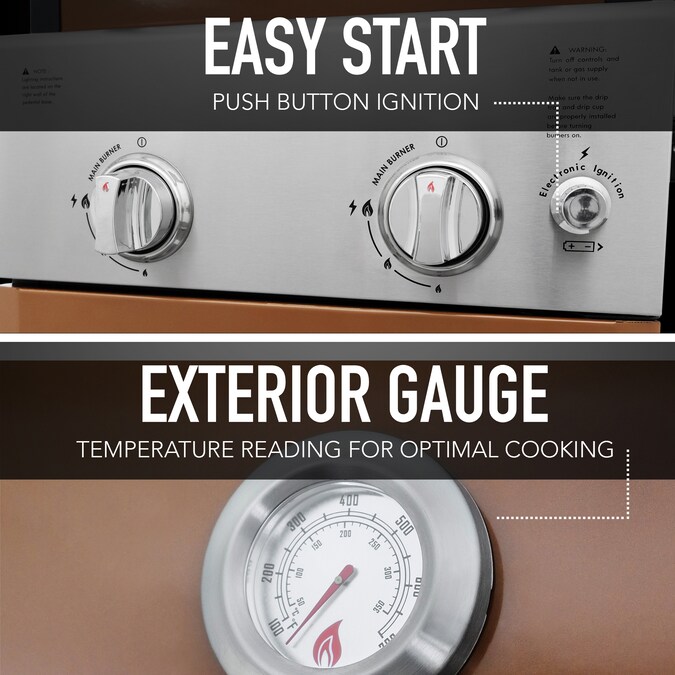 - Porcelain-coated cast iron cooking grates allow for even heat distribution and heat retention, are easy to clean, and comes with electronic ignition to start grilling right away