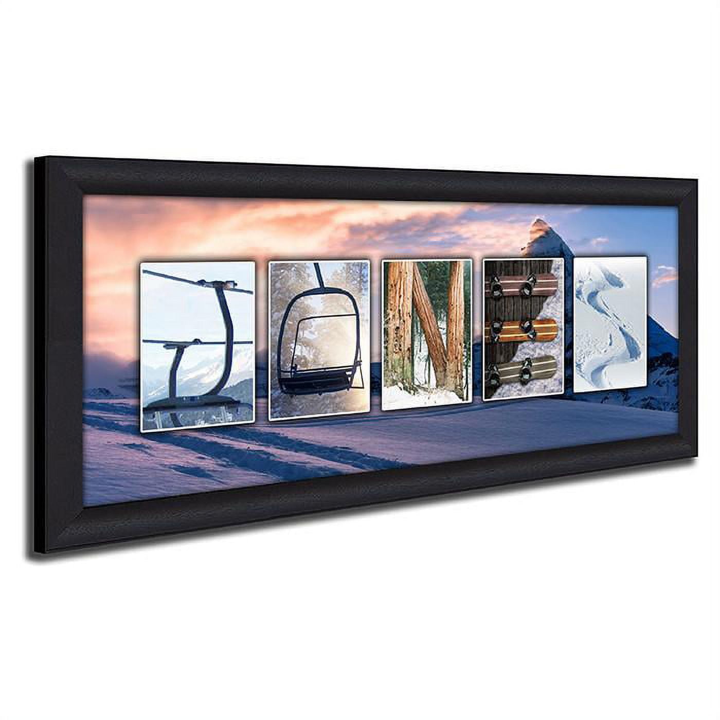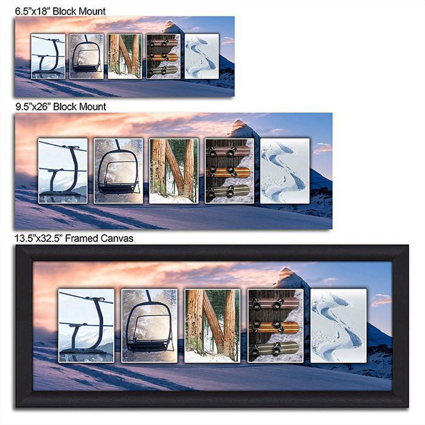 Personalized with your name and customized with your choice of photos, this stunning work of wall art is created using hi-res photography of mountains, slopes, powder, and snowboards! Display on the wall your passion for everything snowboarding. From the photography to publishing to shipping, everything is hand crafted in house at a family owned and operated Colorado art studio. Comes ready-to-hang as a frameless wood block mount or a framed canvas giclée. Each print also includes a certificate of authenticity. This custom art is as unique as he is and a perfect gift for him, for a boy’s room, for the holidays, for the home, for the family, for the snowboarder, or even for mountain chalet. Wood Block Mount: Our wood block mount is a contemporary and frame-less way to have your print displayed. The image is professionally sealed behind a glossy artist’s laminate atop a 3/8” thick wooden block using an acid-free adhesive. The sides of the block are black and comes ready to hang on the wall. Framed Canvas Giclee: Published as a giclee on fine art canvas and finished in a custom wood frame, this personalized canvas wall art is coated with a UV resistant spray and, like all canvas art, does NOT require glass. Framing is done in-house using acid free archival materials. Comes ready to hang and enjoy!