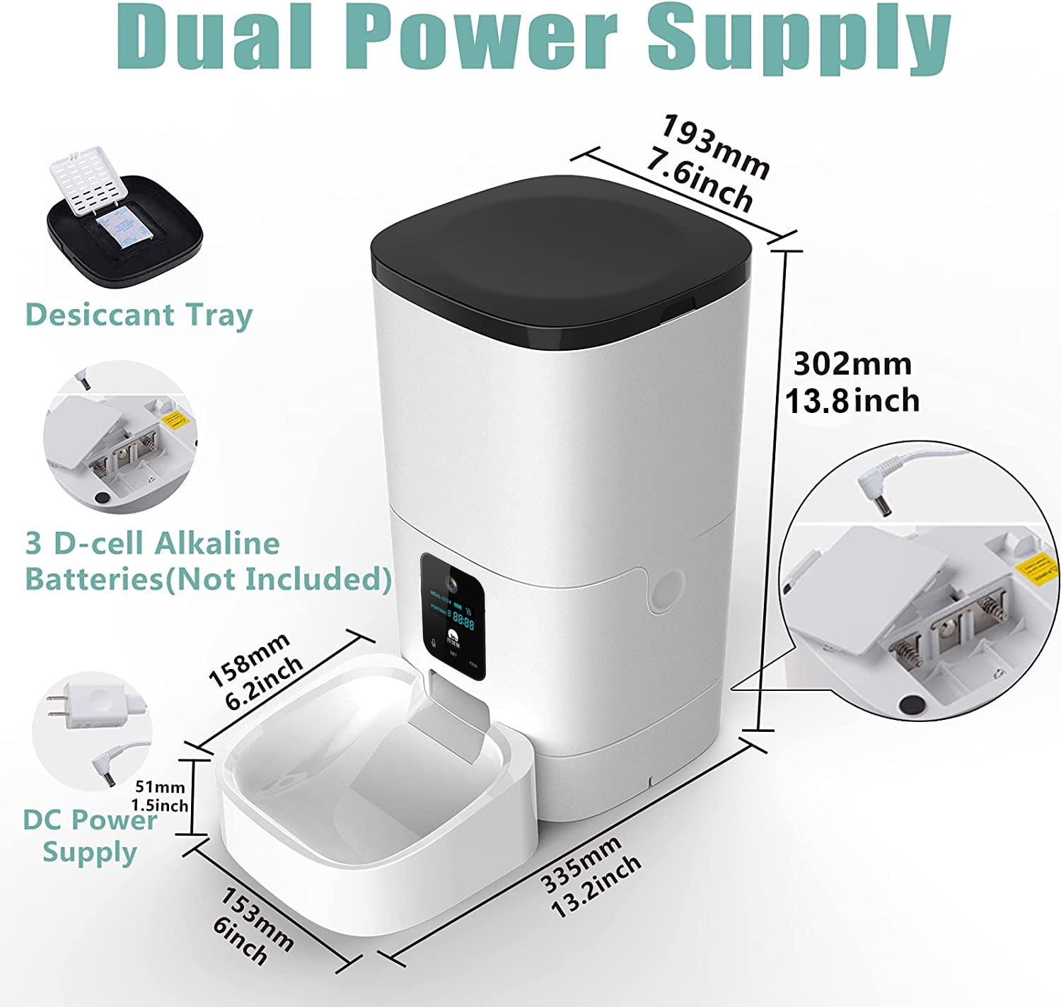 ????1080P Full HD Camera????With a 1080P Full HD camera. Keep you and your pet close with our high resolution camera.Connect with your pet while you are away with the supported audio chat/recording. Keeping track of your pets even when you are not home with the Smart app. You can record videos or take photos for your pet. ????Smart APP Feeder????Automatic cat feeder is easily feed your cat&dog through the mobile app and set the feeding time and amount of food anytime, anywhere.This Automatic feeder is easy to set up and program with up to 20 portions per meal (about 7.5g per portion).By setting the fixed amount, you can give an appropriate amount of food to manage a healthy diet. ????10s Customized Feeding Call????This automatic feeder has a recording function of about 10 seconds.Automatically broadcast to remind your pets that it’s time for meal and they will not feel lonely anymore while hearing your voice recording. Even when working overtime, short-term business trips, traveling, or oversleeping, your cat or dog can eat with peace of mind while listening to your voice. ????2 Way Audio & Material Friendly????10s voice recording to playback to remind your pet at mealtime (you can also easily cancel it). pet feeder’s built-in advanced microphone and speaker allow you to keep in touch with your pet in real-time, even when you’re away. This two-way communication feature lets you hear your pet’s response while calling them, making feeding times more interactive and less lonely. ????Support 2.4G & 5G WIFI????Automatic Feeder can be used without subscribing to cloud storage.Wi-Fi Camera cat feeder is 5GHz and 2.4GHz WiFi-enabled, allowing you to program and monitor your pet’s meals anywhere, anytime through the App for iOS and Android phones. Enjoy peace of mind, whether at work or on vacation, you can rest assured that your pet will never go hungry with our reliable and convenient feeder. ????USB & Battery Powered????This product is a 2 way type automatic feeder that can be powered by two methods, the 5V adapter USB power cable or a portable 3 D-cell battery-powered (not included)feeding station. Choose between a fixed wired connection with Flexible options prevent your pet from going hungry during power outages. ????6L LARGE CAPACITY????larger capacity ensures consistently provide food for your cats and dogs (cat about half a month, and dog for about a week). The pet feeder will stay enough food when you’re out for a short vacation or work a long time, and the desiccant bag will keep food dry and fresh. What’s in the box: Automatic Pet Feeder(6L) x 1 Power Adapter x 1 User Manual x 1 Please Note: 1.Please use the original power adapter. 2. Suitable for cats and small to medium dogs. 3.Fill in dry pet food only 【Full and Easy Instructions】 1. Environment: IOS 7.0 or Android 5.0 and above. WiFi need to be supported 2. Download APP: scan QR code on user manual and download APP from app store 3. Before Setting: make sure pet feeder within 10 meters, WiFi turned on and pet feeder connected to electric power 4. Setting: open APP and sign up, then log in. Click ‘Add Device’, then click ‘Small Appliance’, then find ‘Pet Feeding’. Enter WiFi password, then you can see the indicator light flashing(if not, please wait for a while or press reset for 5 seconds then wait for flashing). Then click ‘Next Step’. Wait for several minutes for successful connection 【Attentions】 If not successfully connected, try changing easier WiFi password(avoid special symbols like @$!-) Try changing easier WiFi name(avoid non-english name) Try reset the feeder by press ‘Reset’ button for 8-10 seconds or unplugged then start again 【After sales services】 If you have any questions, you are very welcomed to drop iquiry via email, we promise reply in 24 hours. We appreciate your precious feedbacks to help us improve and grow.