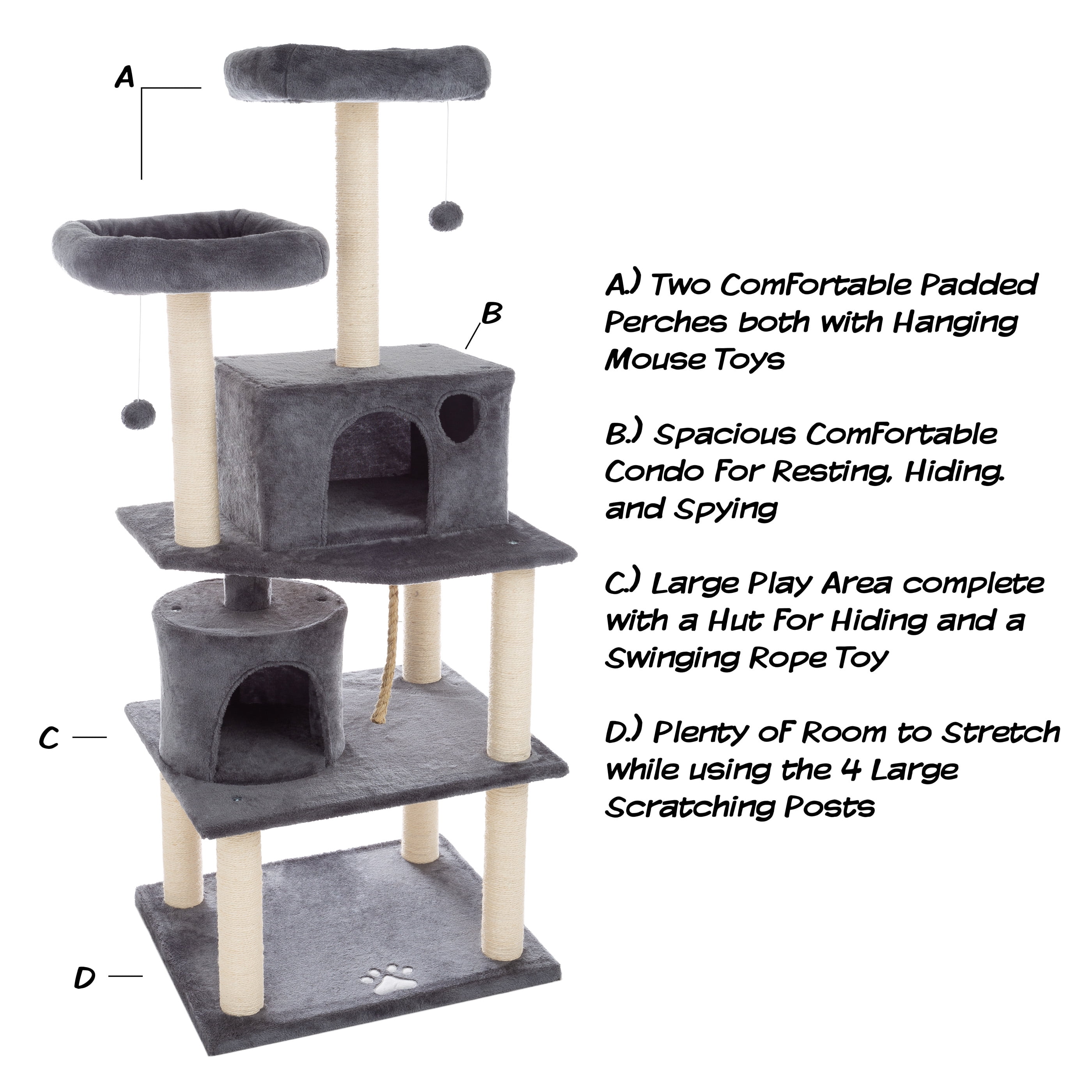 5-TIER TALL CAT TREE – Equipped with 2 hanging mouse toys and a dangling rope, this cat tower for indoor cats offers plenty of places to play, nap, hideout, and climb over 5 levels for hours of fun. A CAT NAPPER’S DREAM – Your feline friends can rest easy in either of the 2 padded perches, hideout in the round kitty hut, or snuggle with a friend in the large cat condo. SISAL SCRATCHING POSTS – The 8 sisal rope scratch areas help deters your pet from using your furniture to sharpen their nails while being at the ideal height for stretching and scratching for cats of all ages. PLUSH AND STURDY – This cat tower for large cats is constructed of durable MDF and covered in a plush polyester fabric with a rectangular base sturdy enough to withstand vigorous play. MATERIALS – Polyester, Sisal Rope, and MDF; Care Instructions: Light Vacuum or Spot Clean. DIMENSIONS – (L) 24″ x (W) 20″ x (H) 58.75″; Perches: (L) 14.75″ x (W) 14.75″. COLOR – Dark Gray.