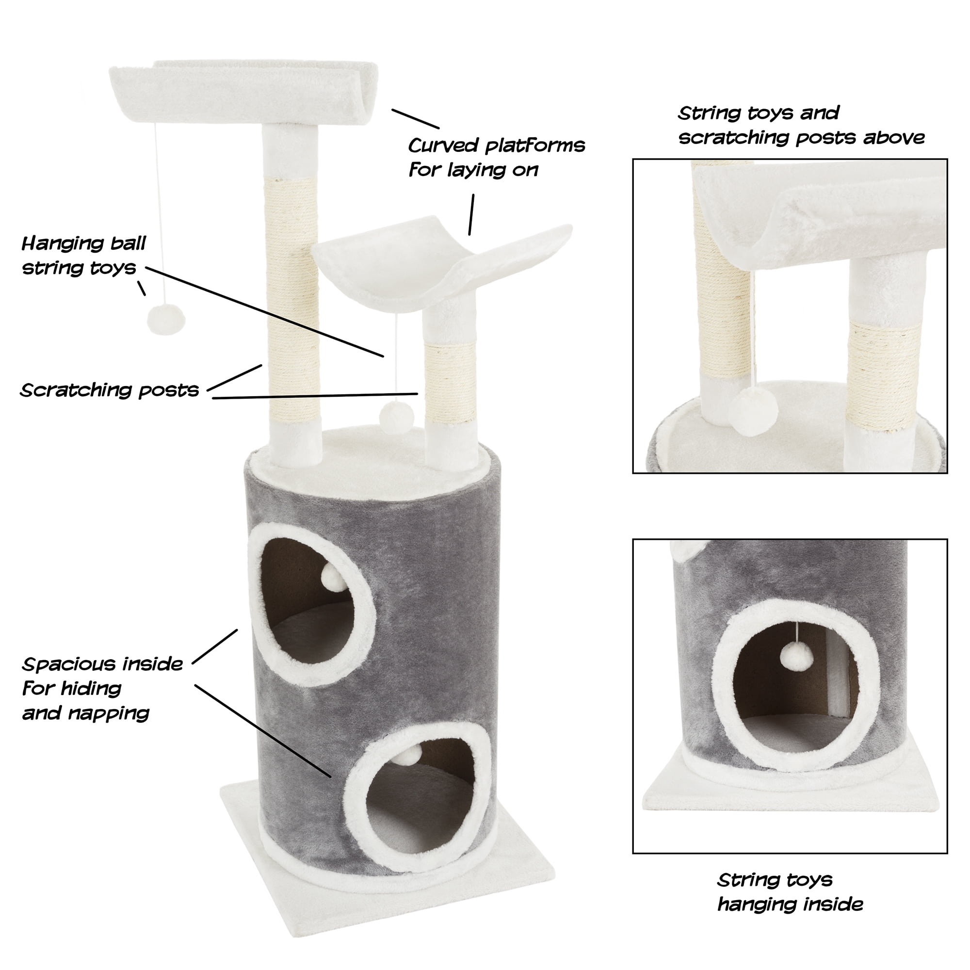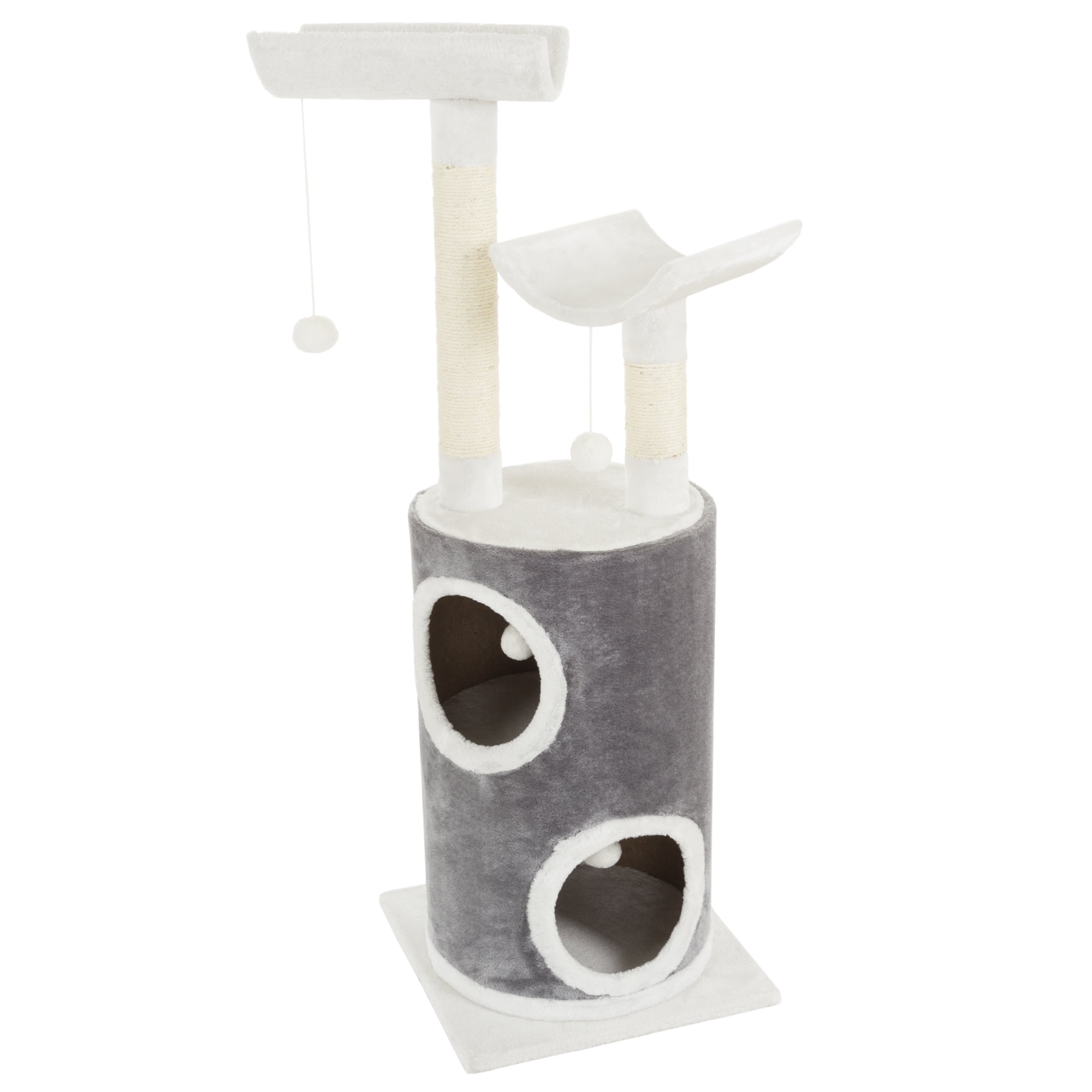 Spot clean or hand vacuum Particle board construction covered in 100% polyester plush fabric, sisal scratching post 15.75 inches L x 15.75 inches D x 44.75 inches H Recommended for all cats and kittens 10 weeks or older Gray and white