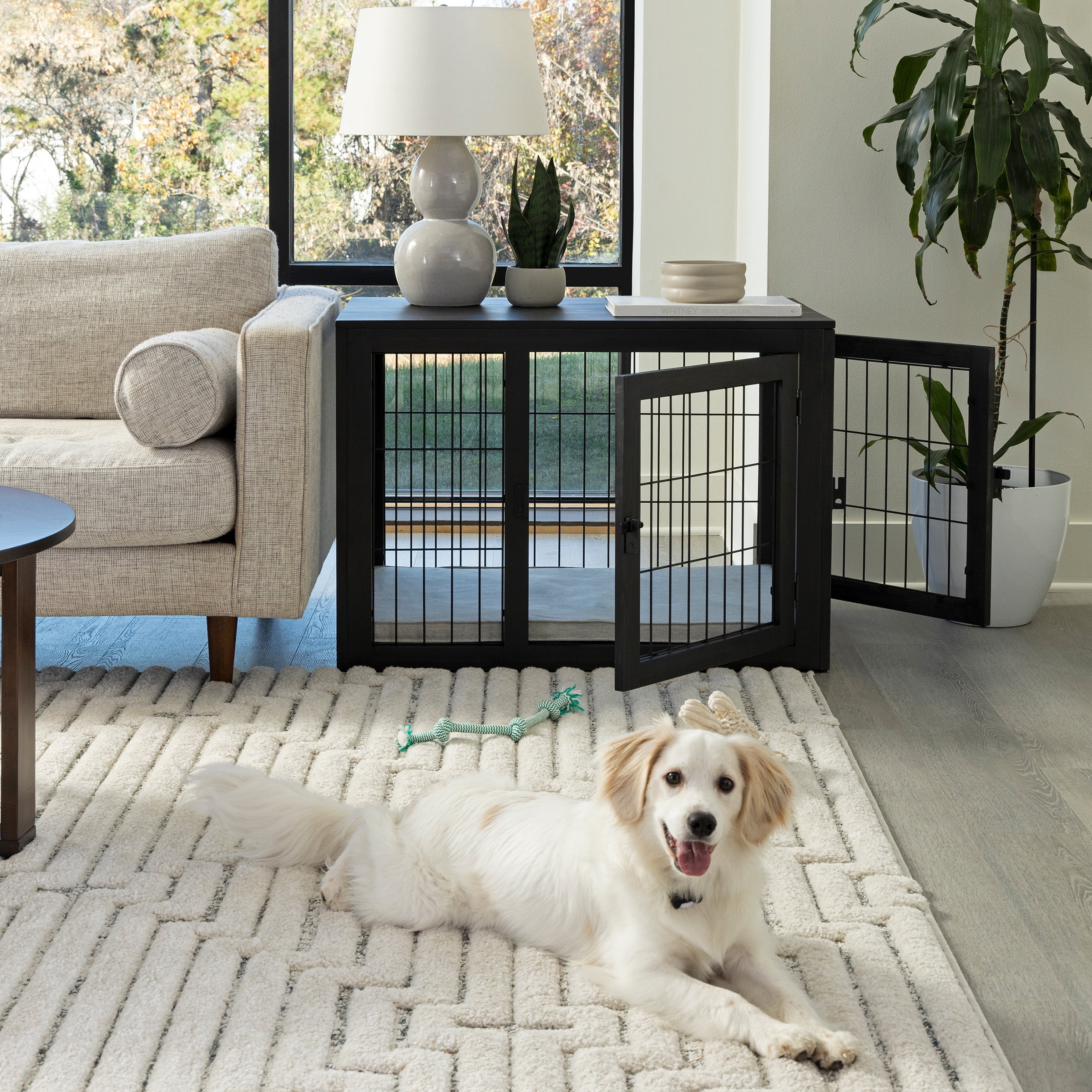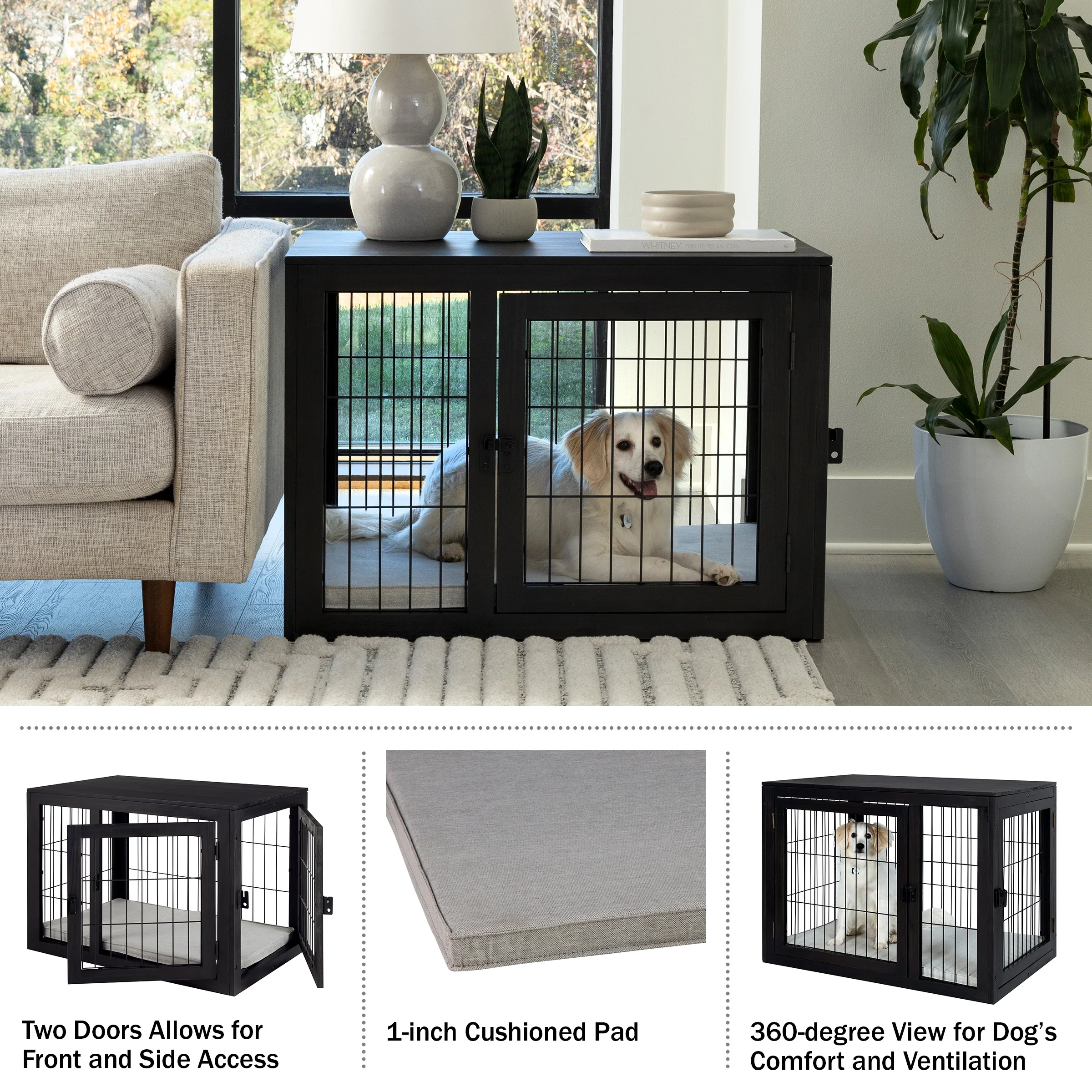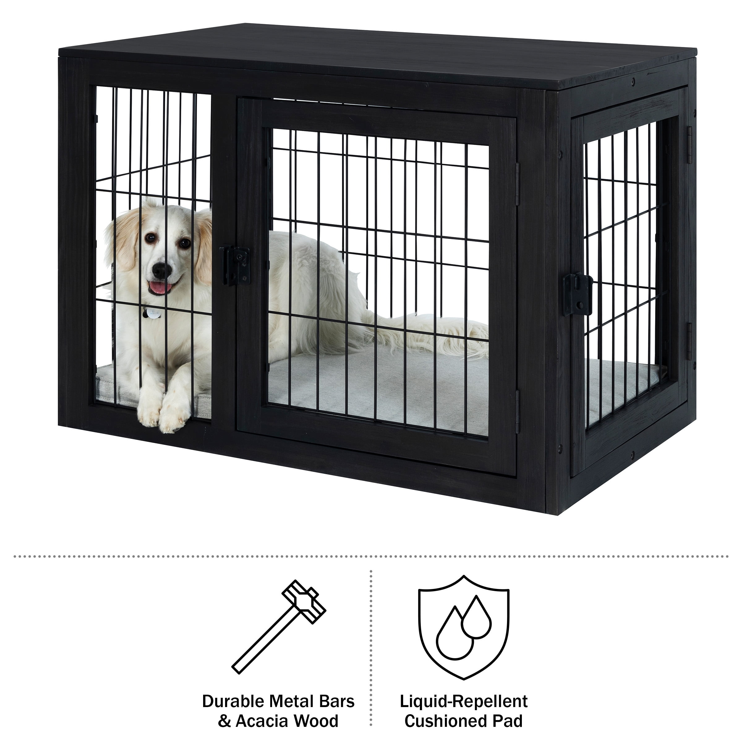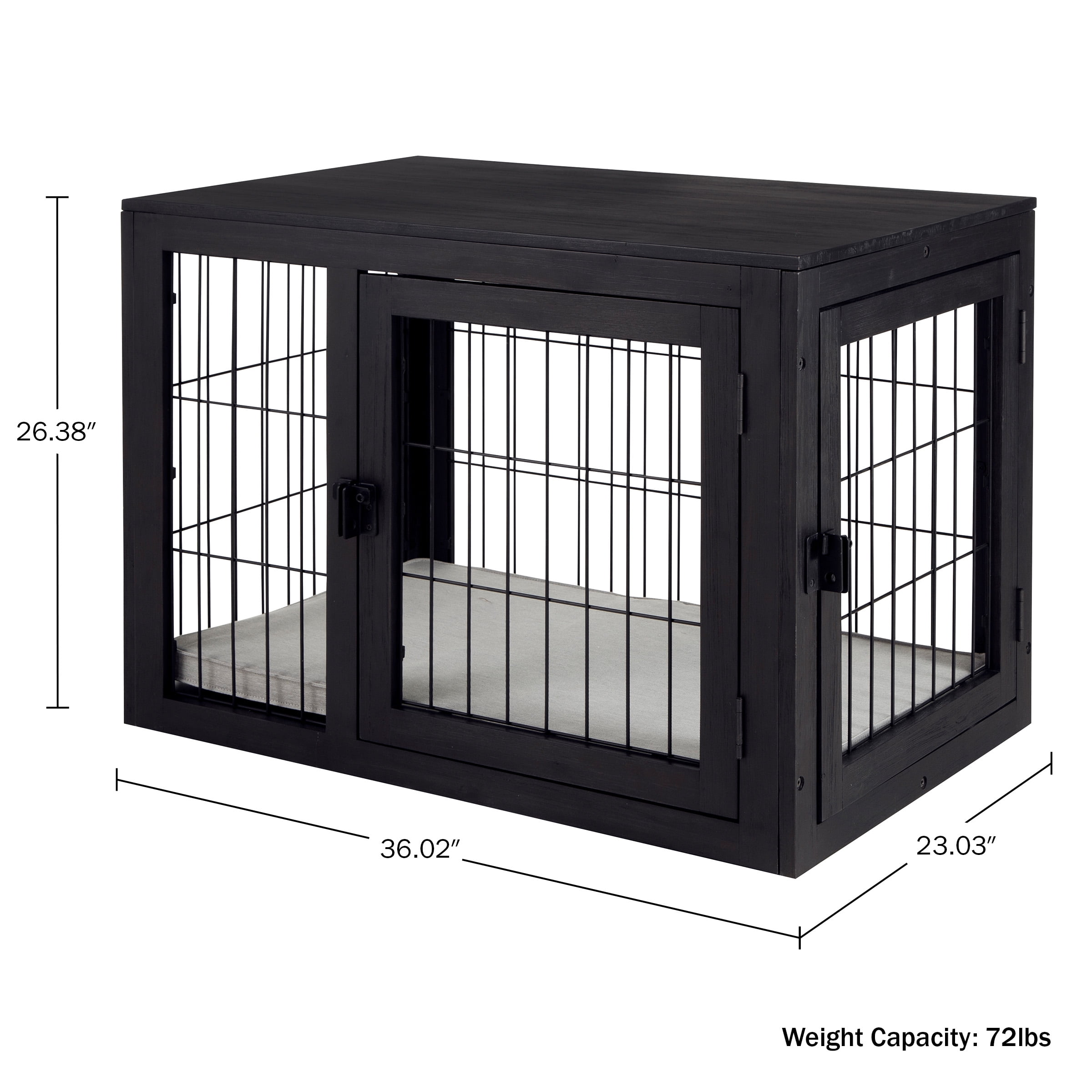 MEDIUM DOG KENNEL – This 36-inch dog cage provides training, containment, and a home for your furry friend while also serving as an end table, side table, or nightstand. COMFORTABLE DESIGN – The heavy-duty dog crate is equipped with two doors, a 1-inch cushioned pad that is removable for cleaning, and a 360-degree open view so your dog can get plenty of ventilation. DURABLE – This pet crate is made of metal enclosure bars, durable acacia wood, and liquid-repellent fabric on the included cushioned pad to ensure this dog crate table looks great for years to come. MODERN DECOR – This dog kennel blends seamlessly in with your existing décor and features a wide top, perfect for lamps, framed pictures, plants, and more while your pet rests comfortably underneath. MATERIALS – Acacia Wood, Metal, and Polyester Cushion; NOTE: The Wood is Not Chew-Proof. DIMENSIONS – (L) 36.02″ x (W) 23.03″ x (H) 26.38″; Weight Capacity: 72lbs. COLOR – Black and Gray.