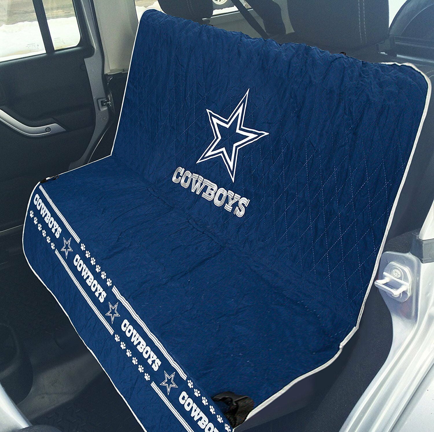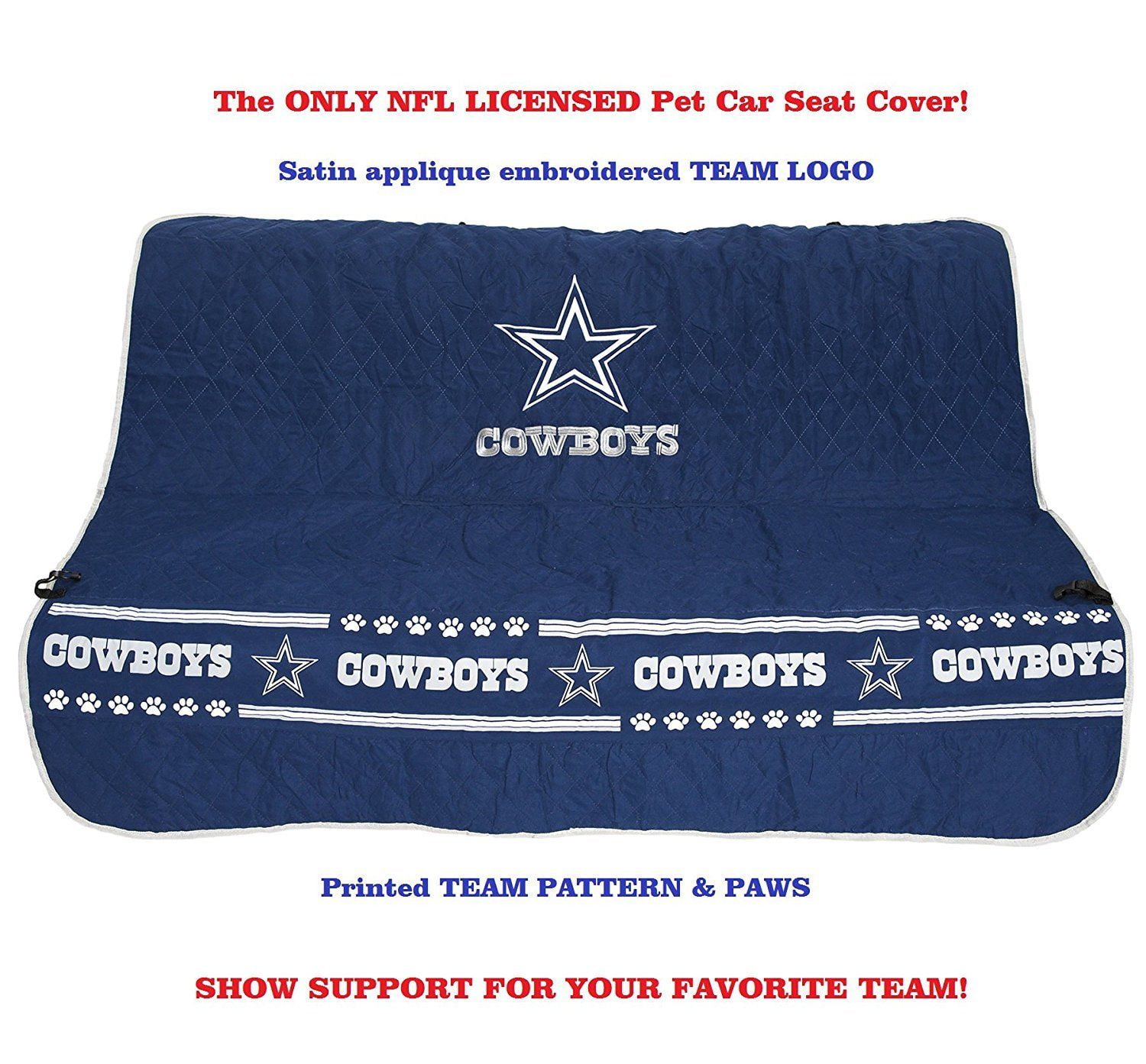 Pets First NFL Dallas Cowboys Car Seat Cover: Official NFL Licensed Soft quilted ultra-suede loop Team logo embroidery Printed team band across the bottom Contrast trim Skid-proof material on bottom