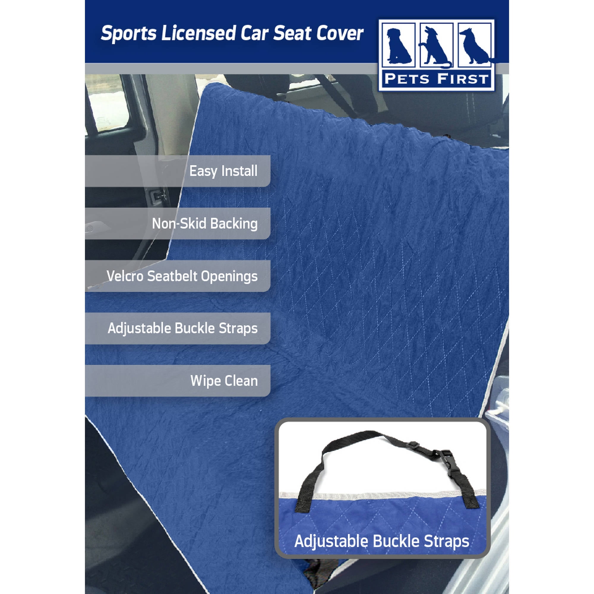 Pets First Officially NFL Licensed CAR SEAT COVER ARE YOU A SPORTS FAN?? DO YOU HAVE A CAR, TRUCK, VEHICLE, or SUV? If the answer is YES, then this is the Correct Product for you! This the ideal way to travel with your pet! Show your support for your favorite SPORTS TEAM with this elegant & comfy NFL CAR SEAT COVER! Features: A GIGANTIC satin applique embroidered TEAM LOGO for everyone to see your favorite team! A printed TEAM PATTERN & Dog Paws in vibrant team colors! Velcro slits for seat belts easy access & install. Adjustable straps to loop around your car’s head rests. Whether you are going to the game or just taking a drive, we’ve got you “COVERED”! This PET CAR SEAT PROTECTOR is licensed by the NFL Team! It is made using NEW & HIGH QUALITY materials to protect your vehicle from any spills, dirt, hair, scratches, fur, mud & other messes. Keep your car’s seats as good as NEW! This DOG CAR SEAT COVER is made with 3 Layers: ► Top Layer: Waterproof Faux quilted ultra-suede so your pet doesn’t skid around the vehicle. ► Filling Layer: Thick poly-filled for extra COMFORT! ► Back Layer: Nylon with NON SKID dots, so you are guaranteed DURABILITY, COMFORT & SATISFACTION! MACHINE WASHABLE cold on gentle cycle, Lay flat to dry. Size: Measures: 55 x 50 inches to FIT MOST VEHICLES! Another great pet product designed by PETS FIRST to keep your vehicle’s rear seats clean even with the dirtiest dog! TEAMS: This REAR SEAT COVER comes in all 29 NFL TEAMS: Arizona Cardinals, Atlanta Falcons, Baltimore Ravens, Buffalo Bills, Carolina Panthers, Chicago Bears, Cincinnati Bengals, Cleveland Browns, Dallas Cowboys, Denver Broncos, Detroit Lions, Green Bay Packers, Houston Texans, Indianapolis Colts, Jacksonville Jaguars, Kansas City Chiefs, Los Angeles Chargers, Los Angeles Rams, Miami Dolphins, Minnesota Vikings, New England Patriots, New Orleans Saints, New York Giants, New York Jets, Raiders, Philadelphia Eagles, Pittsburgh Steelers, San Francisco 49ers, Seattle Seahawks, Tampa Bay Buccaneers, Tennessee Titans, and Washington Redskins. Choose your team and click ADD TO CART NOW! Another great pet product designed by PETS FIRST! Pets First company has established itself as the largest sports-licensed pet product company in the country. Pets First has gained its reputation in providing every pet owner with premium licensed pet products; from unique and colorful apparel items to fun and playful toys and accessories. Working with the latest technology, our creative designers choose from the highest quality materials to provide durable, unique and innovative pet merchandise. Our factories follow the highest standards of safety guidelines to ensure your pet’s security, while providing a long lasting product. Licensed Pet Products by Pets First.