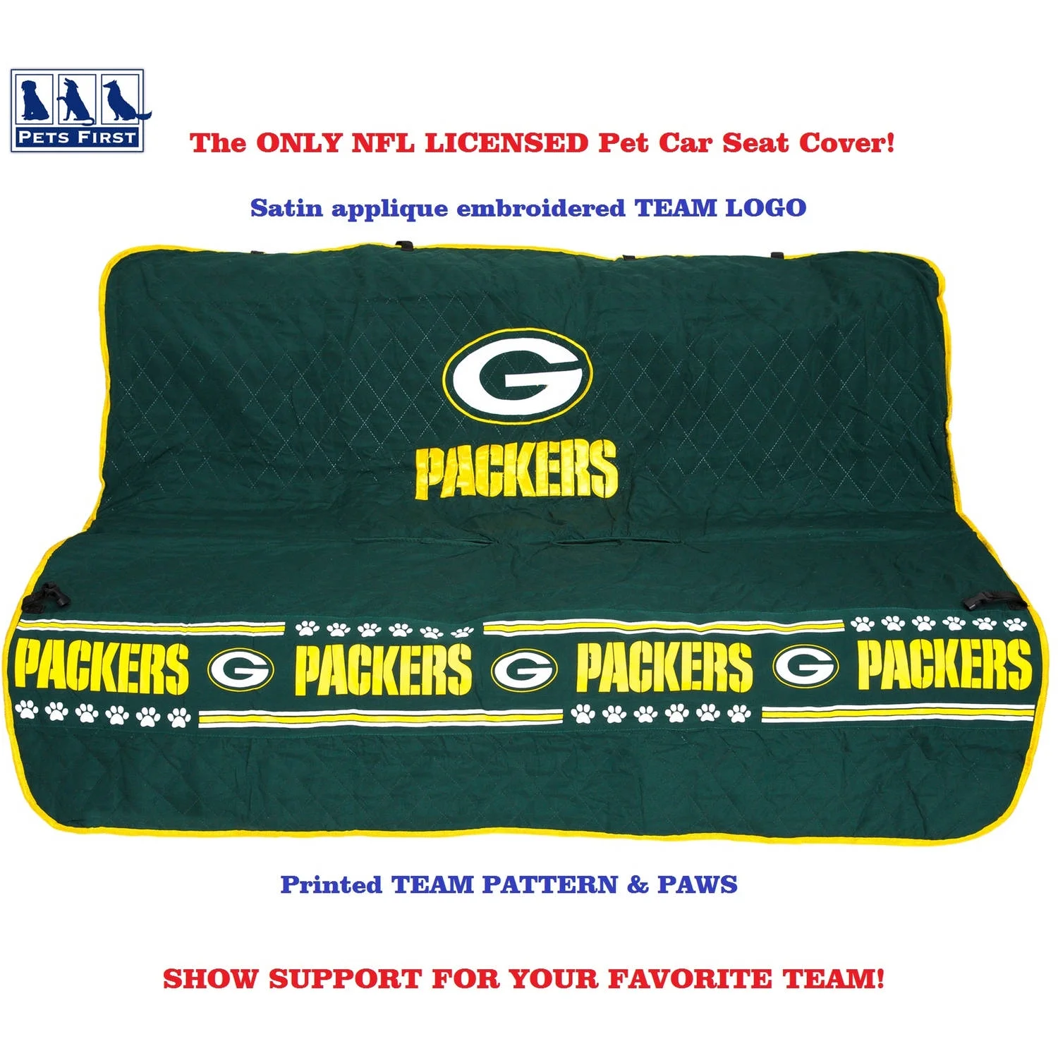 Pets First NFL Green Bay Packers Car Seat Cover: Official NFL Licensed Soft quilted ultra-suede loop Team logo embroidery Printed team band across the bottom Contrast trim Skid-proof material on bottom