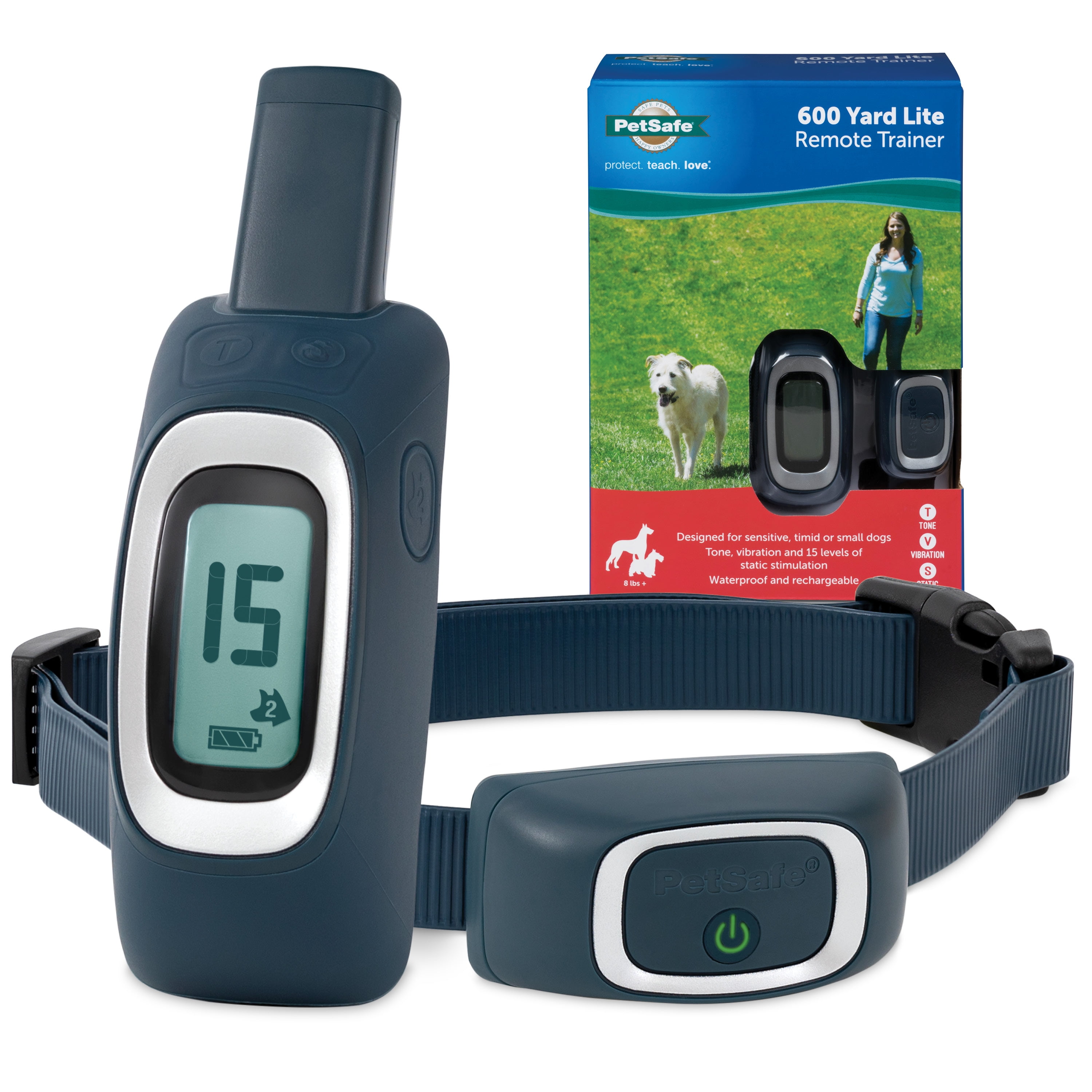 Created for dogs who love exploring the neighborhood, jogging the greenway and meeting new friends at the dog park, the 600 Yard Remote Trainer is a medium-range trainer for small to medium dogs. The 600-yard range (that’s basically a third of a mile) is perfect for giving your best friend freedom while still keeping in touch. The remote fits comfortably in the palm of your hand, and we specifically designed the buttons to be intuitive, so they’re easy to remember and right where you expect them to be. The backlit, large font display is easy to read any time of day or night. This training system is durable enough to survive even your most unpredictable adventures. The collar is ridged coated polyester (to keep slipping at bay), and the collar and remote are waterproof – perfect for spontaneous puddle jumping. Your pet deserves the best. Trust PetSafe to help keep your pet healthy, safe and happy.