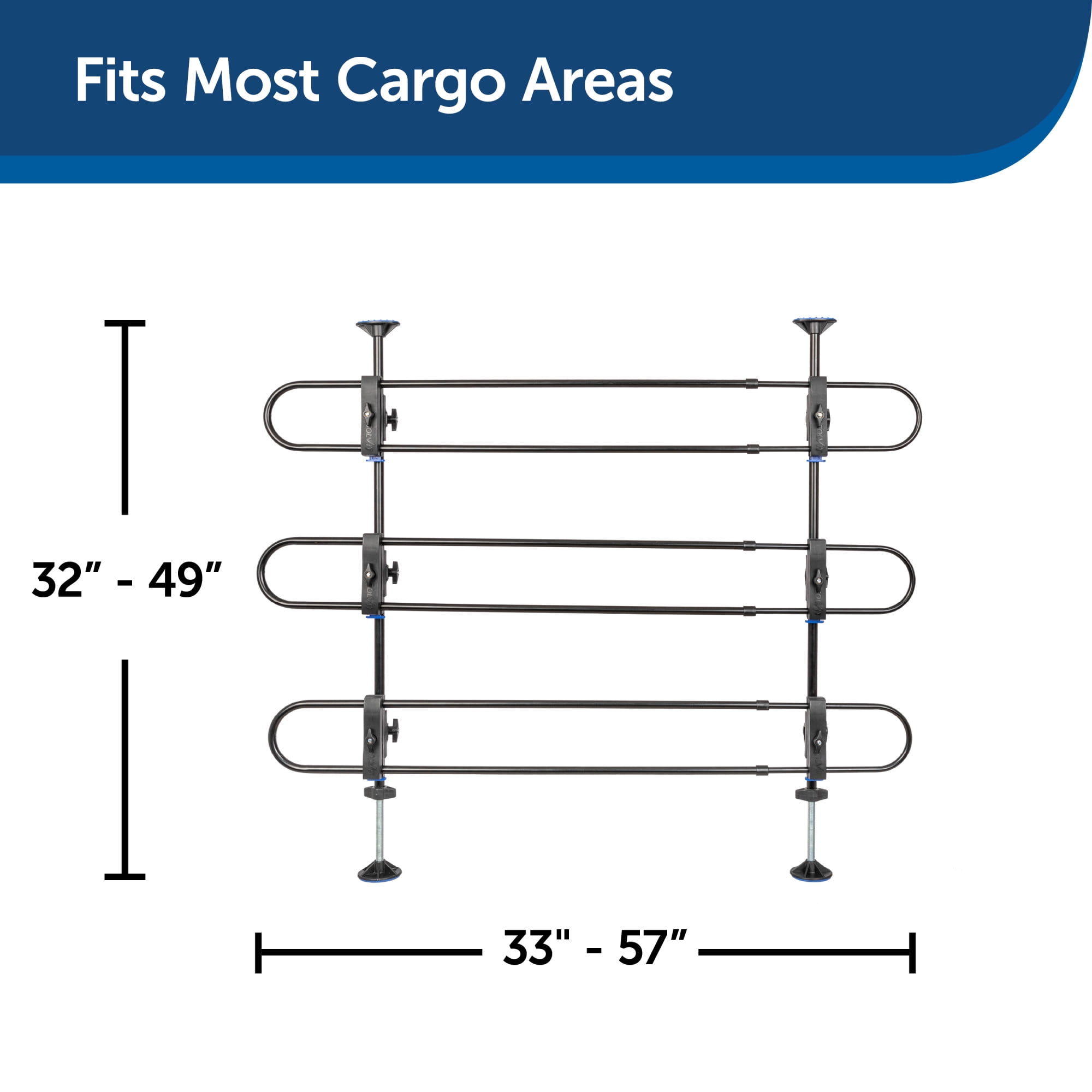 Decreased Driver Distraction – The metal dog barrier keeps your furry friend from inviting themselves into the passenger seats so you can focus on the road No Tools Needed – Easily assemble the metal barrier with just your hands Simple to Setup- Tension secures the barrier in place and rubberized caps keep it from slipping during use; rattle-free design of the metal barrier reduces noise on road trips Adjustable Sizing – Slide the dog barrier to adjust it to fit backseat or cargo areas in your car or SUV; measures 32-49 in W x 33-57 in H Back Seat Visibility – Sturdy, metal barrier allows you to have clear visibility into the back of your vehicle Simple to Store – When you are not using the barrier, it quickly disassembles so you can store it in the included storage pouch until your next adventure with your pup