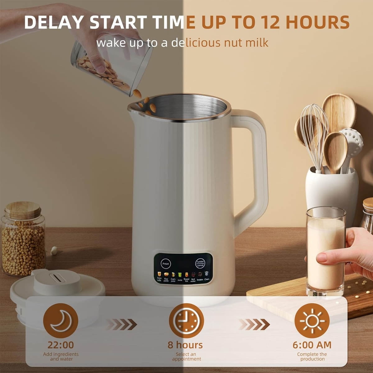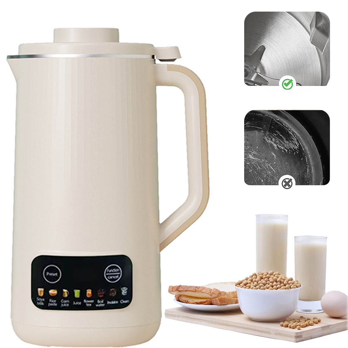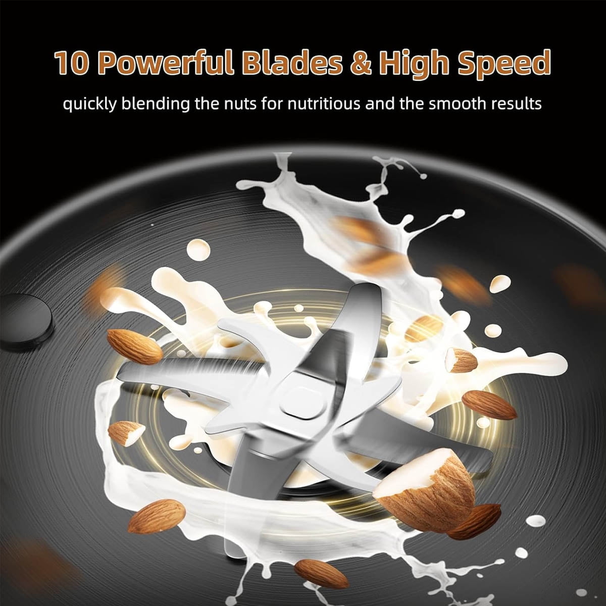 ????【Plant-Based Milk Maker】This versatile maker can quickly create smooth, creamy plant-based milk, juice, smoothies, and hot chocolate by crushing nuts, grains, and seeds in minutes. Perfect for making different homemade beverages to suit your taste. ⚙️【Upgraded 10-Blade 3D Design】With 10 stainless steel x-cross blades and a built-in quadrilateral stirring column, the ingredients collide repeatedly, ensuring thorough processing while preserving nutrients and delivering a smooth, rich taste. ????【Easy to Use & Wide Range of Functions】Featuring 9 functions, this machine skips the soaking process for easy plant-based milk preparation. Room Temp (special for chilled nut milk), Cold (104℉), Warm (122℉), and Hot (140℉) are for making warm beverages like oat milk. Boil (212℉) is used for soy milk and rice milk. It also includes functions like auto clean (120s), Boil Water, Keep Warm, and a Timer (up to 12 hours). ????【Smart LED Screen Design】The smart LED screen offers precise temperature and timer control, helping you create the perfect nut milk consistency. To ensure safe operation, align the lid’s protruding part with the handle to avoid E2 errors and maintain optimal performance. ????️【User-Friendly Design】The intuitive touchscreen interface allows easy operation. Whether you’re a novice or experienced cook, simply select your function and start with one touch.