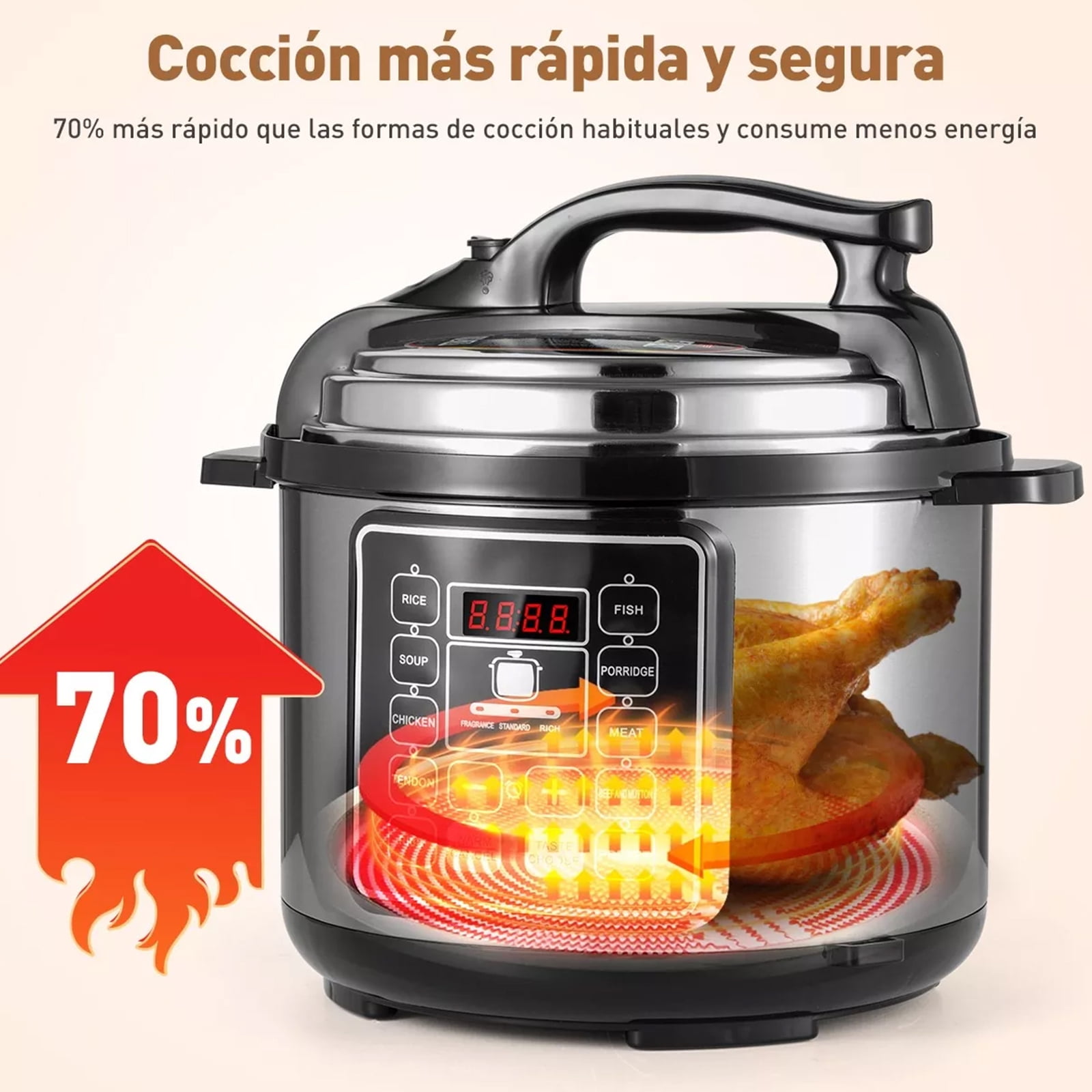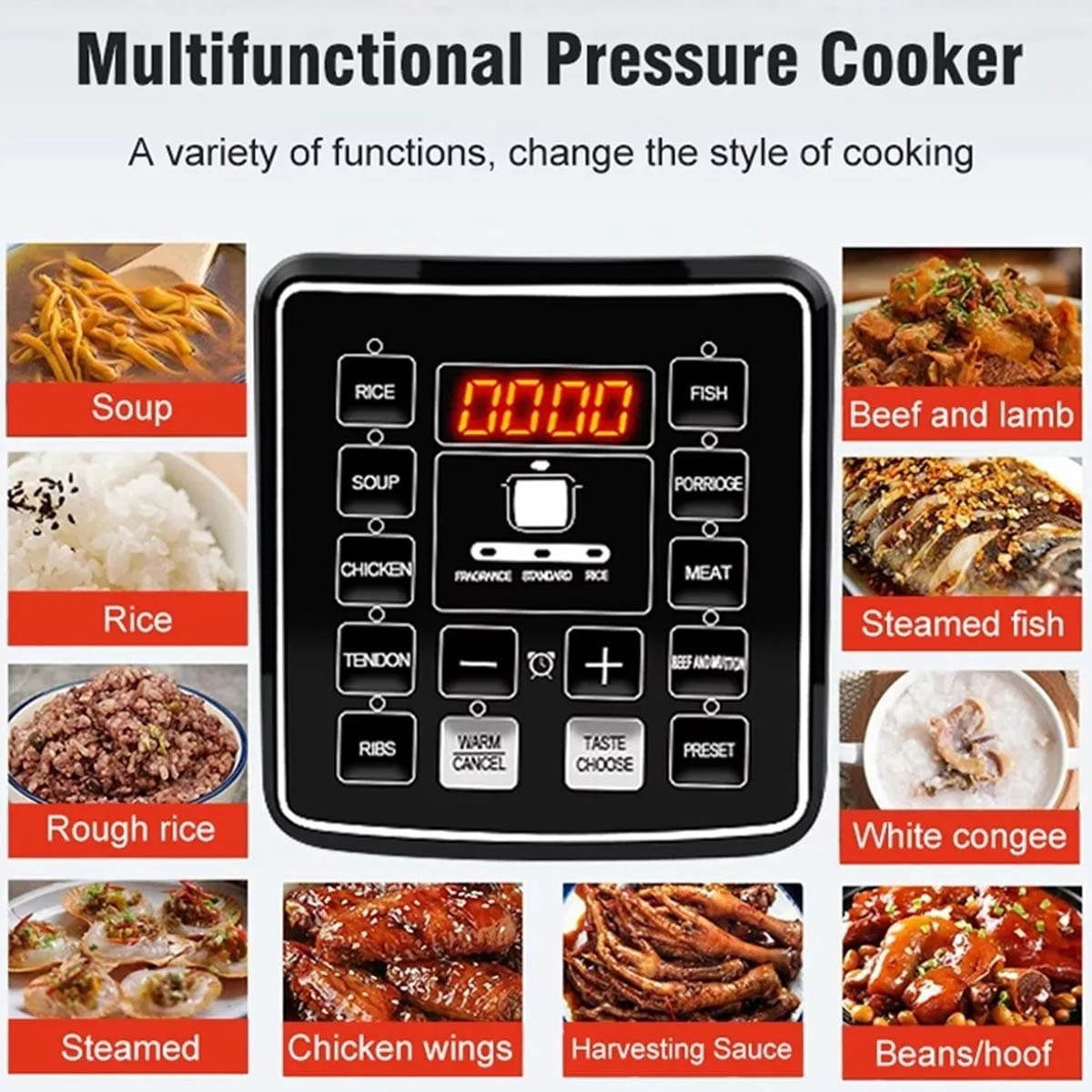 ???? It is equipped with 15 custom intelligent programs. Whether it is the tenderness of stewed ribs, the deliciousness of soup, or the softness of rice, it can be done with one click, and the deliciousness does not wait. ????Touch screen design, DIY mode can be adjusted freely, with real-time progress bar display, the cooking status is clear at a glance. ????5L large capacity, easy to cook up to 10 cups of rice, family gatherings can also be handled calmly, and delicious sharing is uninterrupted. ????Made of high-quality alloy aluminum + stainless steel, the liner is thickened and non-stick, with uniform heat conduction, locking the original flavor of the ingredients, making every bite fragrant and soft. ????Six-fold safety protection system, all-round guarantee of safety, whether it is overpressure, overtemperature or dry burning, it can automatically respond. ????The split power cord is easy to store, the non-slip pad on the bottom is stable and durable, and the reservation timing function allows free control of cooking time.