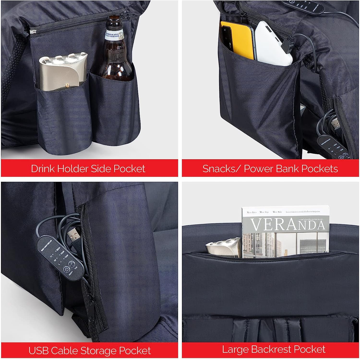 BACK&BOTTOM USB-POWERED HEATING WARM: 3 level (131℉/113℉/108℉) adjustable heating system keeps you warm outside. All you have to do is push a button and your seat can get up to 131 degrees Fahrenheit. DO NOT come with a USB battery but works with any and will last for hours. 25-INCH EXTRA WIDE: Study steel frame and enlarged width gives more elbow room and thick padding for an adult size. Armrest could be unfolded to extend seating space. Back support and cushioned comfort make it ideal for any outdoor events, beaches, parks, patios, picnics, camping or even fishing trips. 5 RECLINING POSITION & ANTI-SLIP BASE: 5 adjustable seat position and high-density foam cushion offer home-like comfort like in your couch. Water resistant bottom keeps you dry and neat. Under-seat strap and buckle help secure to most bleachers and allow you to cheer on your favorite team without worries behind. LIGHTWEIGHT & PORTABLE: Folding design and attached straps make it easy to carry from your car to the game. Weighs only 7.7 pounds each. What’s more, it features a carrying bag for decent transportation and easy storage. DURABLE & STURDY: Made of steel frame and 420D water-resistant polyester seat cover, it’s durable and perfect for any outdoor events, sporting events, beach, park, patio, picnic, camping or even fishing trips. Pocket and cup holder keep all your snacks and belongings organized and in arm’s reach. Left pocket could be removed with a zipper.