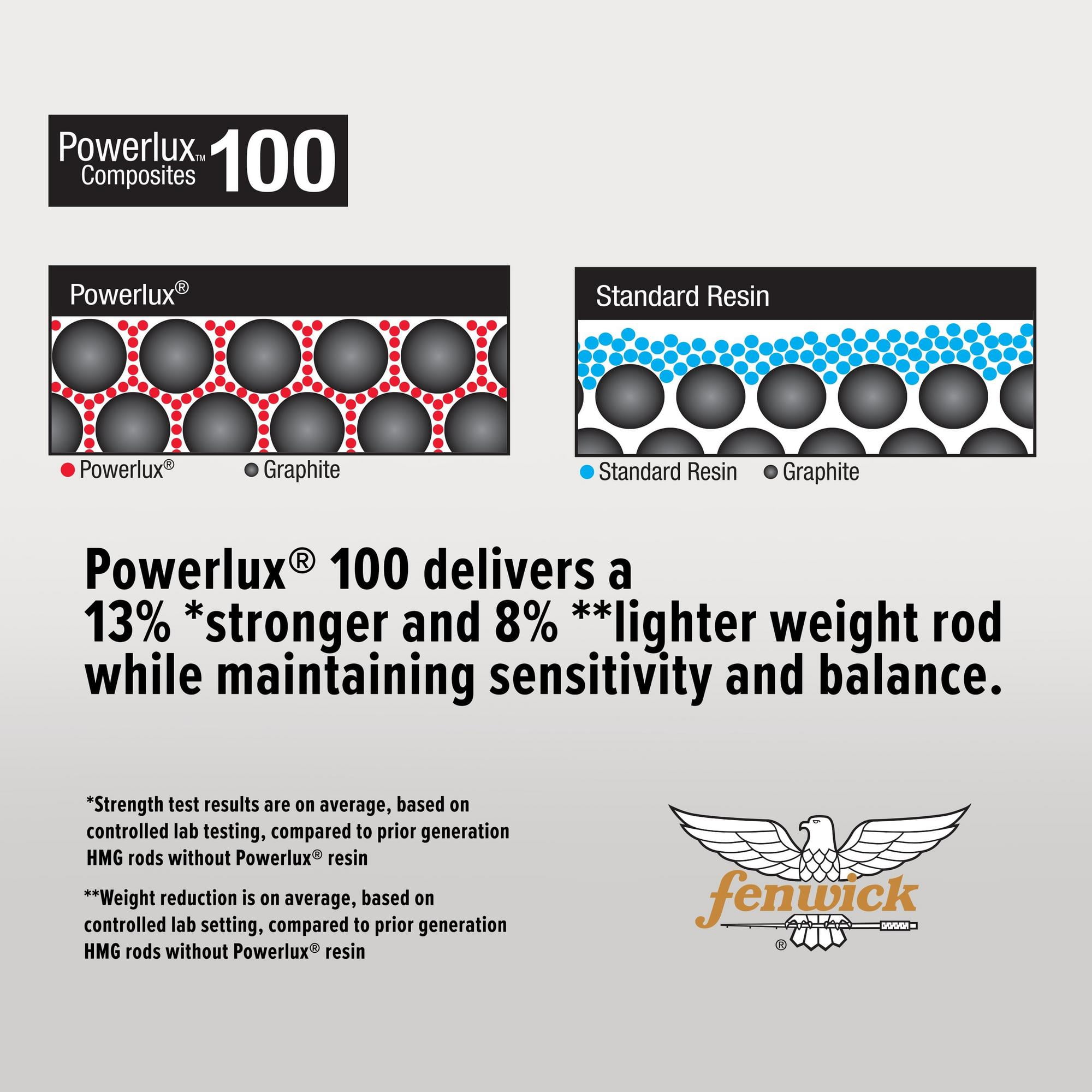 Powerlux® 100 delivers a 13% *stronger and 8% **lighter weight rod while maintaining sensitivity and balance Fenwick® custom ergonomic reel seat Premium grade cork handles Stainless steel guides with zirconium inserts 9 Stainless Steel bearings + 1 roller bearing Machined aluminum gear Magnesium body Machined aluminum handle Carbon rotor Braid ready spool Carbon drag system Limited 5-year rod warranty *Strength test results are on average, based on controlled lab testing, compared to prior generation HMG rods without Powerlux® resin **Weight reduction is on average, based on controlled lab setting, compared to prior generation HMG rods without Powerlux® resin Results may vary.