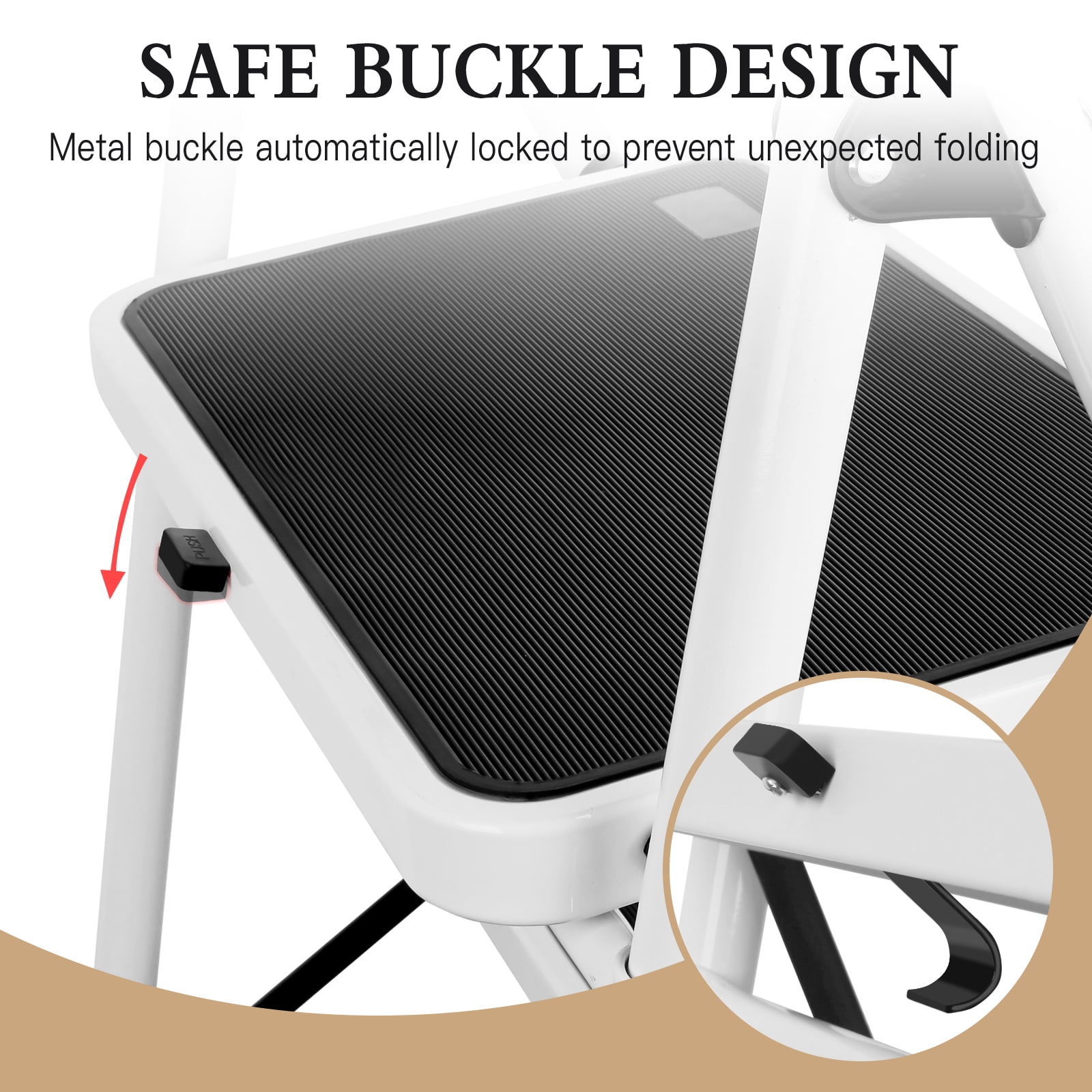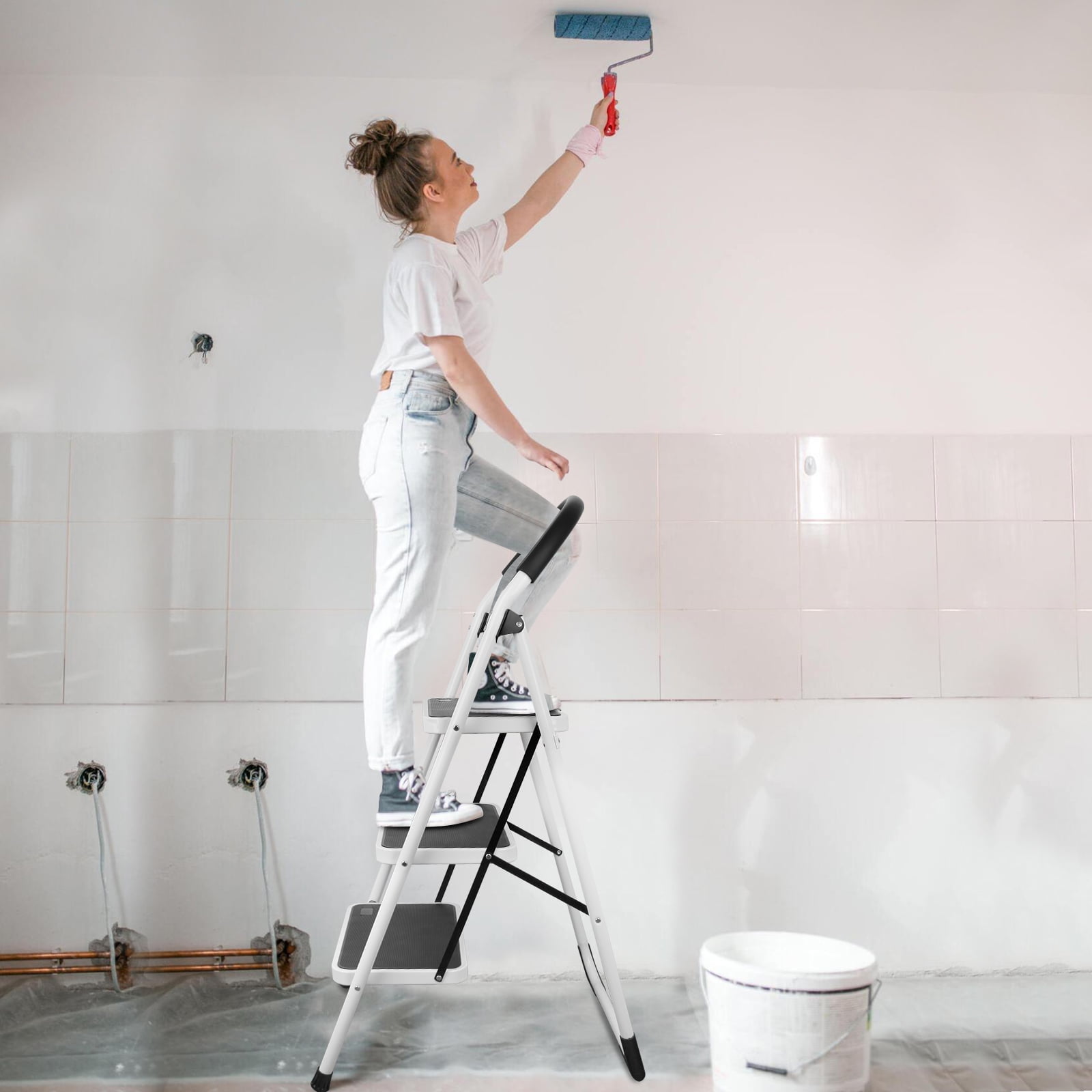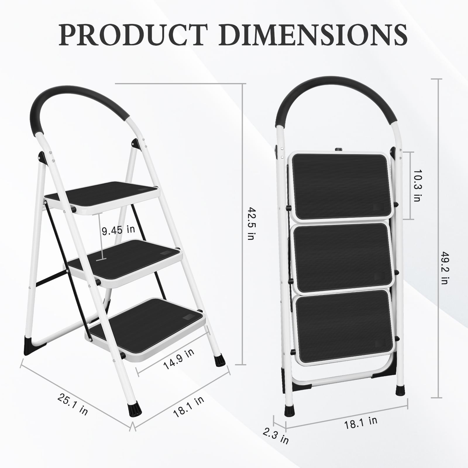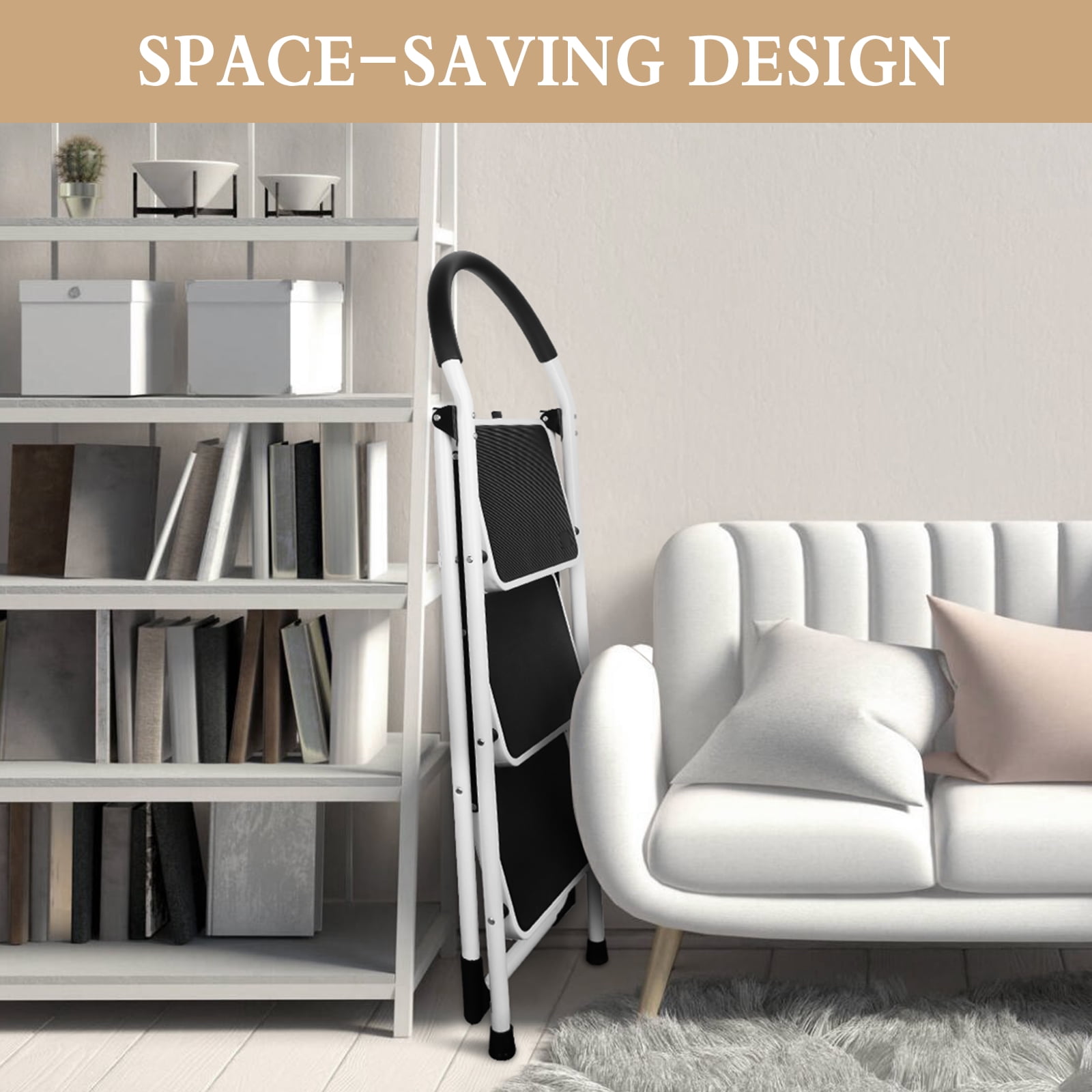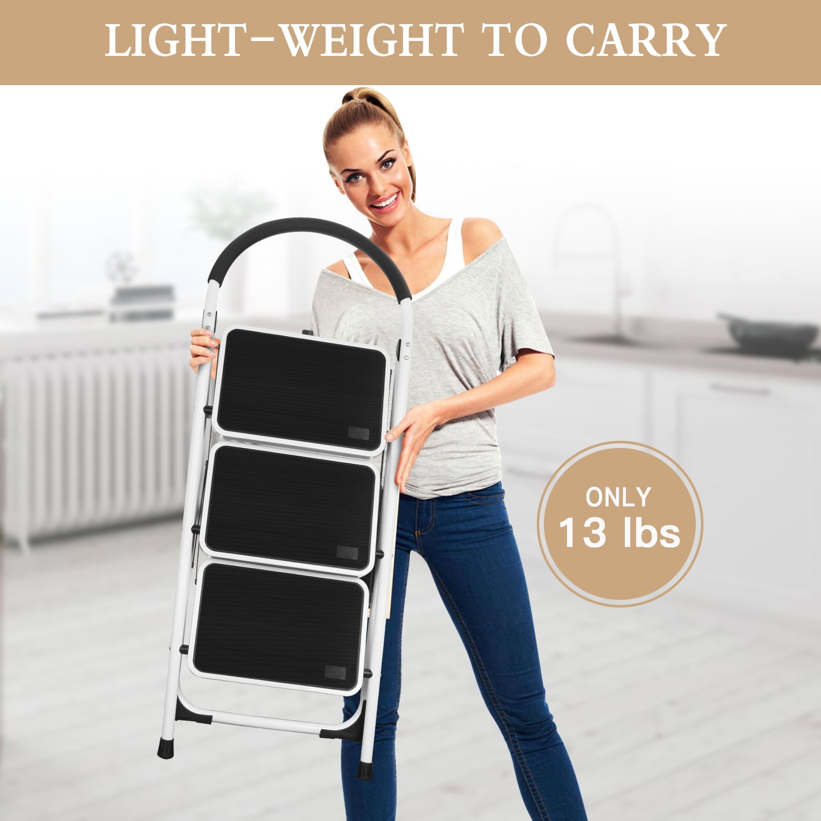 PHANCIR Folding 3-Step Stool, New Anti-Slip Step Stool, Portable Sturdy Step Ladder for Home, White. The 3-step ladder weighs 13.2 lbs with a maximum load capacity of 330 lbs sturdy and practical tool for various tasks. Its portability and space-saving design make it convenient for both indoor and outdoor use. The high-quality metal and stability provided by its design and the anti-skid pads ensures safety, making it suitable for a wide range of activities around the house or workplace.