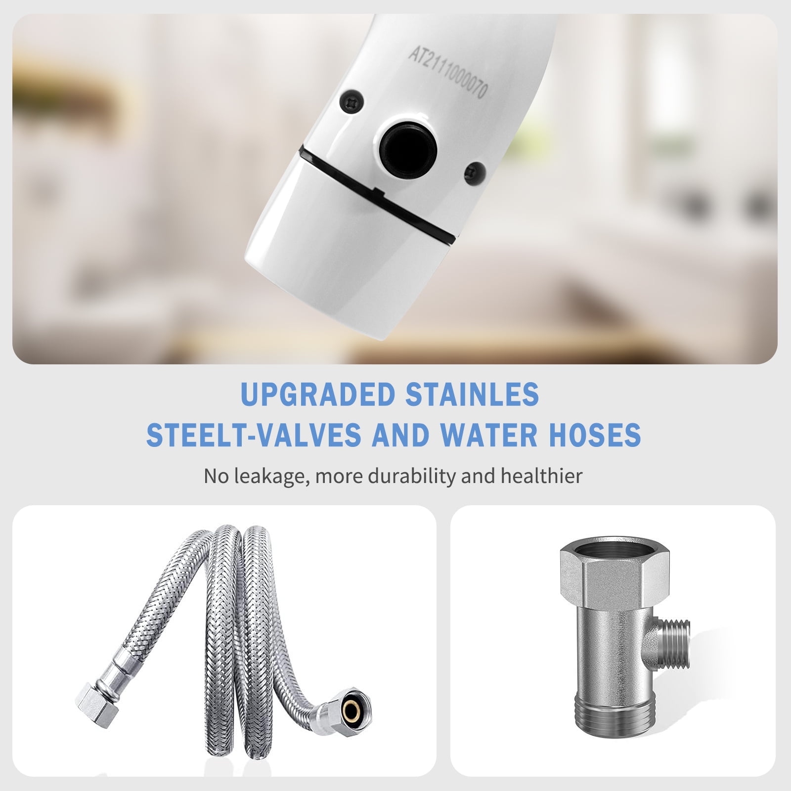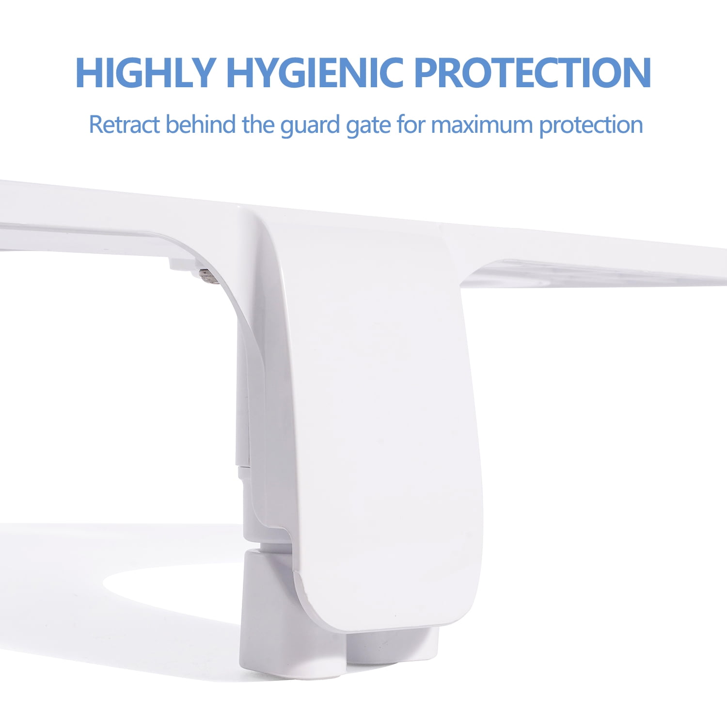 Two Wash Modes: The rear wash has a strong flow towards the back, and the feminine wash provides a gentler flow towards the front. The feminine wash is particularly useful during monthly cycles and for new or expecting mothers. Premium Quality: The Bidet is made of durable White ABS Material, with a One-piece design control panel, high-pressure quality valves, brass T-adapter, and a braided steel cold water hose for durability. Highly Hygienic Protection: The self-cleaning feature thoroughly cleans the nozzles, and they retract behind the guard gate for maximum protection and easy maintenance. Ultra-Slim and Compatible: The bidet sprayer is only a quarter-inch thick, providing support, maintaining the toilet seat level, and fitting comfortably with standard toilets. Adjustable Water Pressure: The water-pressure control knob allows you to adjust the water pressure for a comfortable experience. It’s suitable for all ages, including the elderly and children. Easy Home Upgrade: Transform your home with a “Smart” Bidet in seconds, adding a touch of luxury to your bathroom. Easy Installation: Simple and detailed installation instructions are provided. It can be easily installed in minutes without the need for a plumber. What’s in the Box? Includes 1 Bidet, 1 stainless steel braided hose (24.8 inches), 1 stainless steel T-adapter, 1 Teflon tape, and installation instructions. 12-Month Warranty: We offer a 12-month warranty and are dedicated to ensuring 100% satisfaction. Feel free to reach out if you have any concerns or issues with the product. Specifications: -Materials: ABS -Assembled Size: 17.7″ x 0.2″ x 7.5″ -Package Size: 17.72″ x 3.54″ x 7.68″ -Product Weight: 0.8 lb -Package Weight: 1.54 lbs