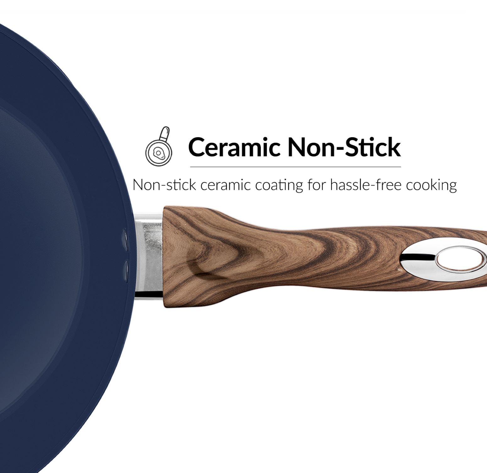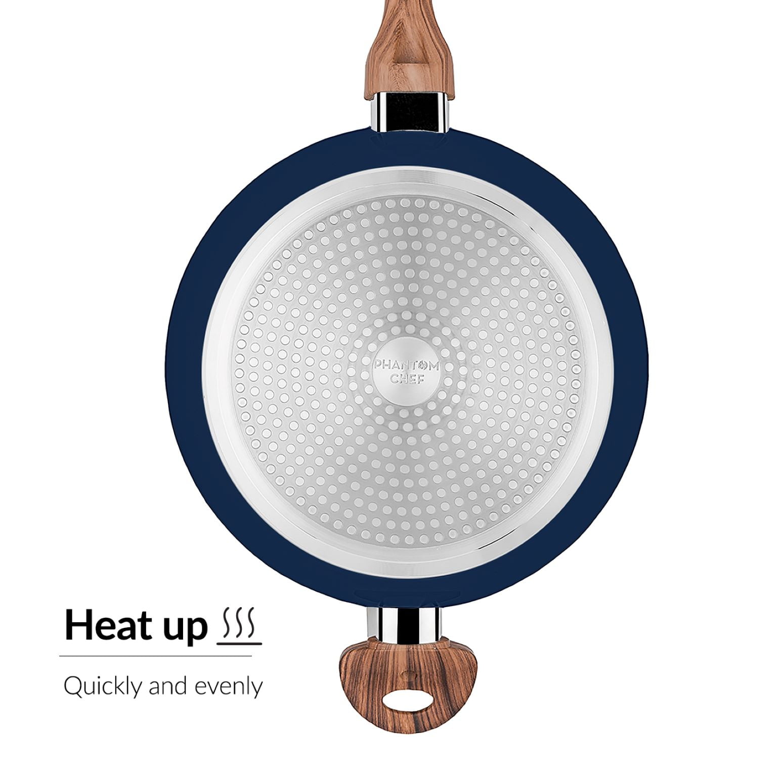 Phantom Chef 11 inch Deep Fry Pan With Lid – Non Stick – Wood Handle and Aluminum Body – Navy
