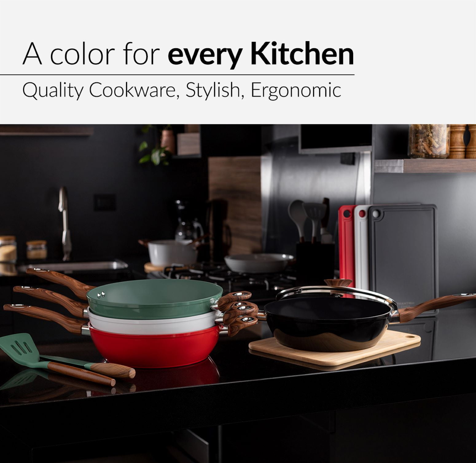 Features Available in Red, Grey, Green, Black and Navy Non-Stick Ceramic Coating Non-Toxic – PFOA & PTFE Free Aluminum Body Bakelite ‘stay cool’ handle Dishwasher Safe Compatible with all stove tops; gas, induction, electric, halogen, and ceramic