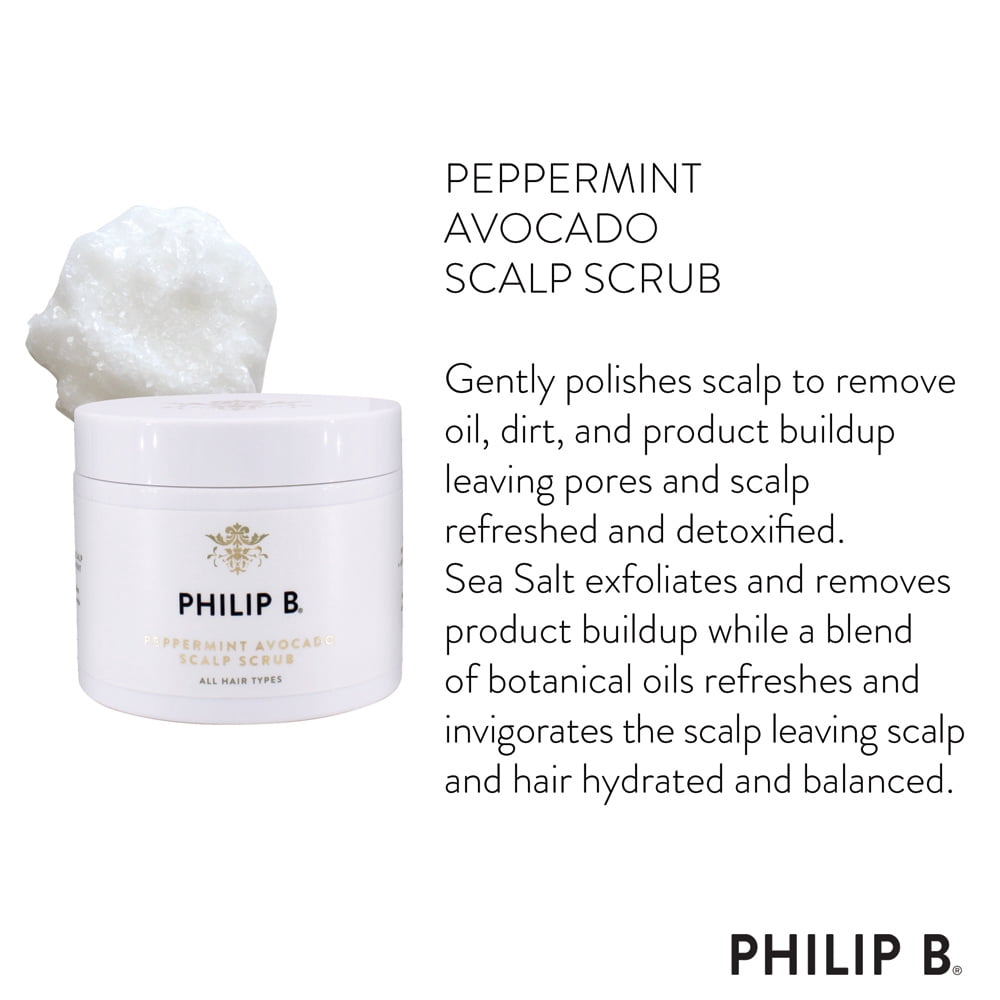 PHILIP B Peppermint Avocado Exfoliating Scalp Scrub, 8 oz Sea Salt, a natural exfoliant, eliminates and promotes healthy circulation. Avocado, Peppermint and Eucalyptus Oils create a tingly-cool sensation. Invigorating your scalp and senses. Arnica Flower Extract and Witch Hazel Water soothes, balances and energizes scalp. Aloe Leaf Juice hydrates, nourishes and softens hair.