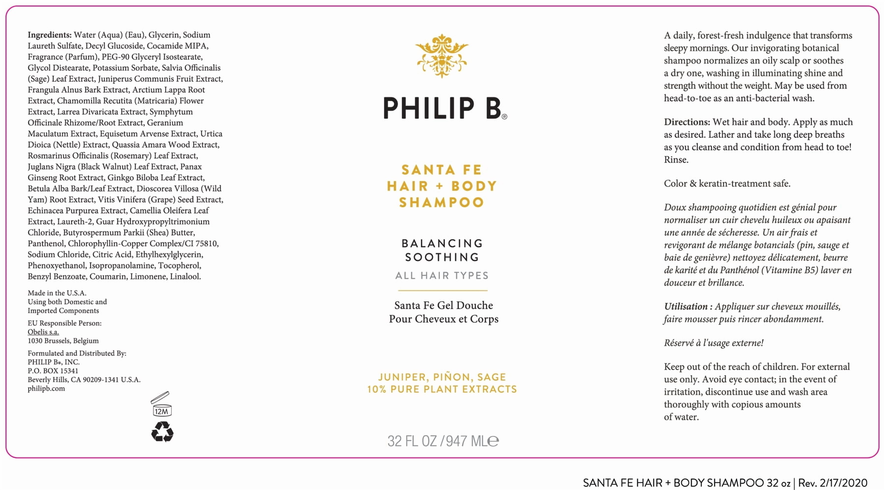 Philip B Santa Fe Hair Plus Body Balancing Soothing Shampoo, 11.8 fl oz